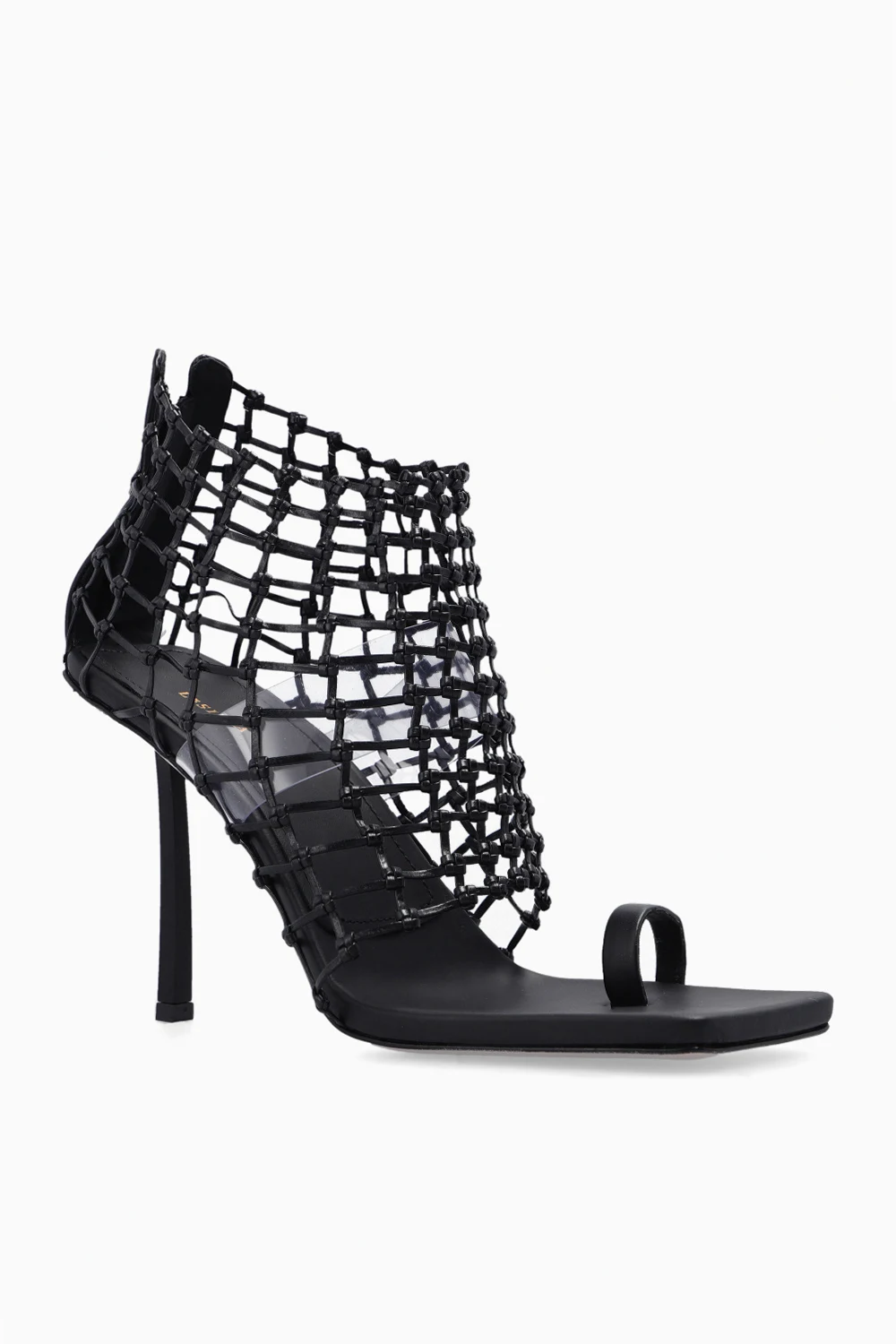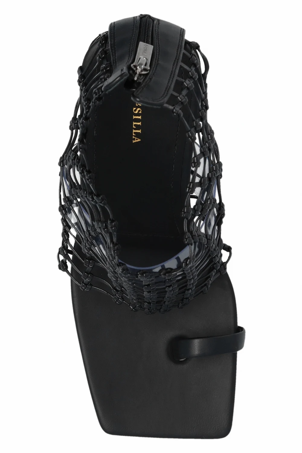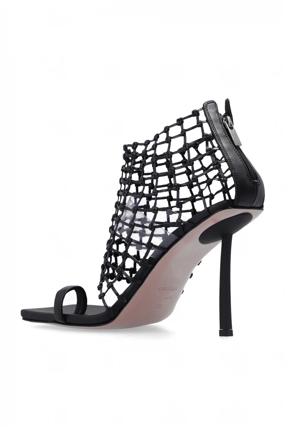 Czarne, transparentne sandały na obcasie, model ‘Vanessa’ Le Silla. Wykonane z plecionej skóry. Zapinane z tyłu na zamek. Kwadratowy nosek. Wewnątrz biały, transparentny pasek. Beżowa podeszwa wykonana ze skóry i gumy.