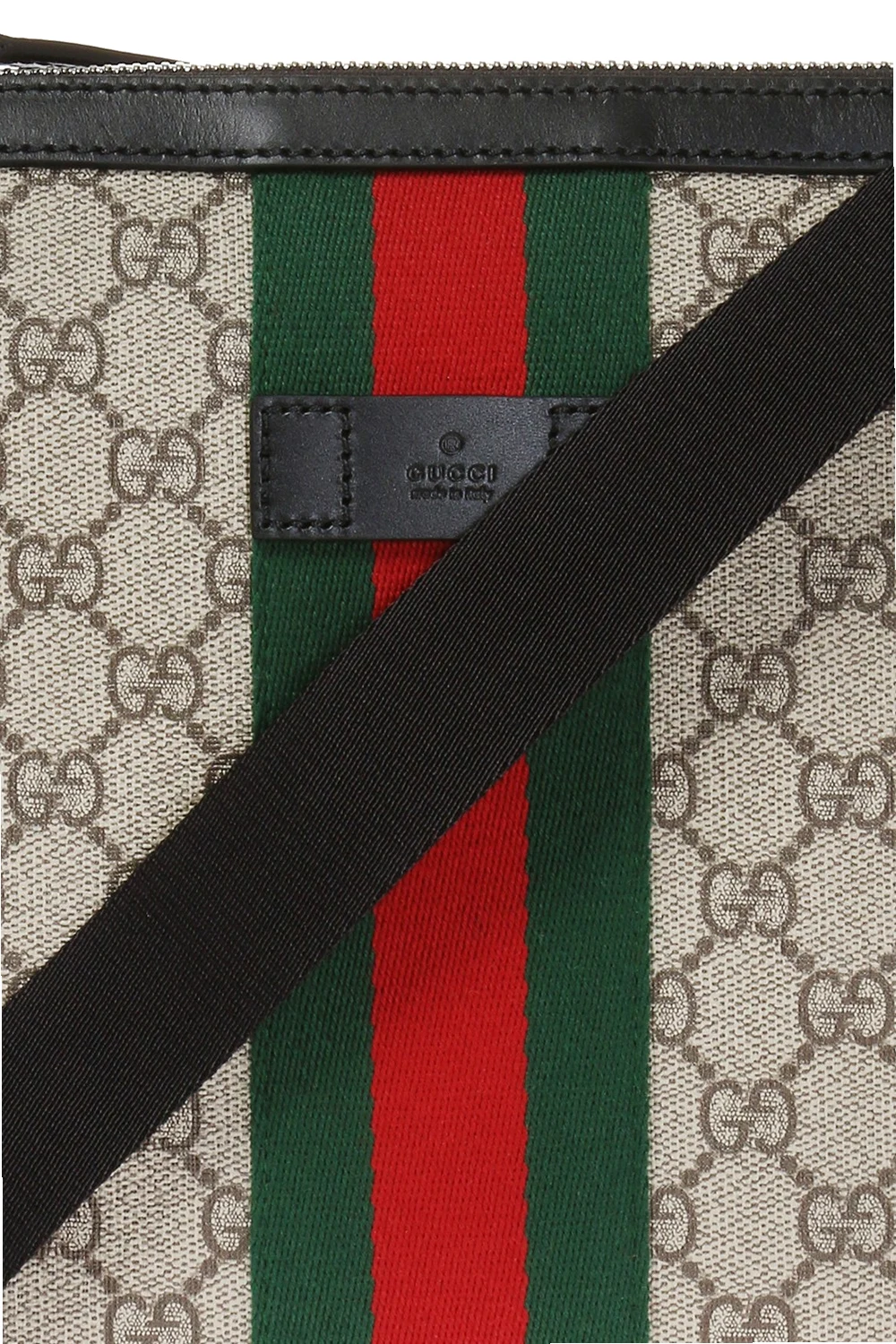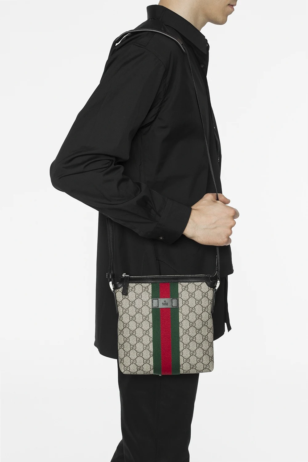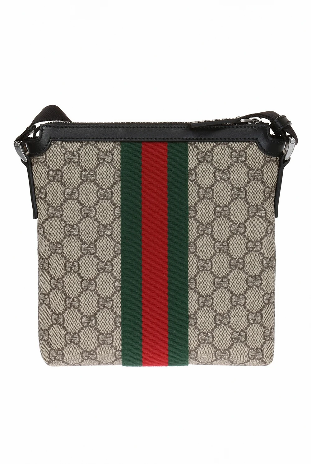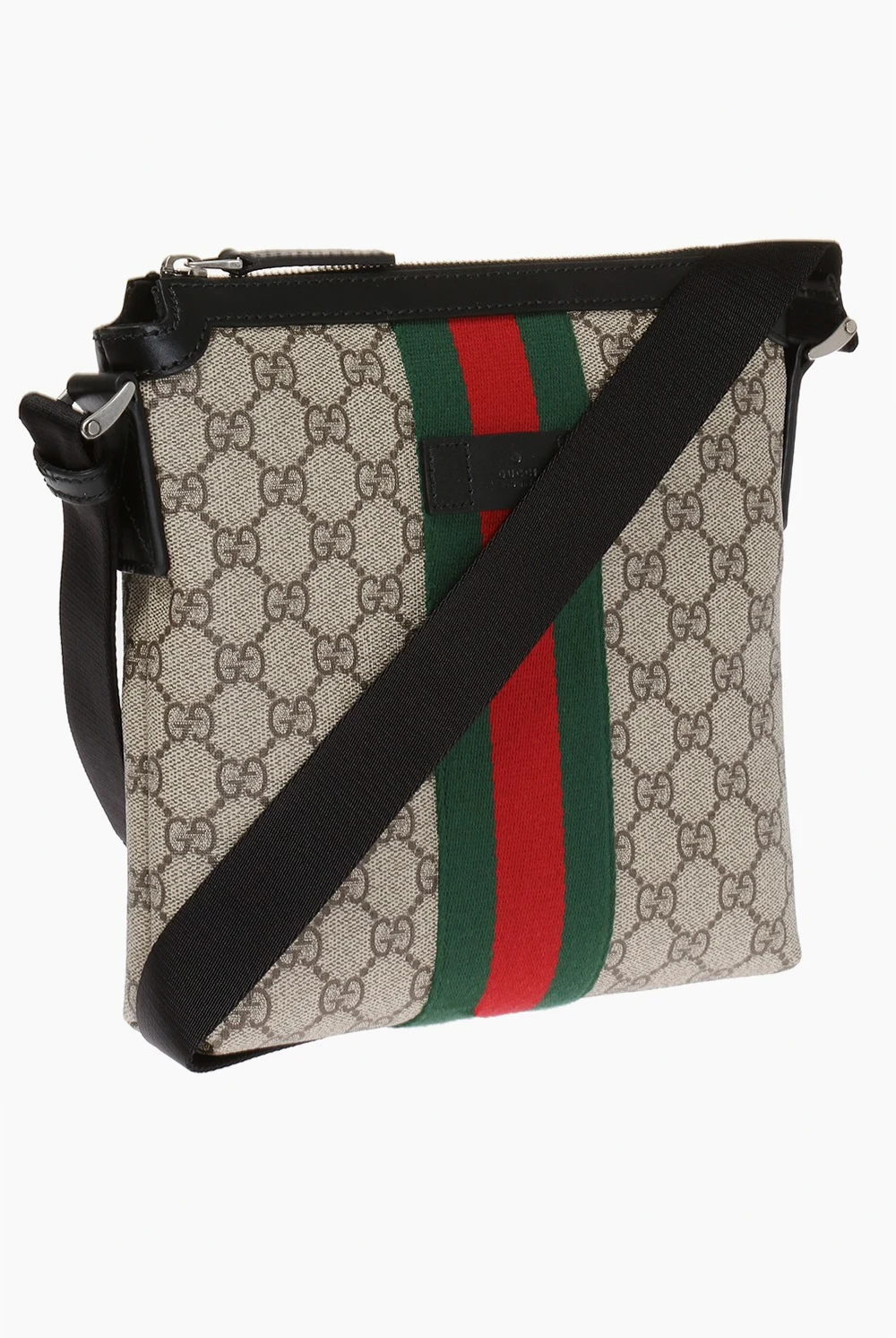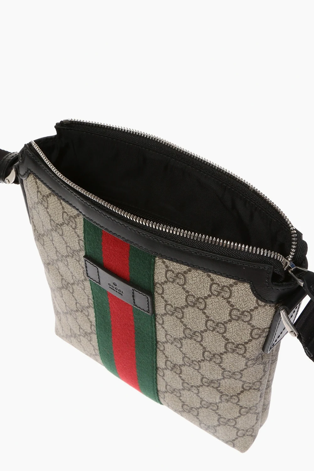Beżowo-brązowa torba na ramię Gucci. Wykonana z płótna 'GG Supreme'. Wykończona skórą w kolorze czarnym. Zamykana na zamek ze skórzanym frędzlem. Ozdobiona charakterystycznym dla marki zielono-czerwono-zielonym paskiem 'Web'. Z przodu wstawka z wytłoczonym logo. Pasek na ramię z możliwością regulacji długości. Warstwa wewnętrzna w kolorze czarnym. Wewnątrz komora, kieszeń zamykana na zamek i dwa miejsca na karty. Metalowe wykończenie w kolorze postarzanego srebra.