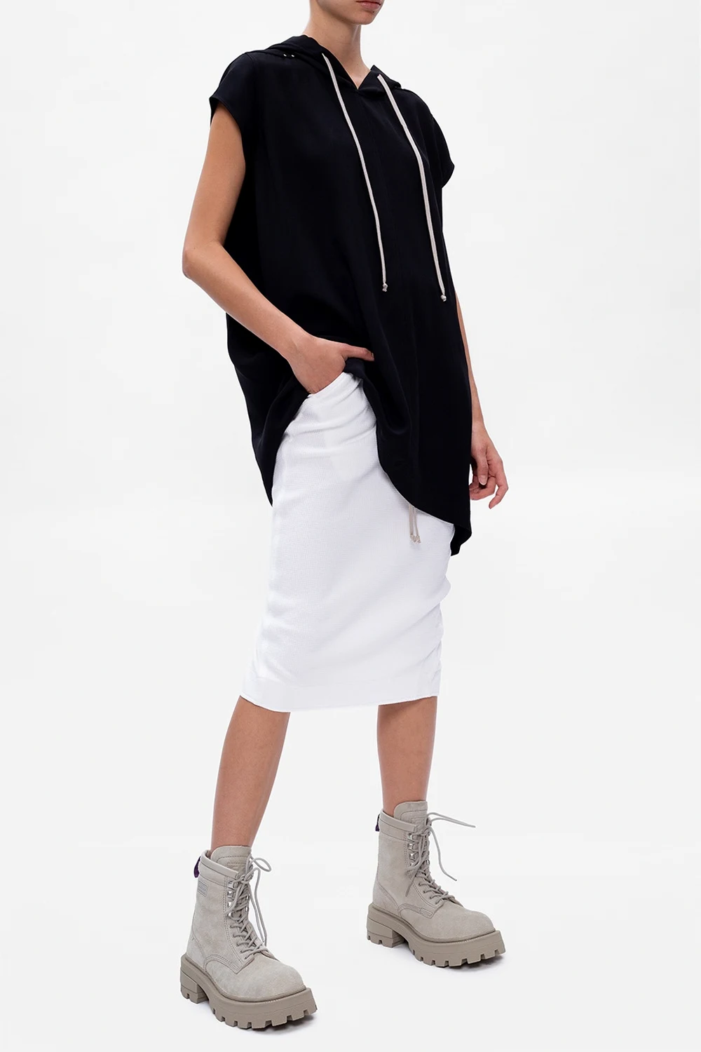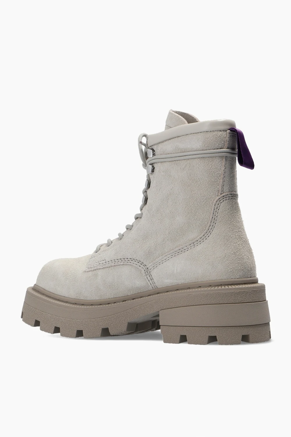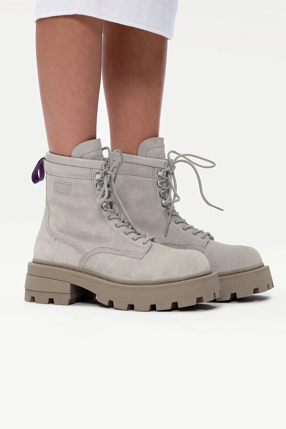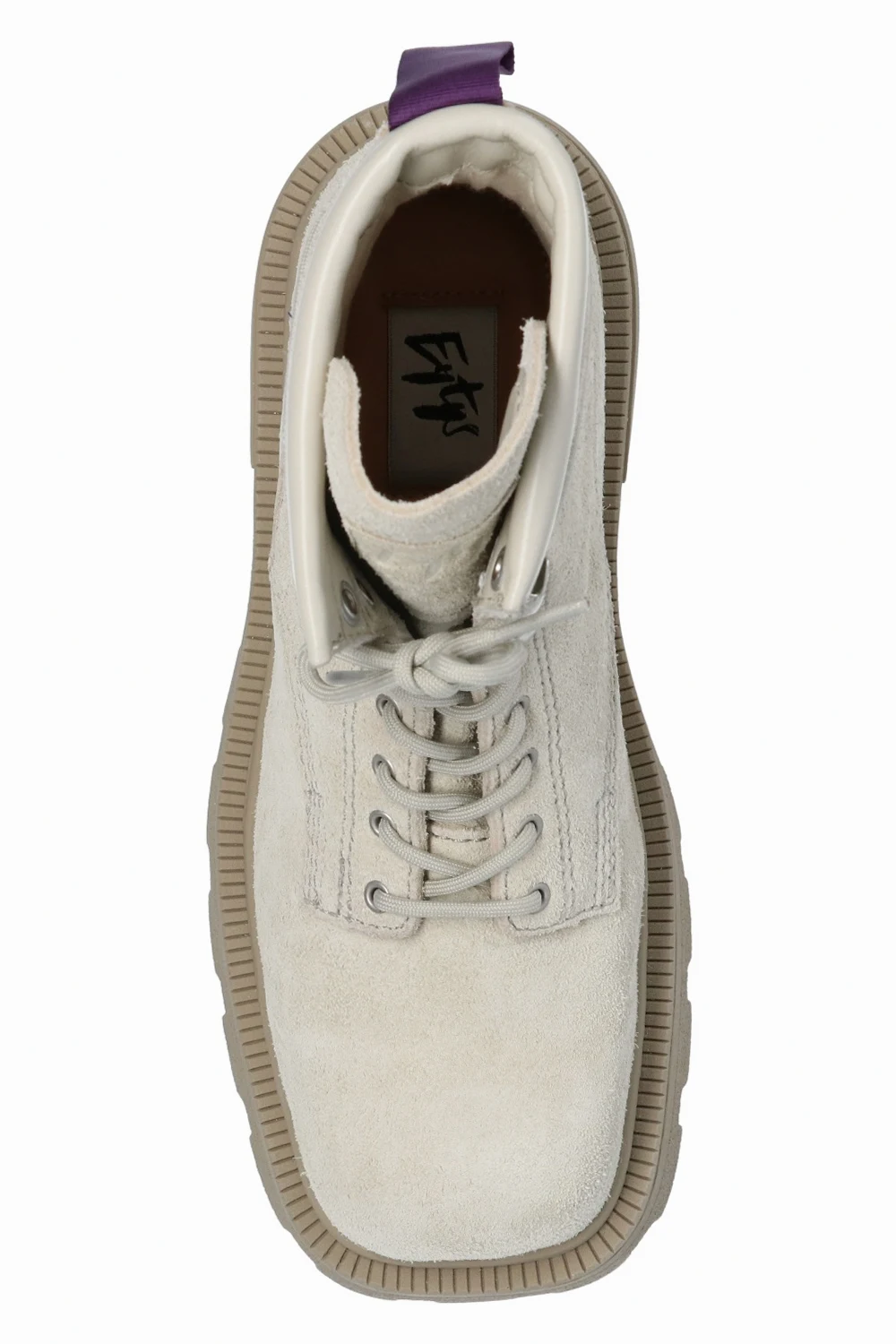 Beżowe, sznurowane trapery na platformie, model ‘Michigan’ Eytys. Wykonane z zamszu. Z tyłu charakterystyczny dla marki rypsowy pasek w kolorze fioletowym. Beżowa, gumowa podeszwa.
