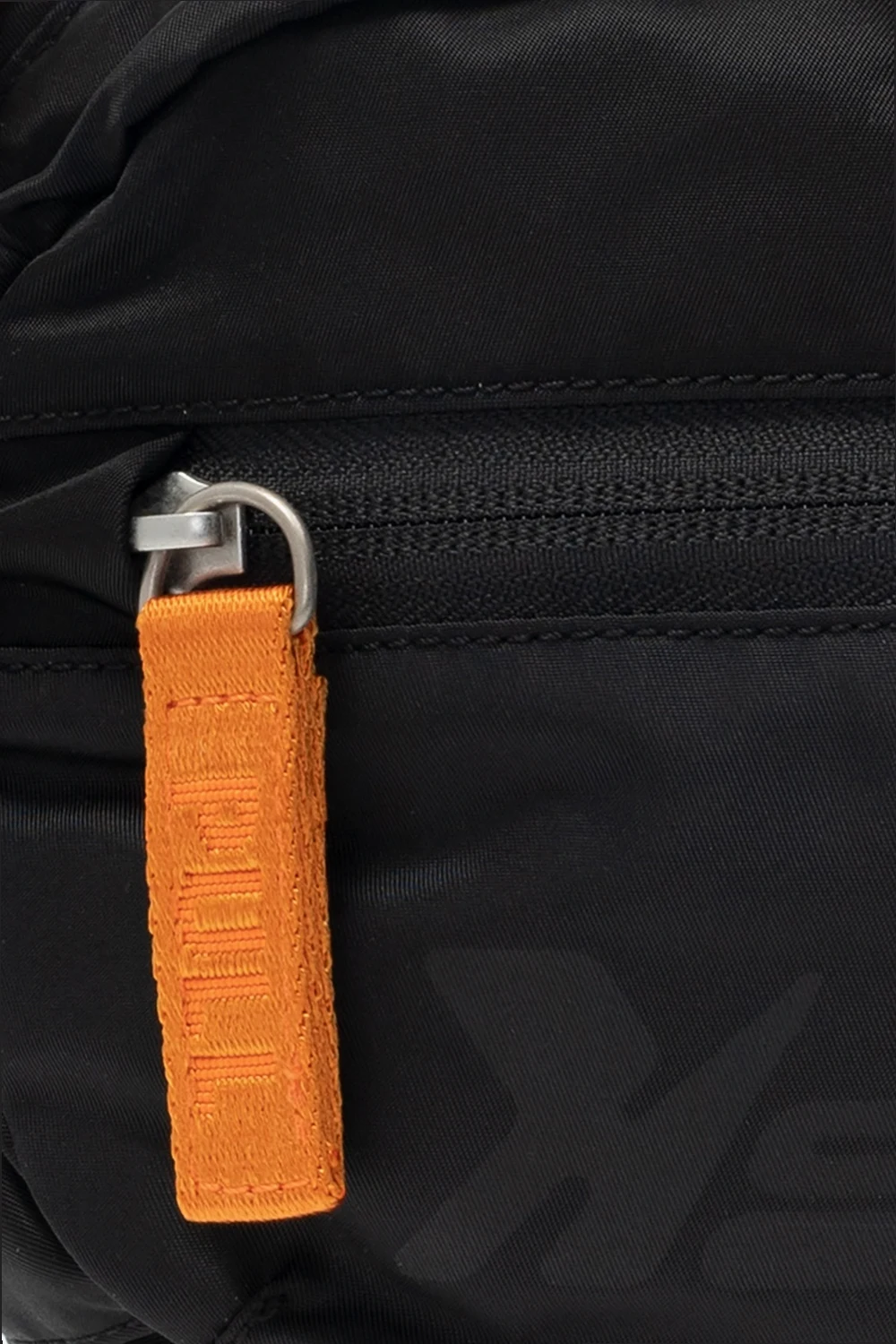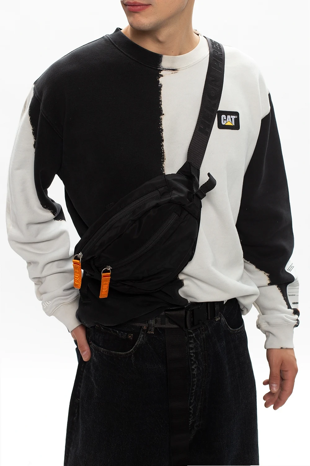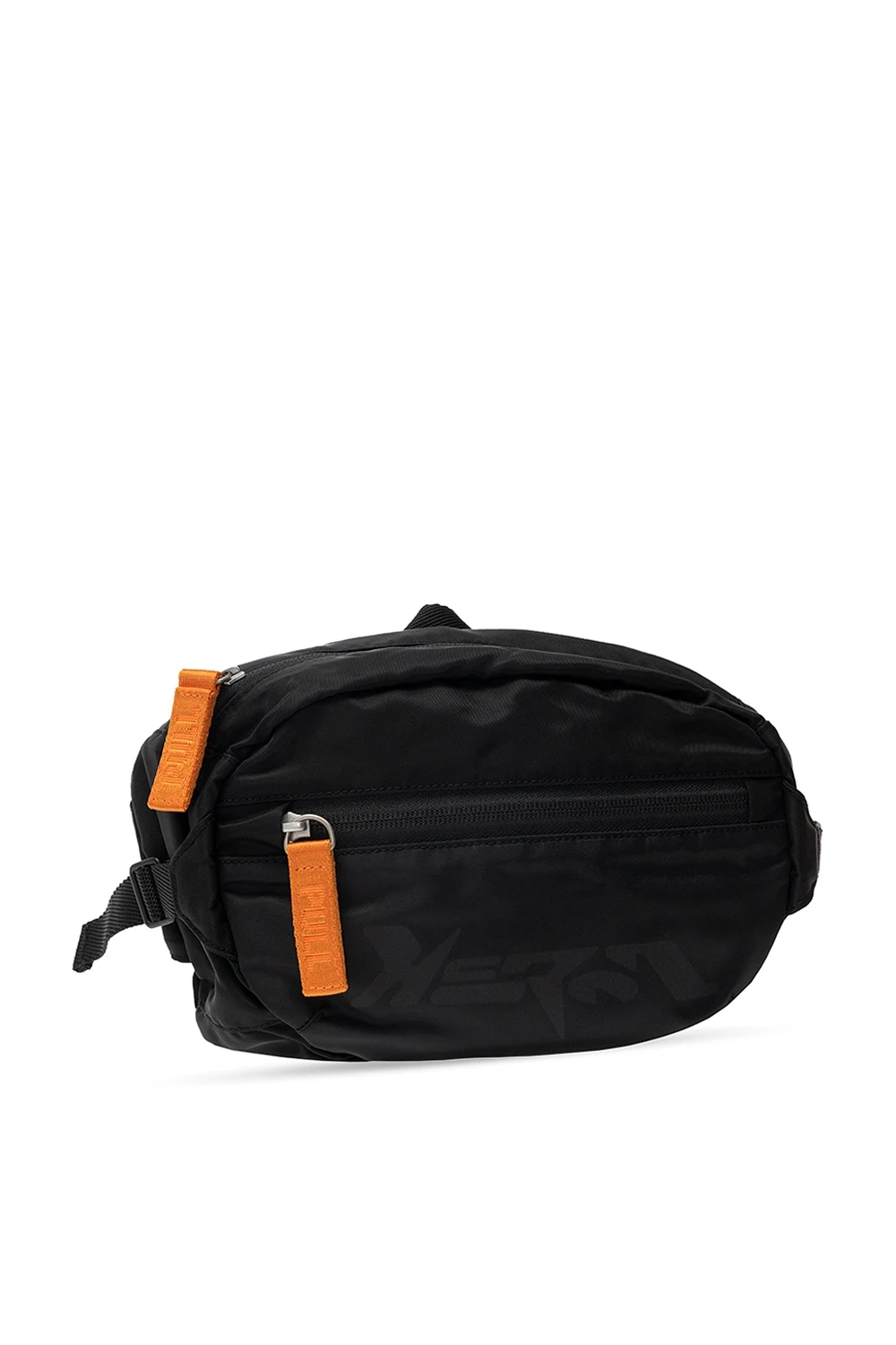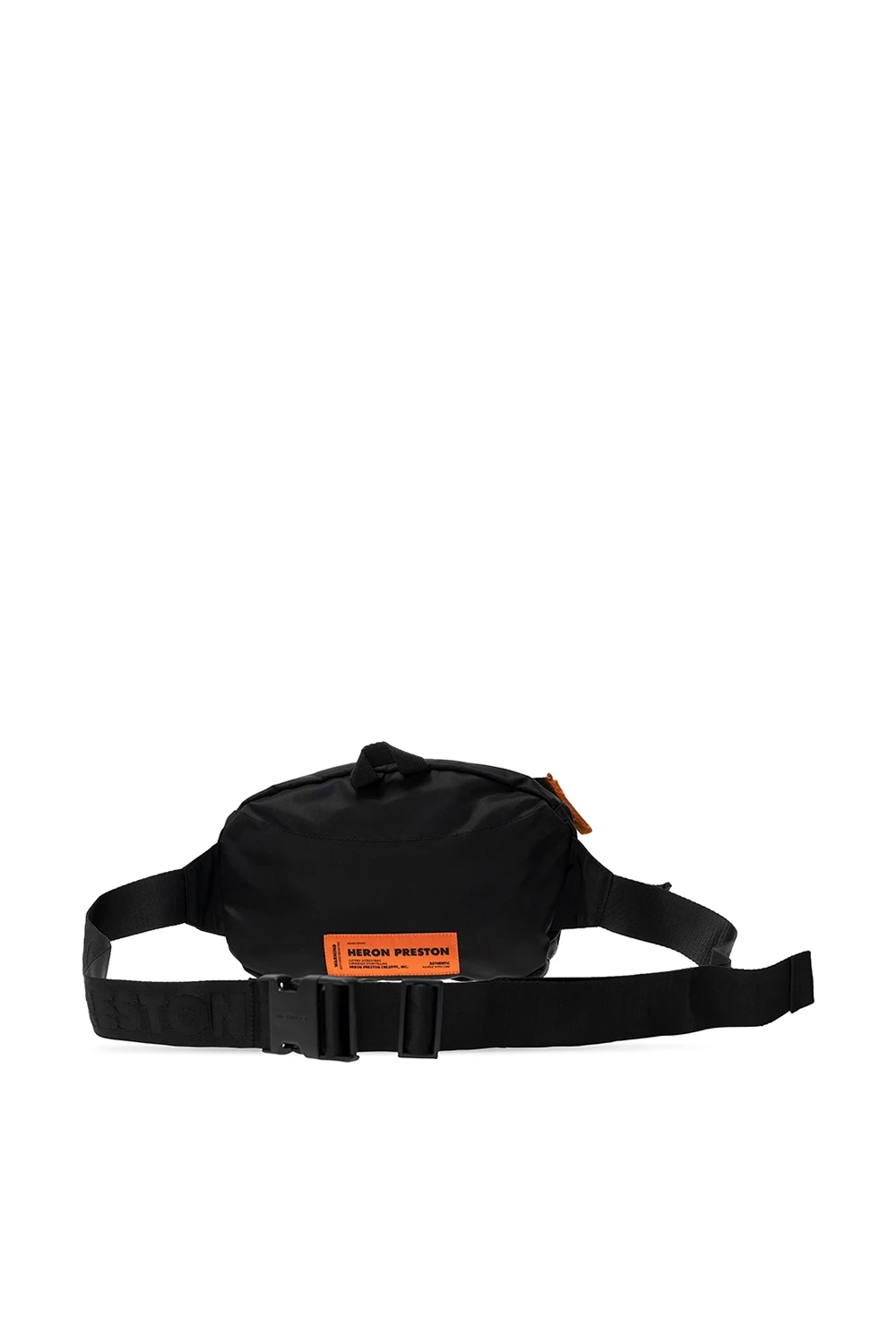 Czarno-pomarańczowa torba na pas Heron Preston. Zamykana na zamek. Z przodu kieszeń zamykana na zamek oraz nadrukowane logo. Z tyłu pomarańczowo-czarna naszywka z logo. Regulowany pas. Wewnątrz komora i kieszeń zamykana na zamek.