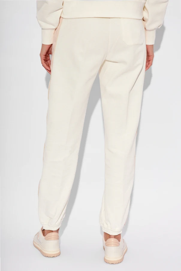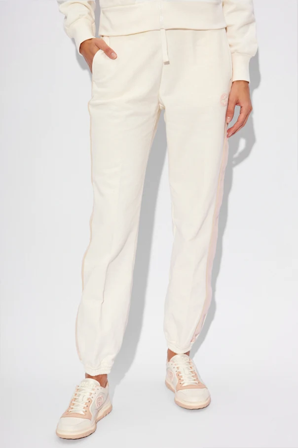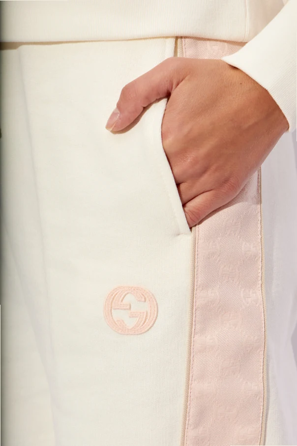Spodnie dresowe Gucci - kwintesencja luksusu splatająca się z niezrównanym komfortem, predestynująca do kreowania zarówno eleganckich jak i swobodnych stylizacji. Wykonane z najwyższej jakości bawełny , te białe spodnie dresowe zdobią subtelne różowe lampasy z monogramem, dodając im wyrafinowanego charakteru. Zwężane nogawki zakończone ściągaczem, oraz elastyczny pas z białym sznurkiem do regulacji, gwarantują idealne dopasowanie do sylwetki, podkreślając jej atuty.