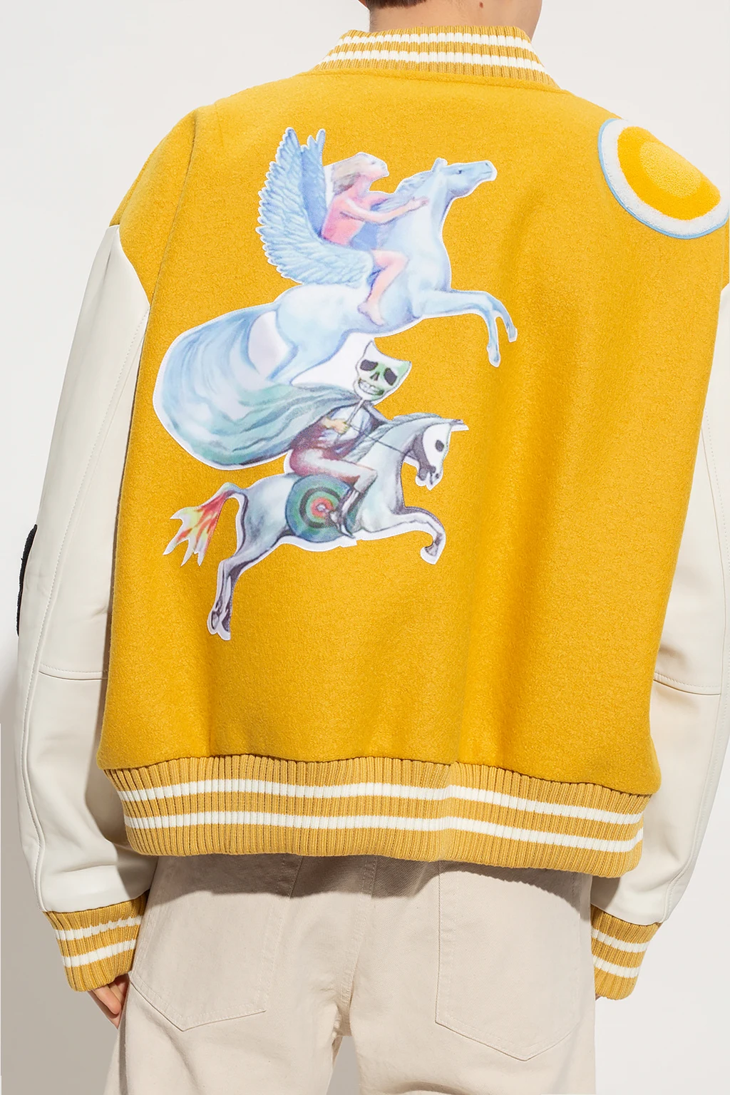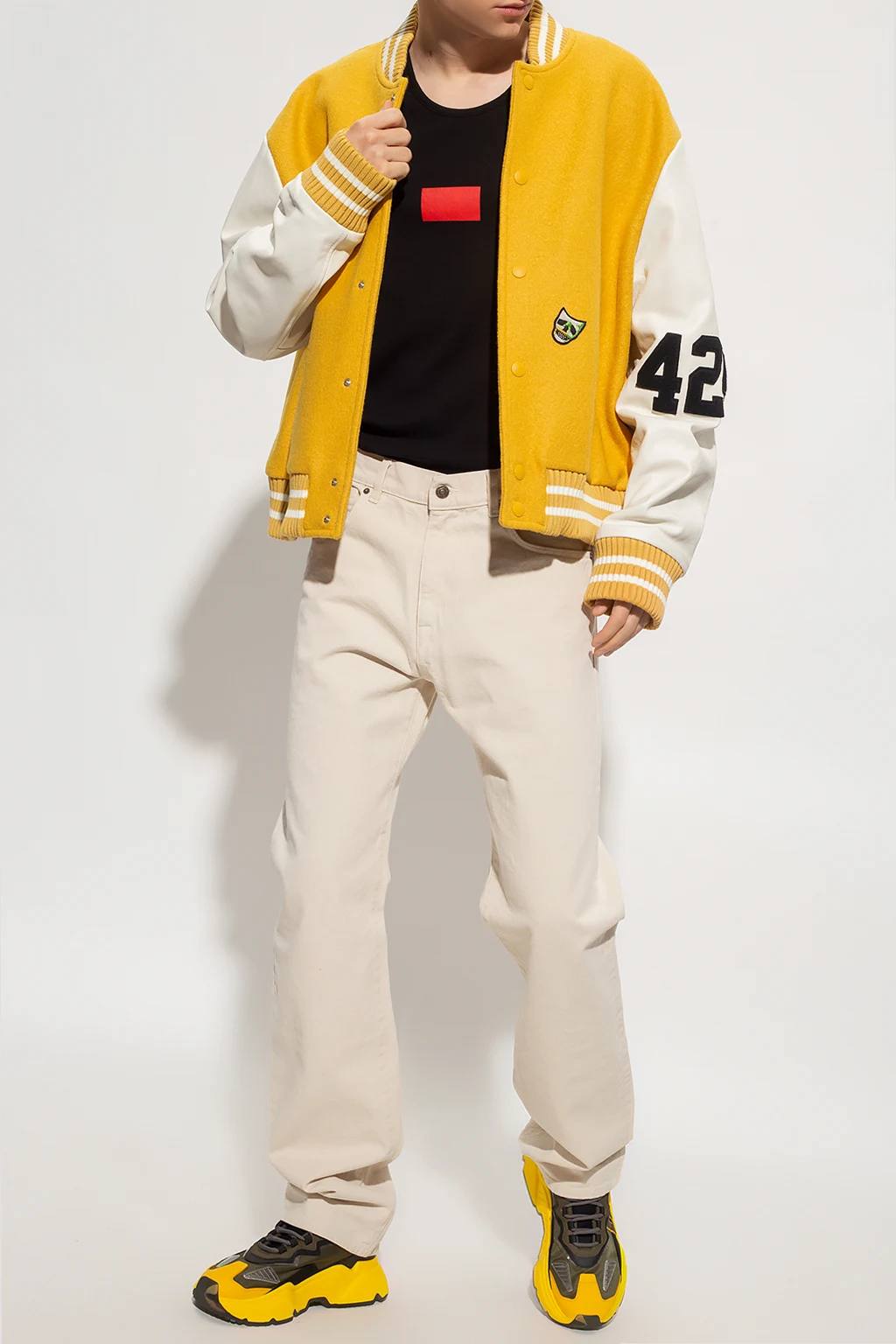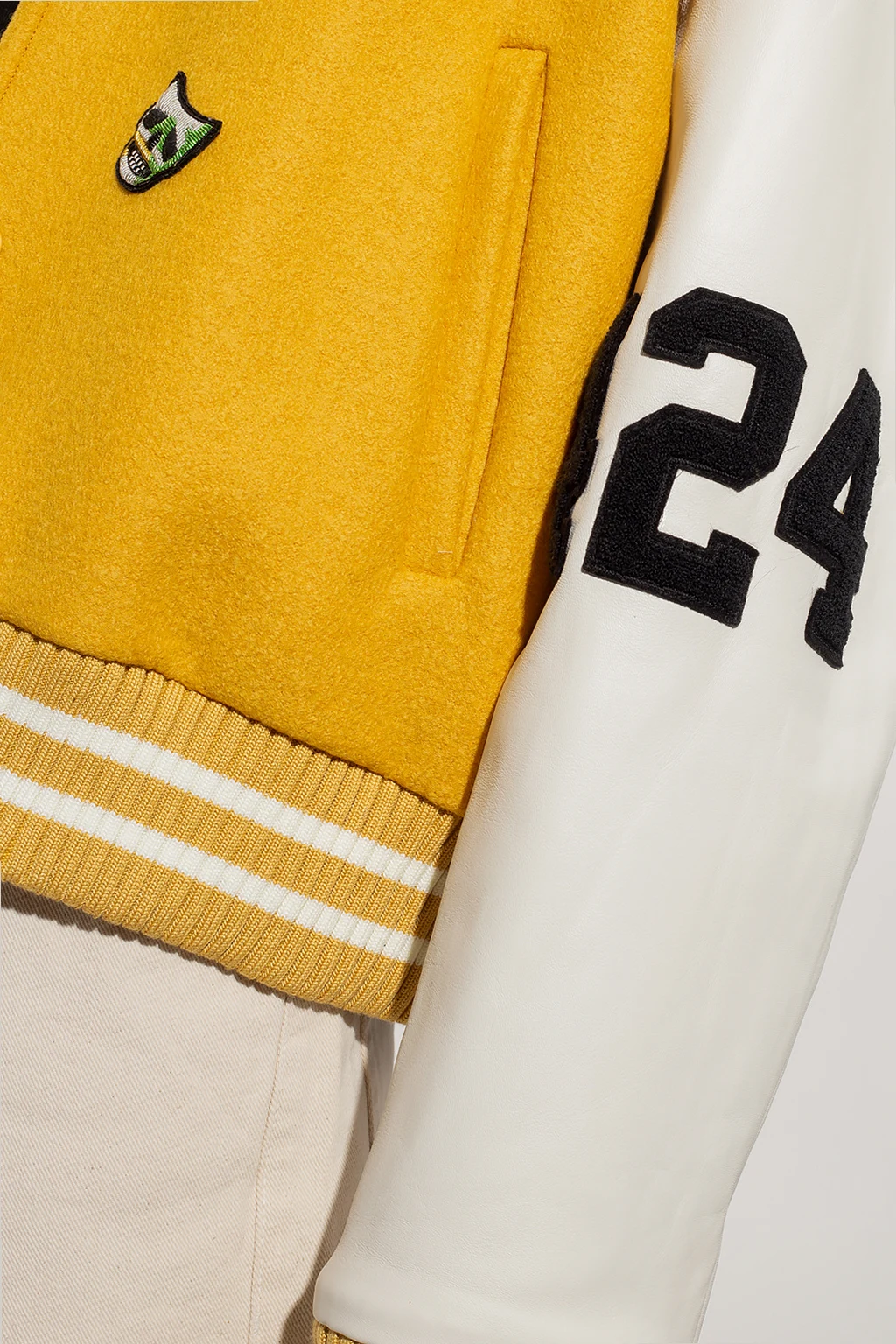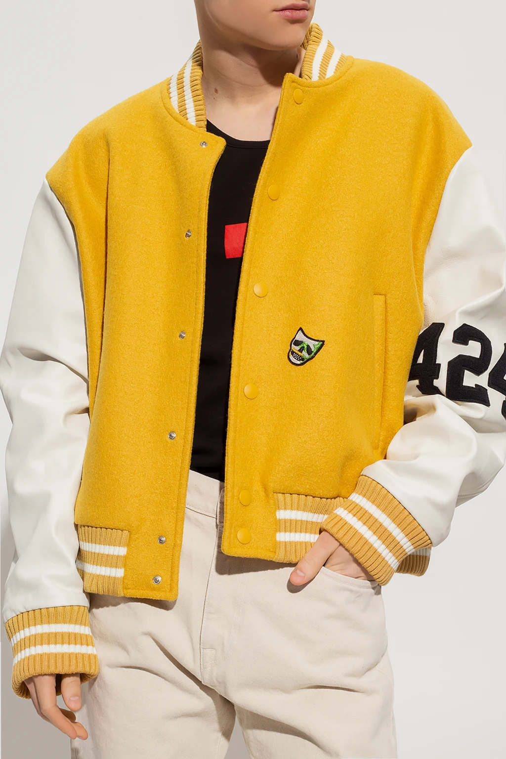 Żółto-biała, wełniana kurtka typu ‘bomber’ 424. Zapinana na zatrzaski. Z przodu kolorowa naszywka i dwie kieszenie. Długie rękawy wykonane ze skóry jagnięcej, na jednym naszyte czarne logo. Z tyłu kolorowy nadruk. Kołnierz, długie rękawy i dół kurtki zakończone ściągaczem.