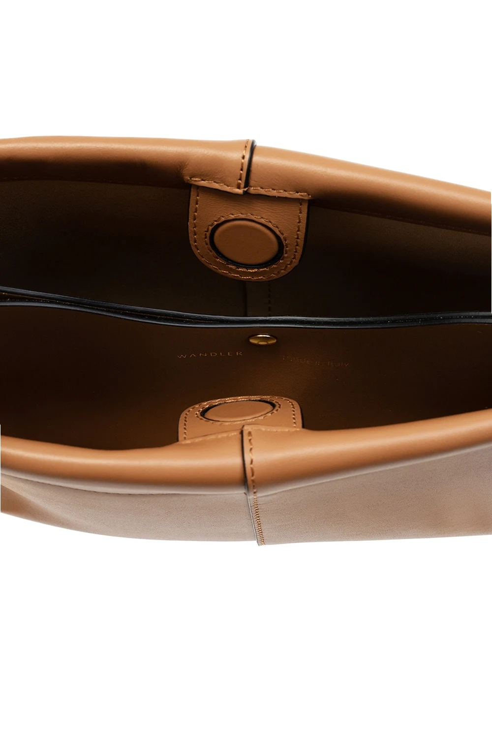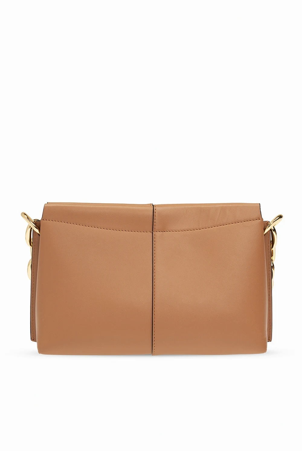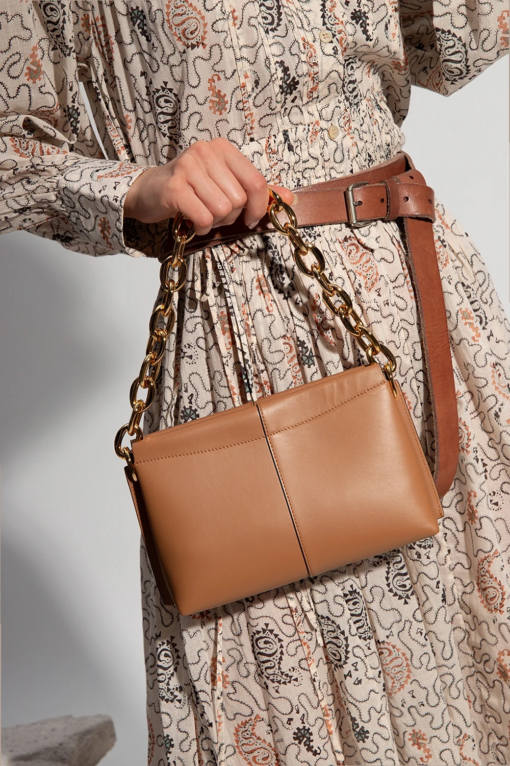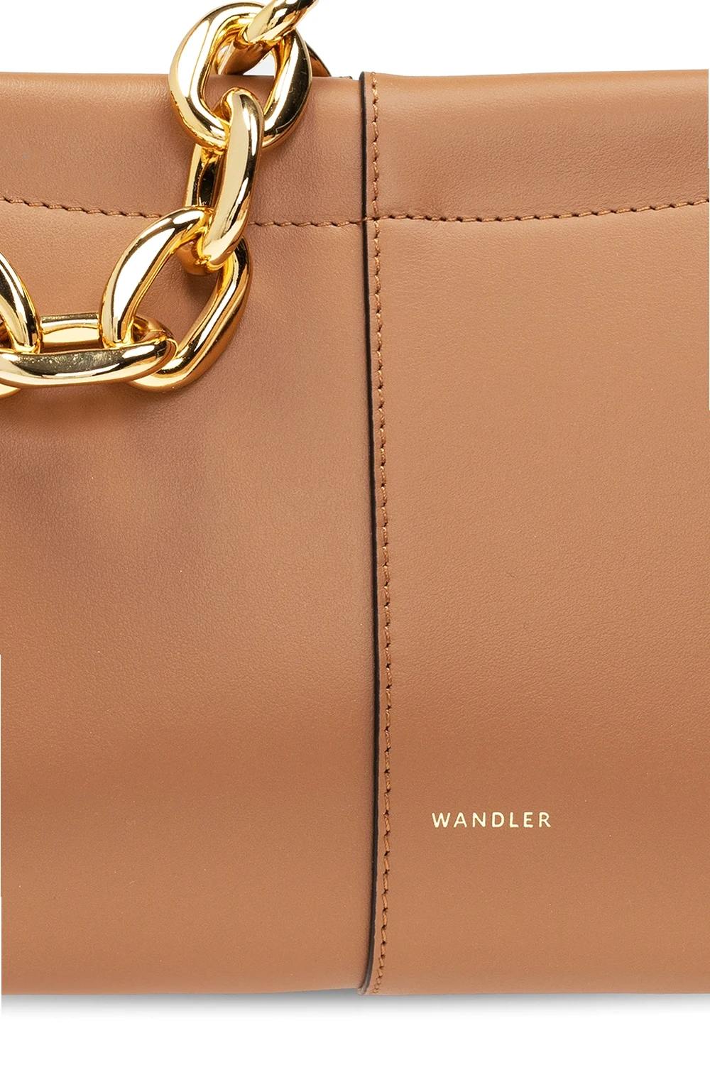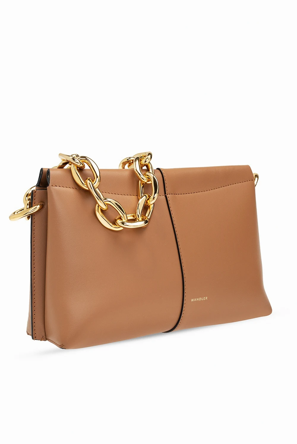 Brązowa torba na ramię, model 'Carly' Wandler, rozmiar 'mini'. Wykonana ze skóry cielęcej i bydlęcej. Zamykana na magnetyczne zapięcie. Ozdobiona logo w kolorze złotym. Łańcuch na ramię. Wewnątrz dwie komory oraz kieszeń zamykana na zatrzask.