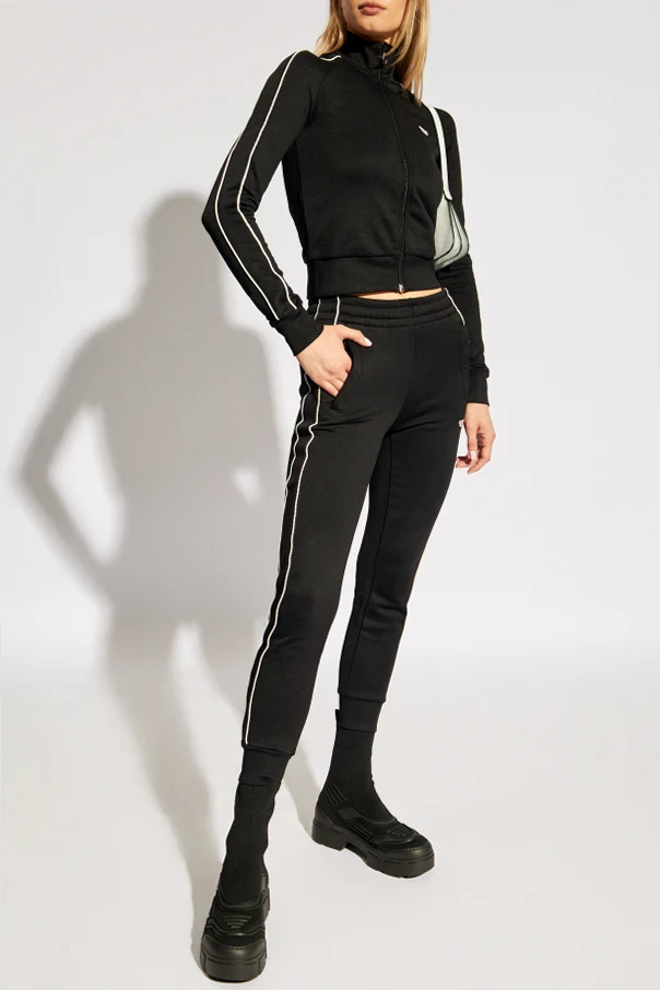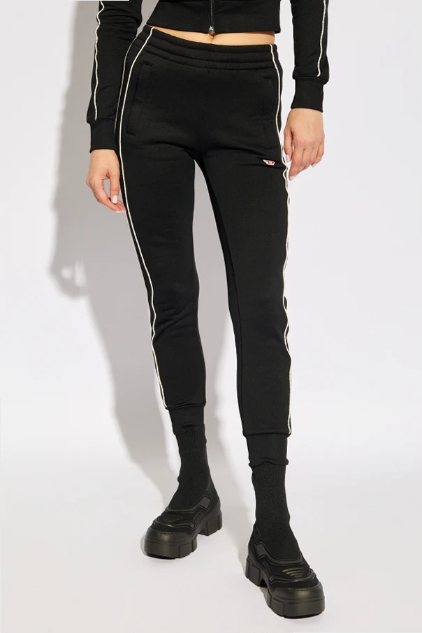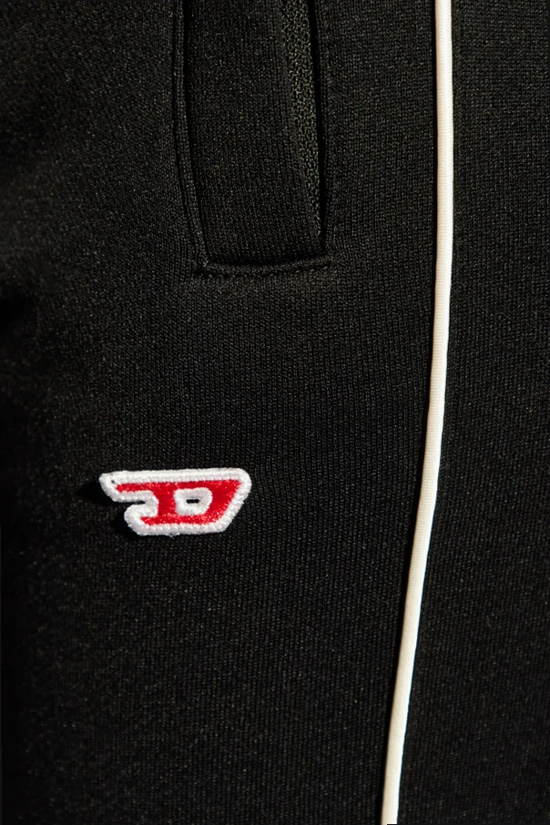 Ich unikalny charakter podkreśla biały pas piping biegnący wzdłuż zewnętrznych szwów nogawek, dodając spodniom sportowego akcentu. Czerwono-białe logo Diesel, umieszczone z subtelną elegancją na lewej stronie biodra, stanowi ponadczasowy symbol jakości i nowoczesnego designu. Manżety na dole nogawek, ściągane trokami, zapewniają idealne dopasowanie oraz podkreślają dynamikę całego stroju.