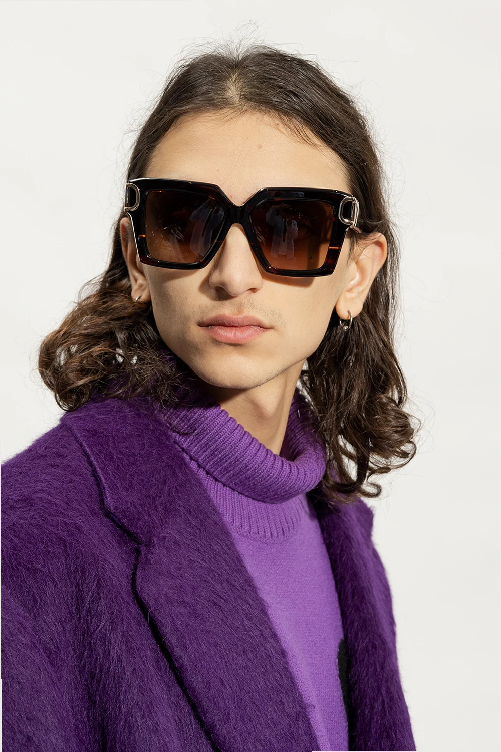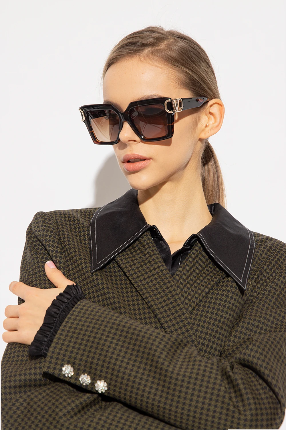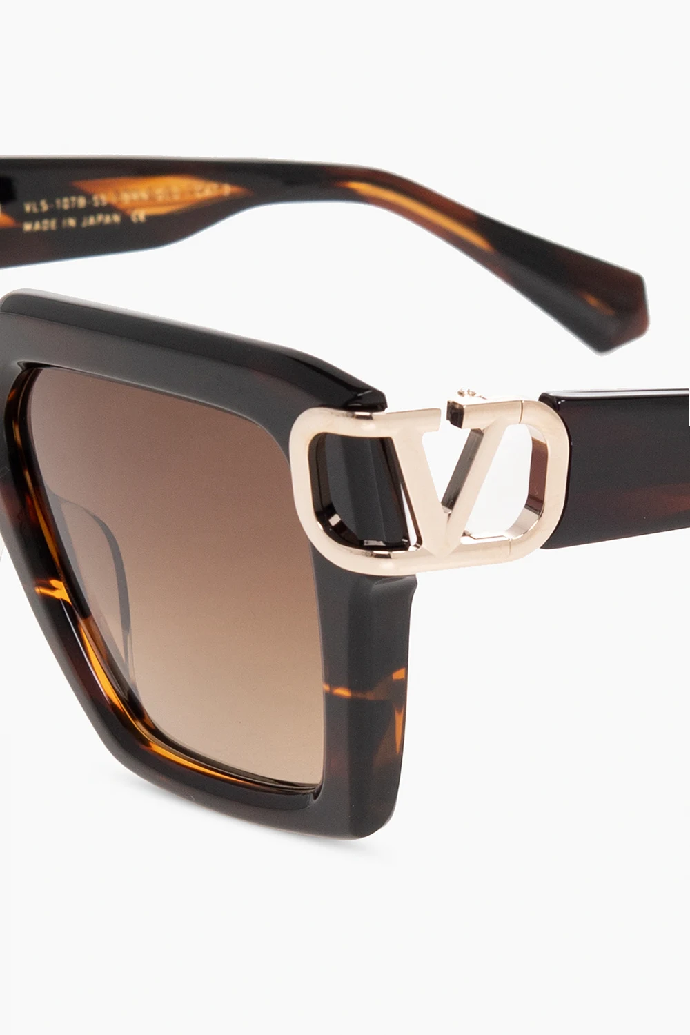 Brązowo-czarne, szylkretowe okulary przeciwsłoneczne Valentino Eyewear. Wykonane z japońskiego acetatu. Kwadratowe oprawki. Zauszniki ozdobione aplikacją w kształcie logo w kolorze srebrnym. Brązowe, gradientowe soczewki ze 100% ochroną przed promieniowaniem UV. Ręcznie wykonane w Japonii. Dołączone etui ze skóry z recyklingu z paskiem i ściereczką do czyszczenia.