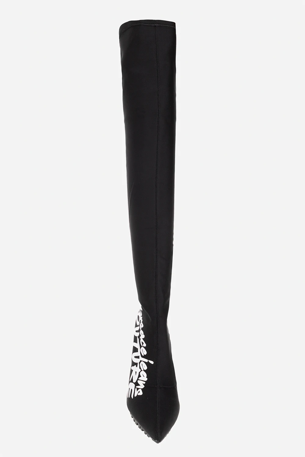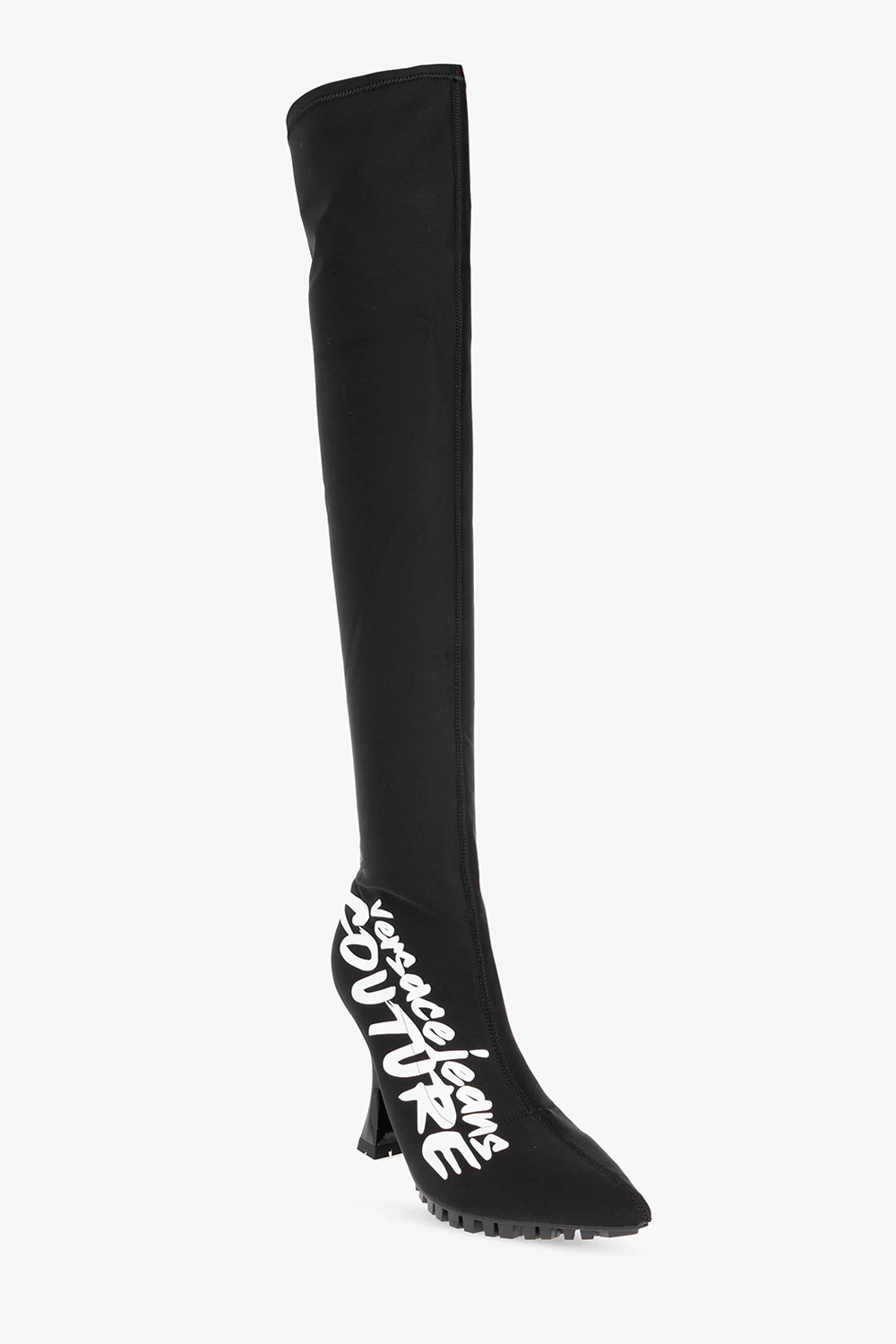 Czarne, wsuwane kozaki Versace Jeans Couture. Ozdobione białym nadrukiem z logo. Czarna, gumowa podeszwa.