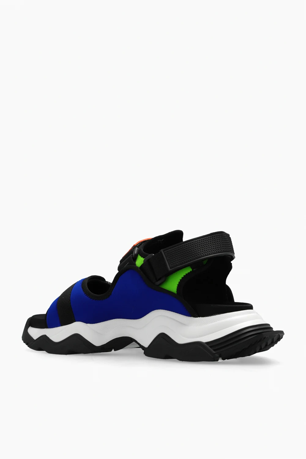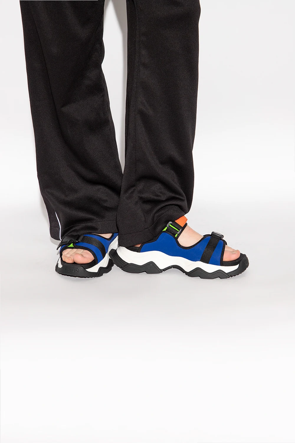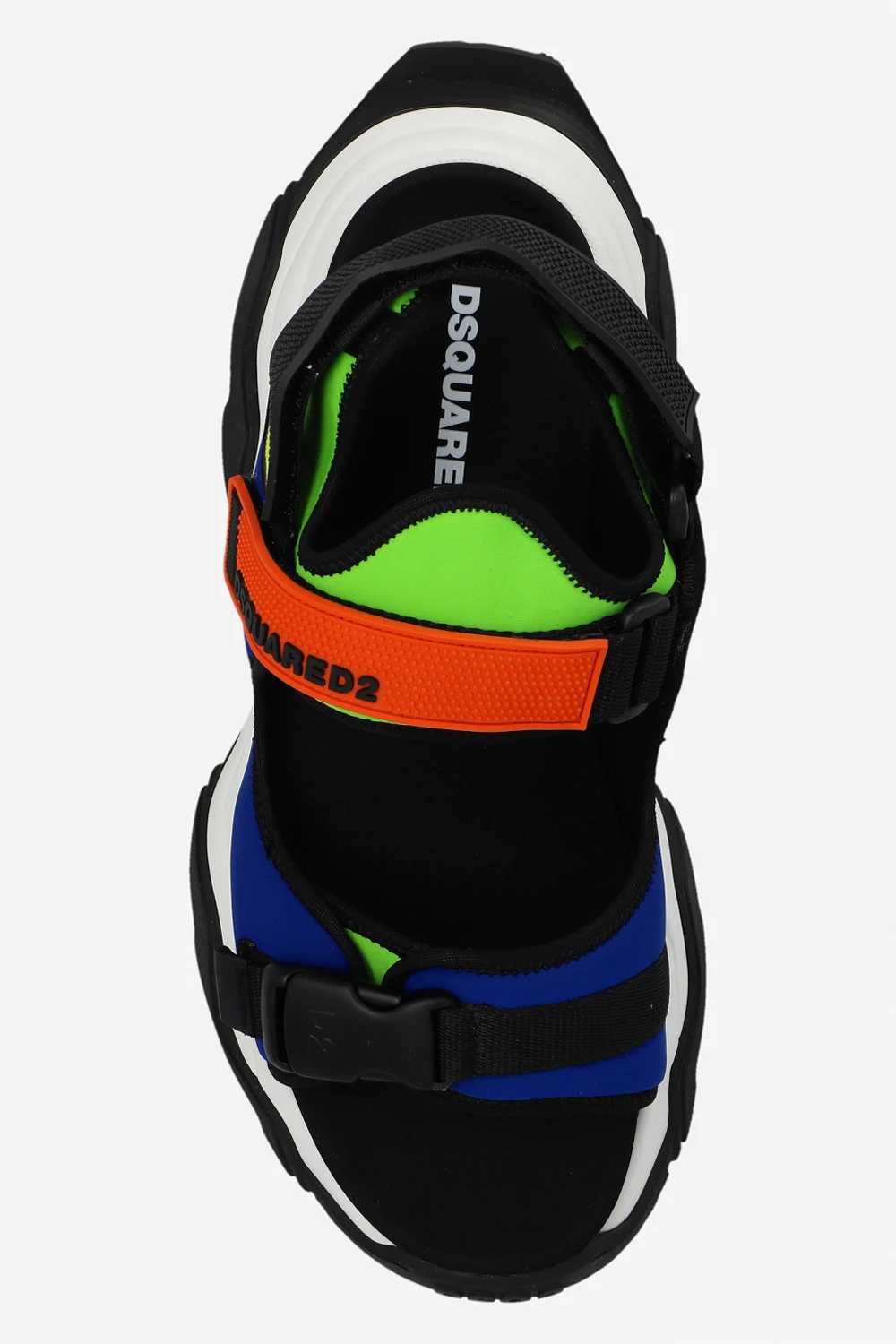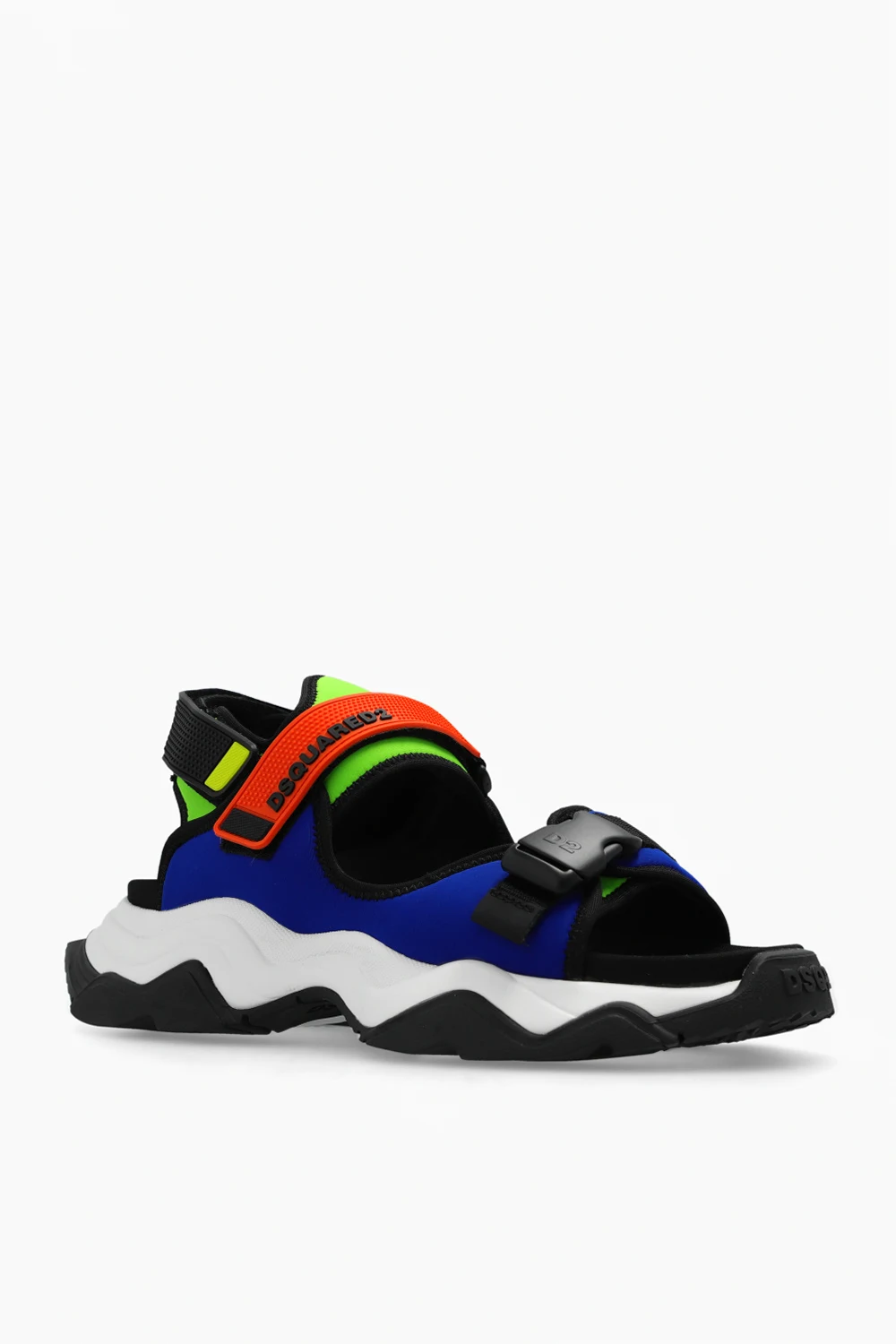 Kolorowe sandały, model 'Wave' Dsquared2. Wykonane z materiału. Zapinane na regulowane paski z rzepem oraz zatrzask. Ozdobione gumową aplikacją z logo. Biało-czarna podeszwa wykonana z gumy i pianki EVA.