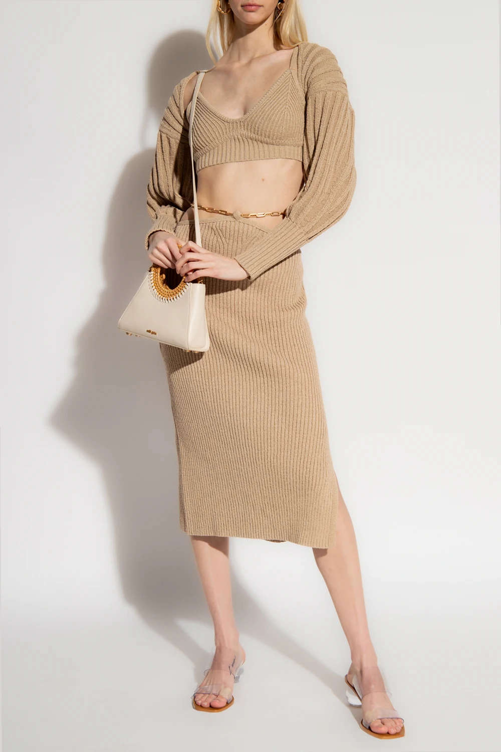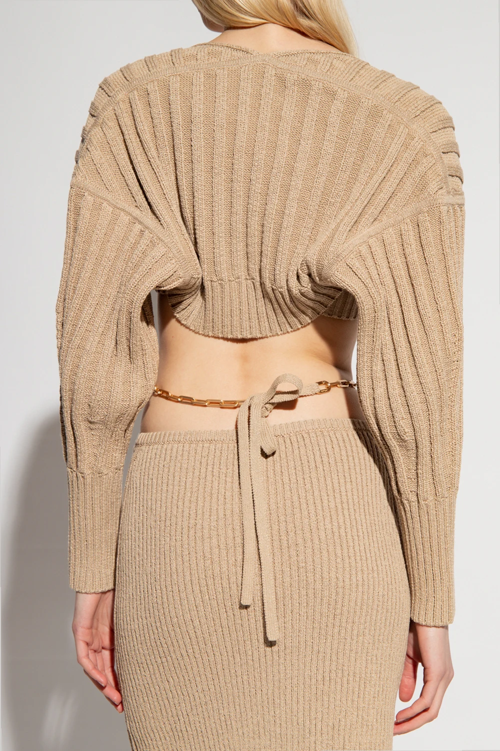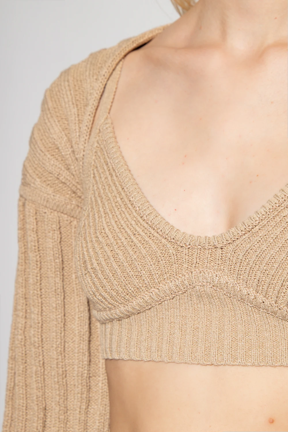Beżowy komplet: top na ramiączkach i krótki kardigan, model ‘Rosie’ Cult Gaia. Wykonany z bawełnianej dzianiny o prążkowanej fakturze. Krótki top o dopasowanym kroju wykończony ściągaczem. Kardigan z długimi, bufiastymi rękawami.