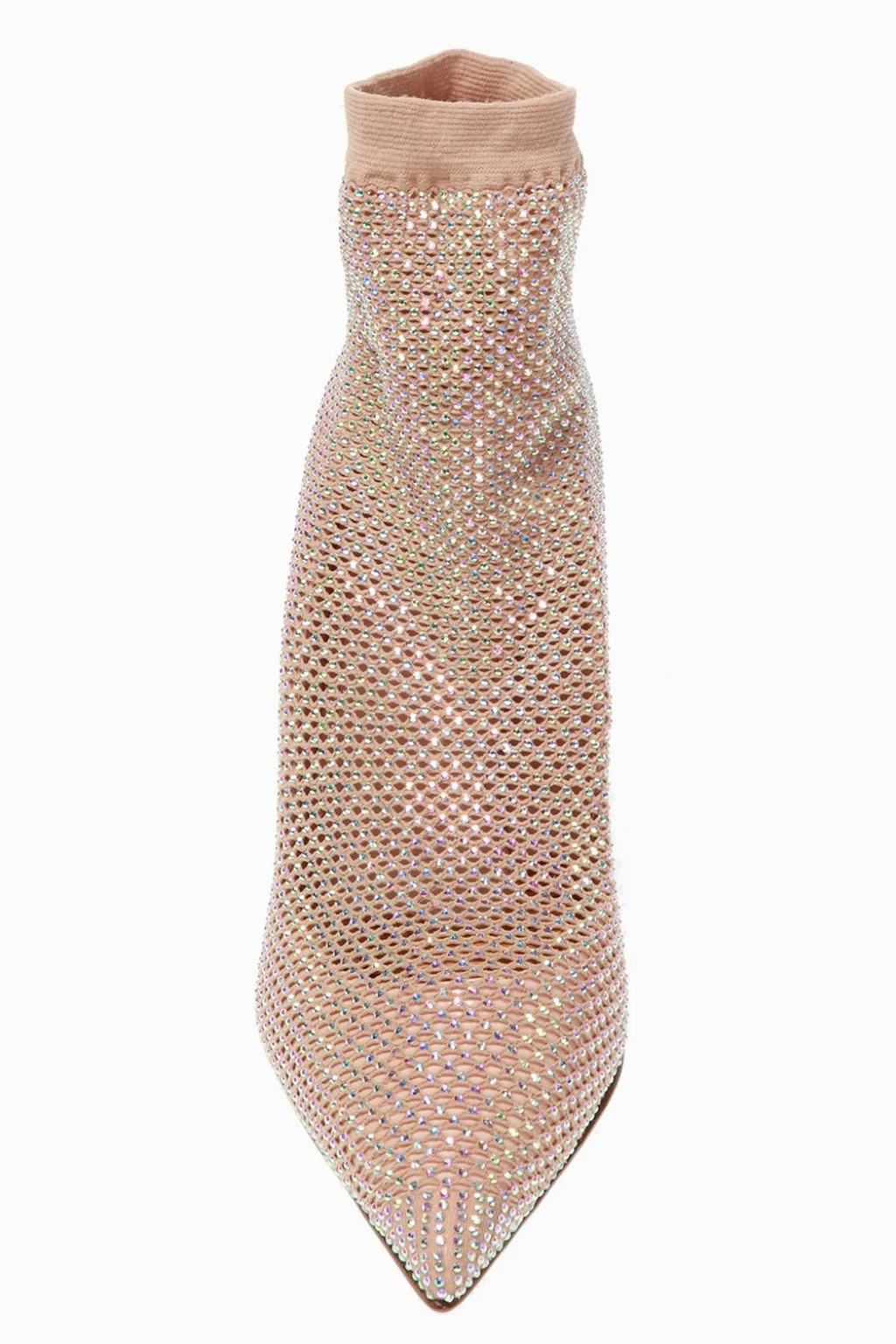 Jasnoróżowe buty na obcasie ze skarpetą, model ‘Gilda’ Le Silla. Wysadzane dekoracyjnymi elementami w kolorze srebrnym. Brązowa podeszwa wykonana ze skóry i gumy.