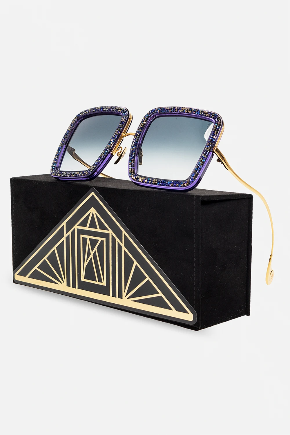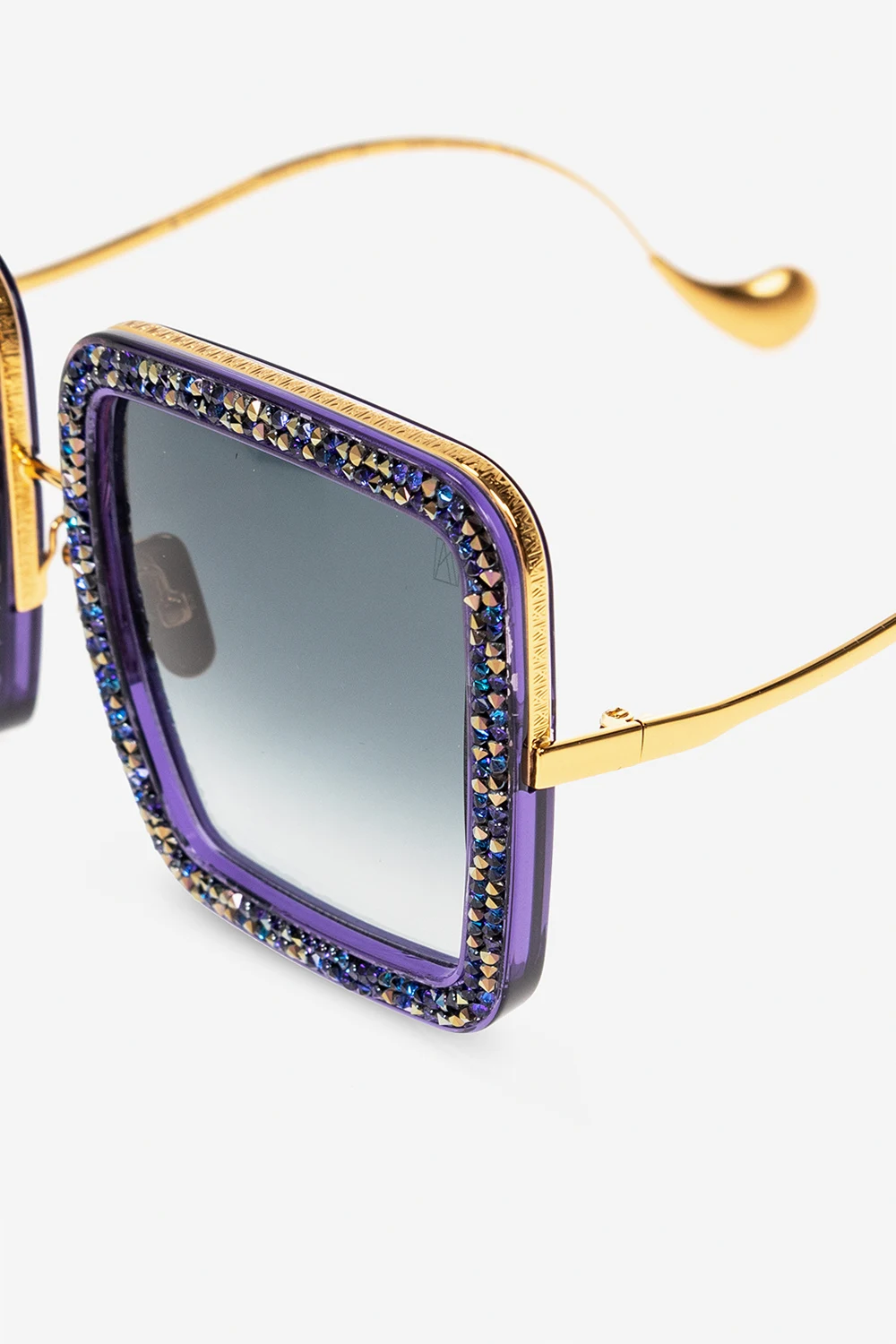 Okulary przeciwsłoneczne w kolorze fioletowo-złotym, model ‘Beaming Sky’ Anna Karin Karlsson. Pozłacane 24-karatowym złotem. Kwadratowe, ponadgabarytowe oprawki wykonane z acetatu ozdobionego połyskującymi kryształami w kolorze srebrnym, niebieskim i fioletowym. Góra z dekoracyjnie rzeźbionym wzorem z monogramem. Pojedynczy, cienki mostek oraz regulowane noski z wygrawerowanym logo. Ozdobnie zakrzywione zauszniki z końcówkami z logo. Niebieskie, gradientowe szkła z technologią Zeiss ze 100% ochroną przed promieniami UV oraz odblaskami.
