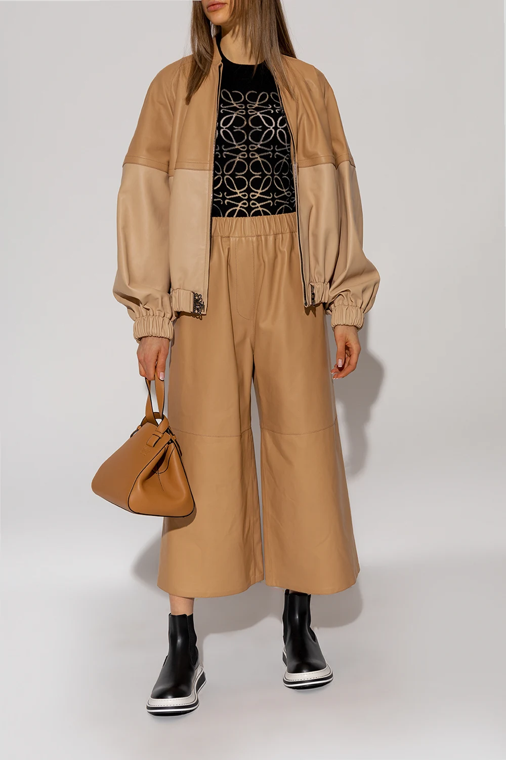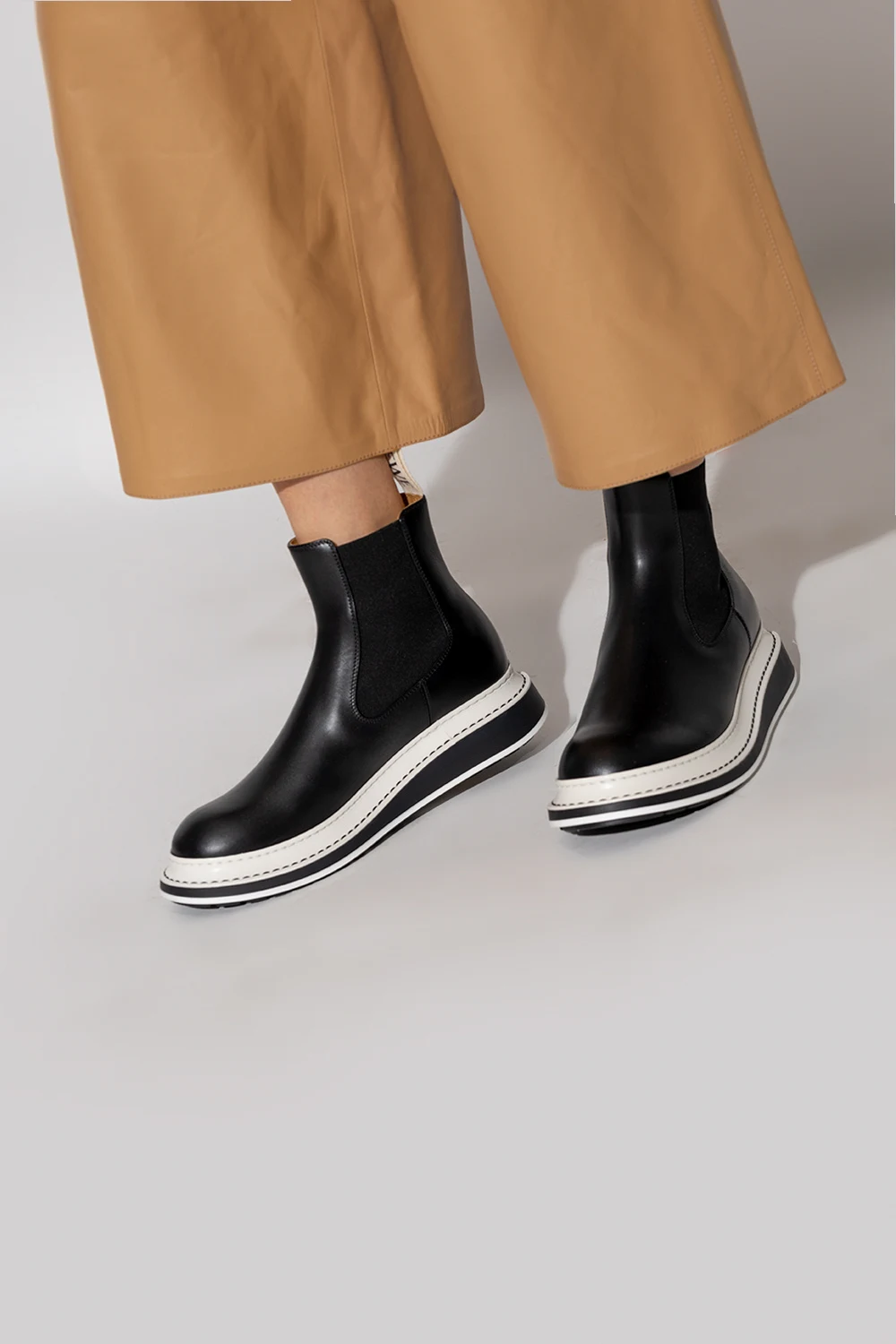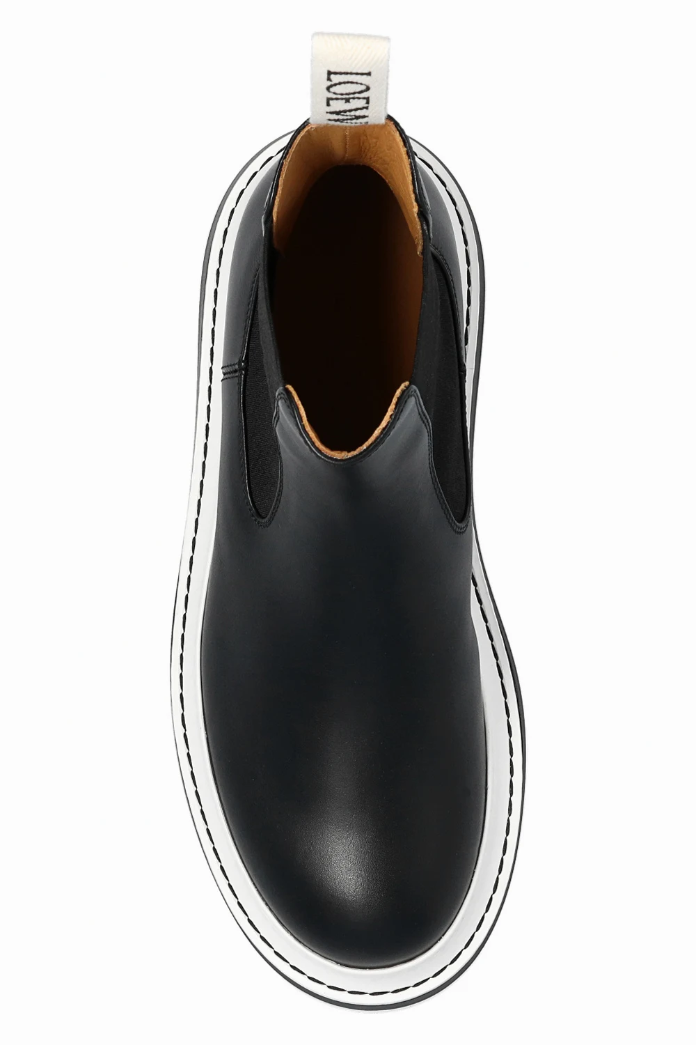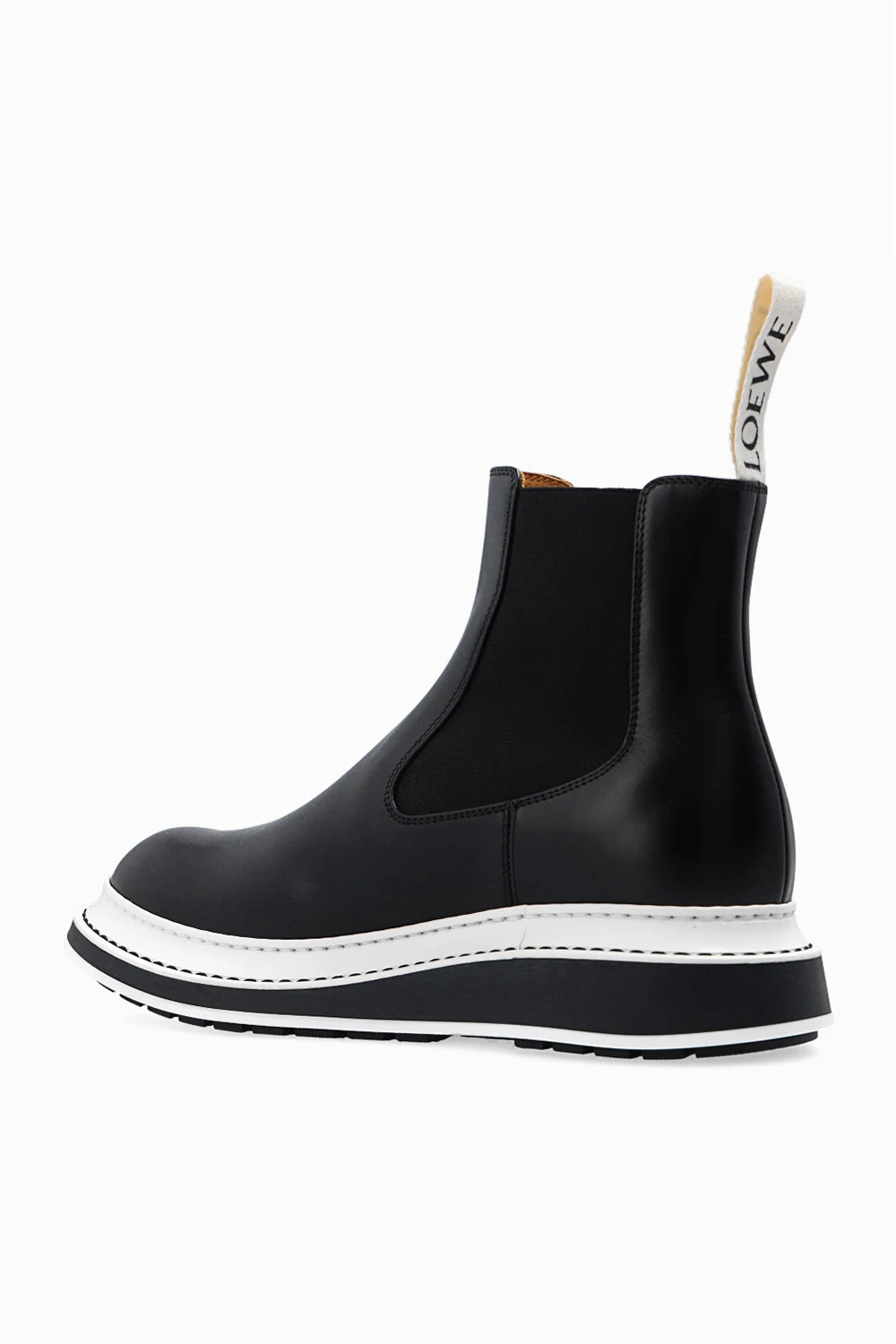 Czarne sztyblety Loewe. Wykonane ze skóry. Po bokach taśma elastyczna. Migdałowy nosek. Biało-czarna, gumowa podeszwa.