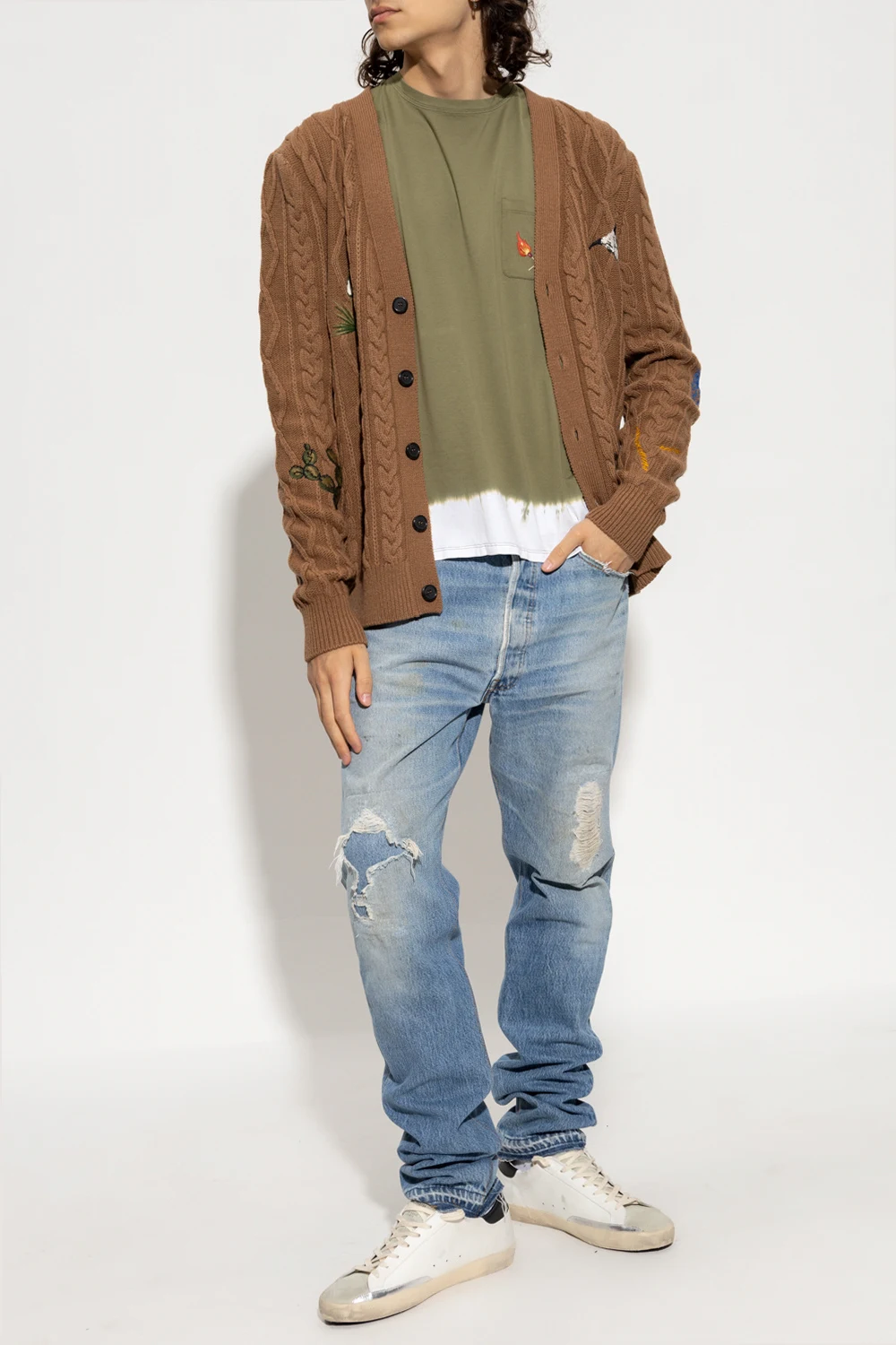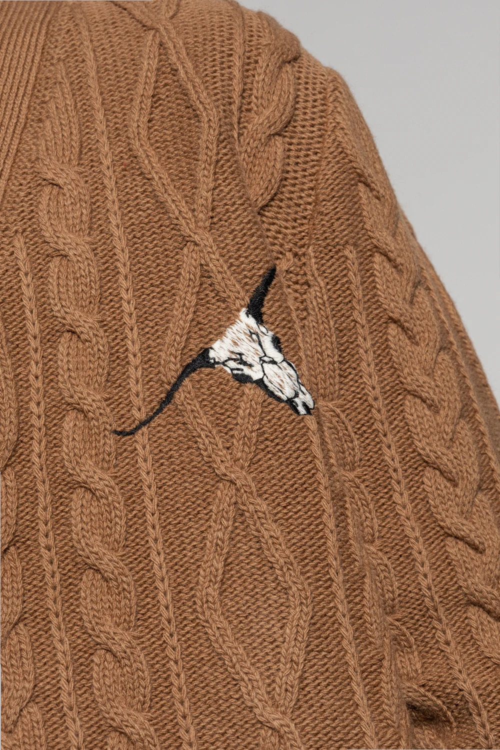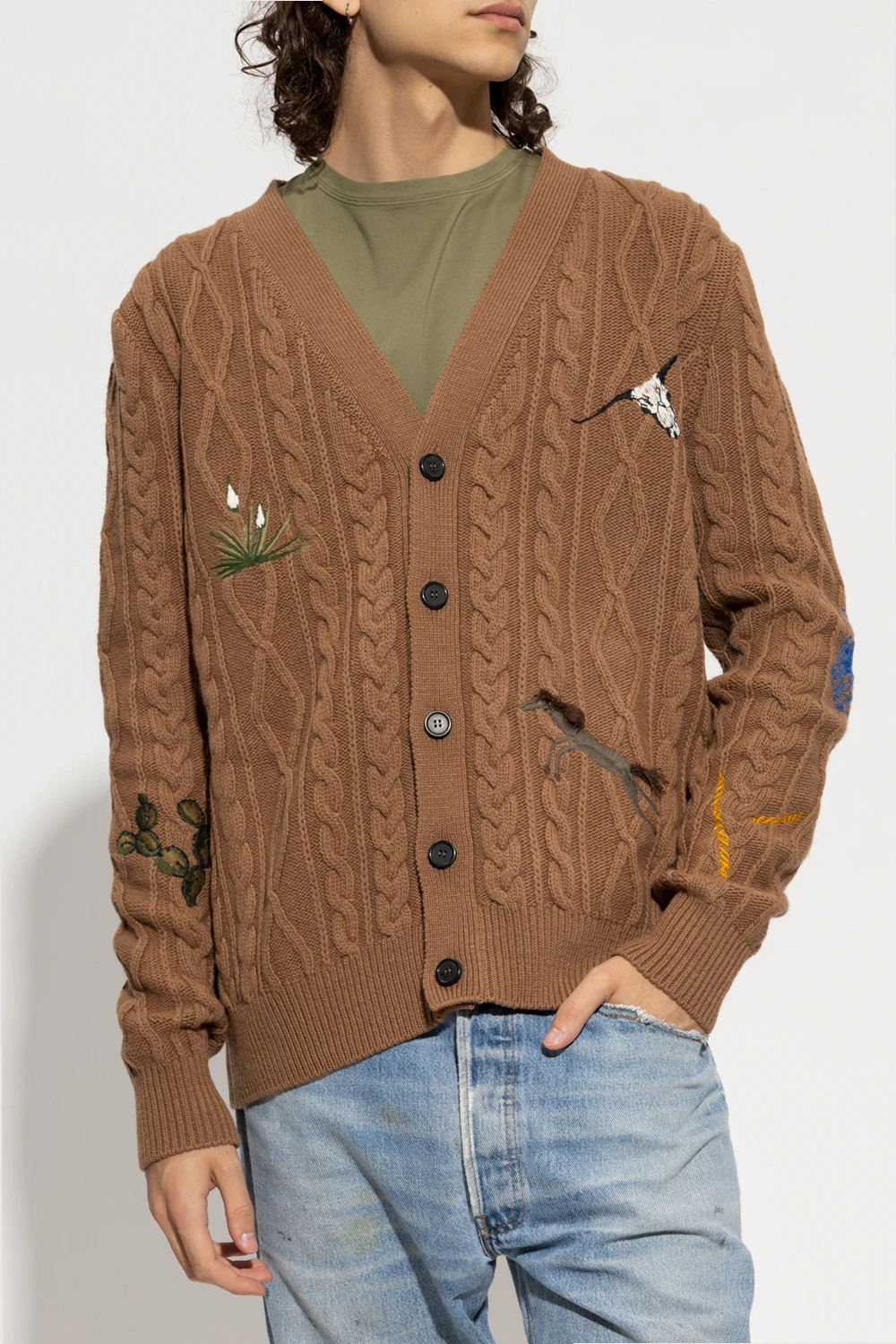 Brązowy kardigan Nick Fouquet. Wykonany z wełny wzbogaconej kaszmirem. Zapinany na guziki. Dekoracyjny splot. Ozdobiony kolorowymi, wyszytymi wzorami. Dekolt w szpic, długie rękawy oraz dół wykończone ściągaczem.