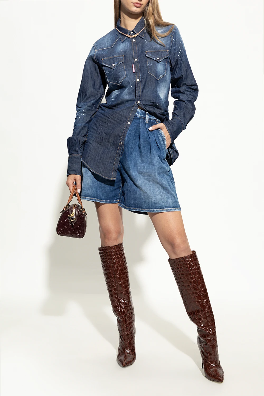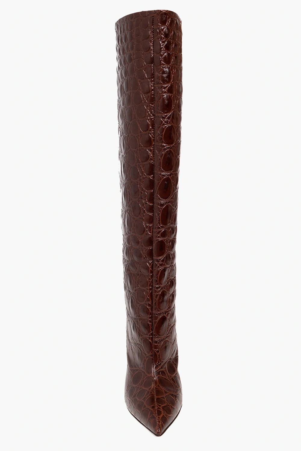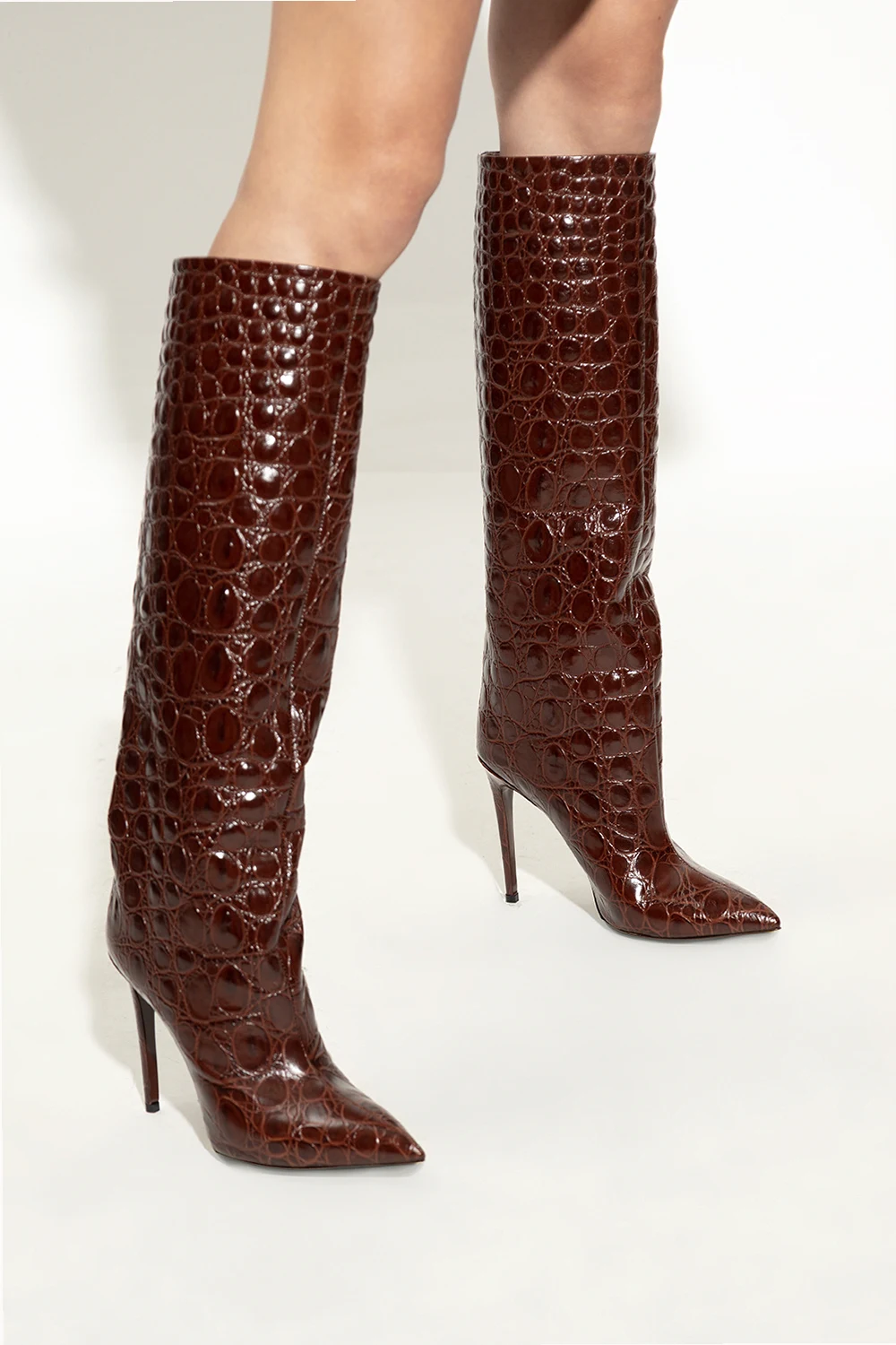 Brązowe kozaki na obcasie Paris Texas. Wykonane ze skóry imitującej skórę krokodyla. Nosek w szpic. Brązowa, skórzana podeszwa.