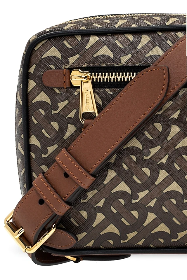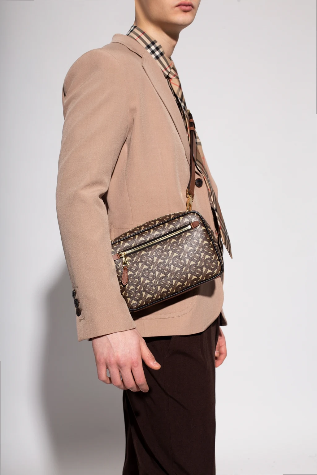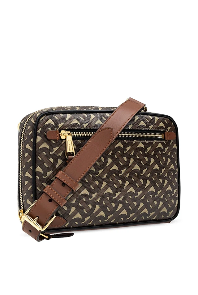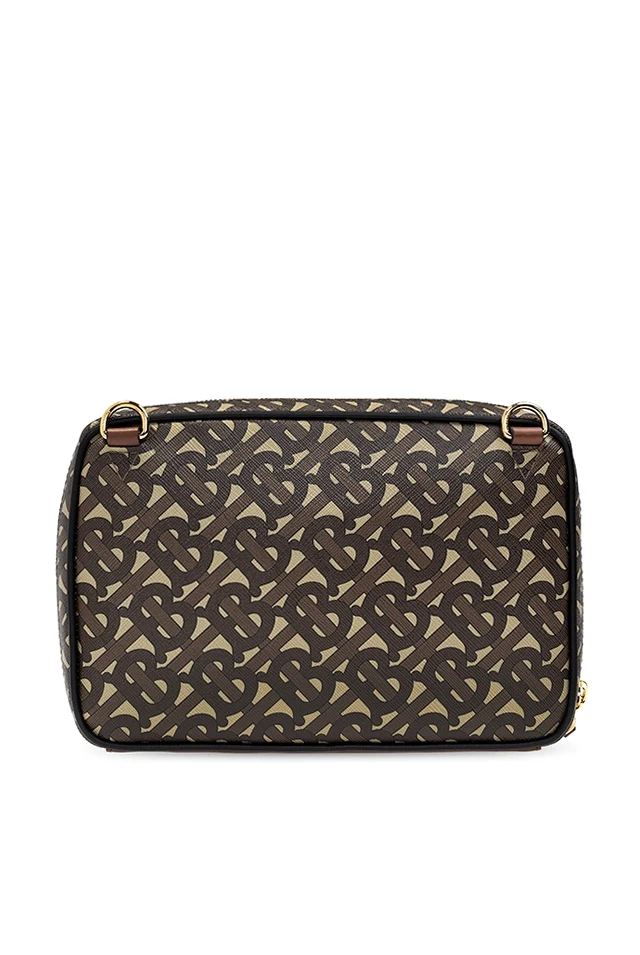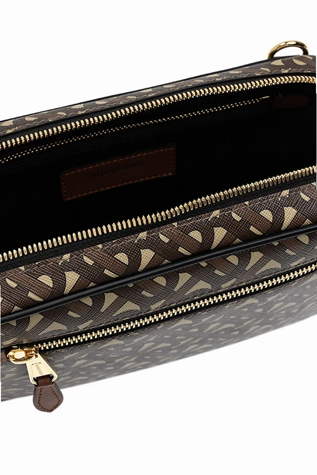 Brązowo-czarno-beżowa, skórzana torba na ramię, model 'Atlas' Burberry. Zamykana na dwubiegunowy zamek. Ozdobiona nadrukowanym wzorem z logo. Z tyłu kieszeń zamykana na zamek. Odpinany pasek na ramię z możliwością regulacji długości. Wewnątrz komora oraz kieszeń zamykana na zamek. Metalowe elementy w kolorze złotym.