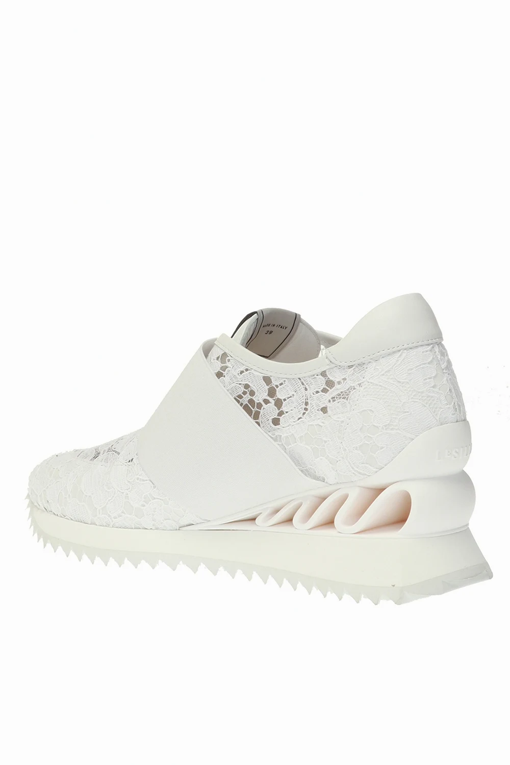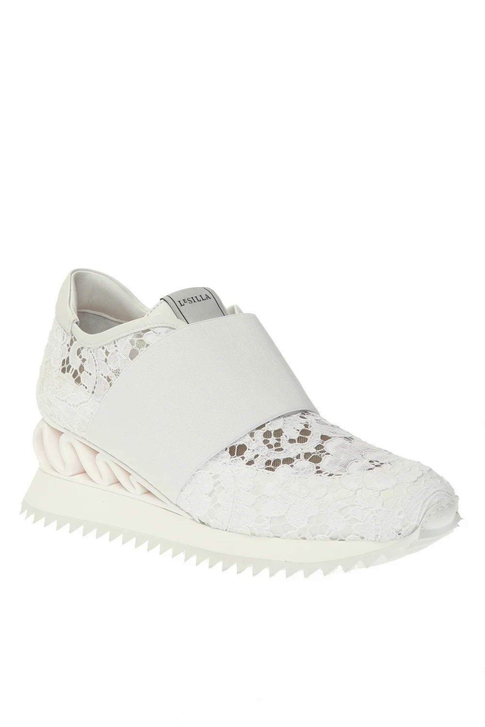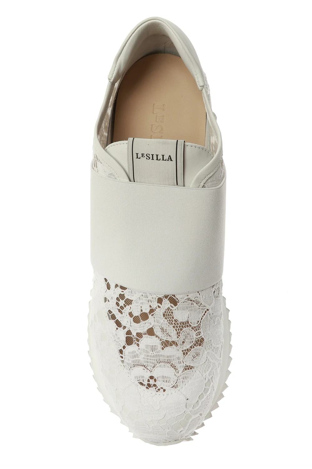 Różowo-białe, wsuwane buty sportowe na platformie, model ‘Reiko’ Le Silla. Wykończone skórą. Ozdobione koronką, naszywką z logo oraz gumową wstawką. Z tyłu wytłoczone logo. Dekoracyjna platforma. Brązowa, gumowa podeszwa.