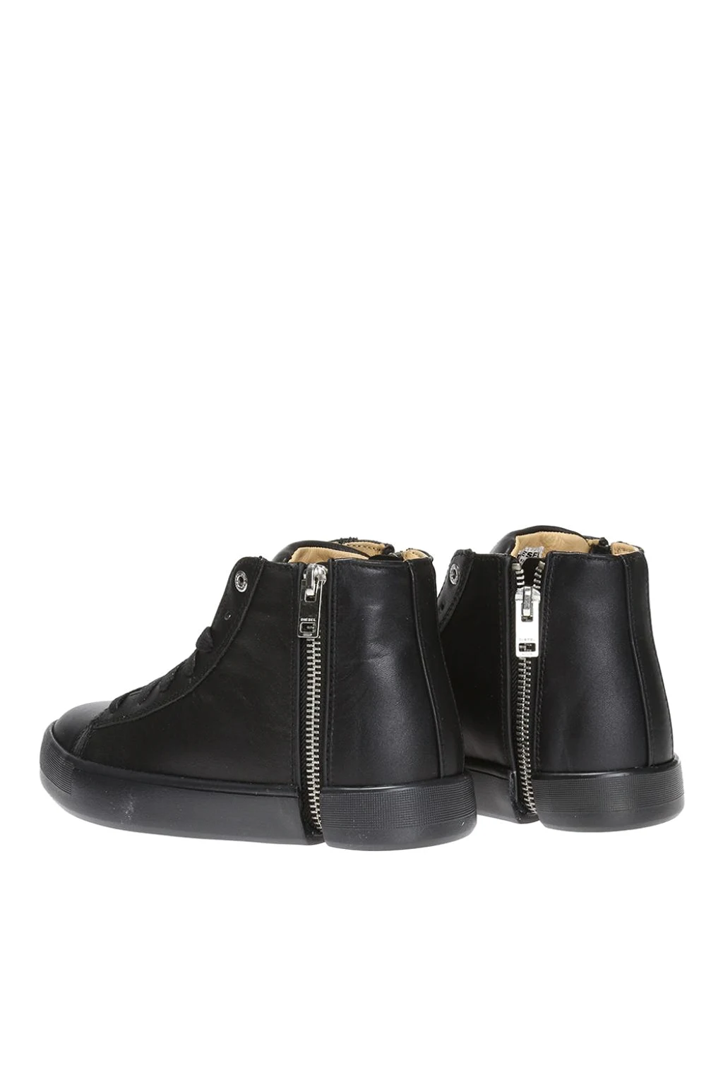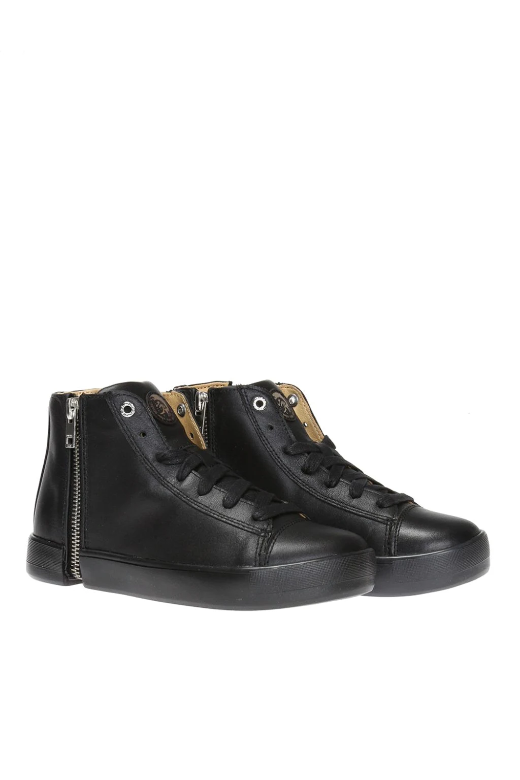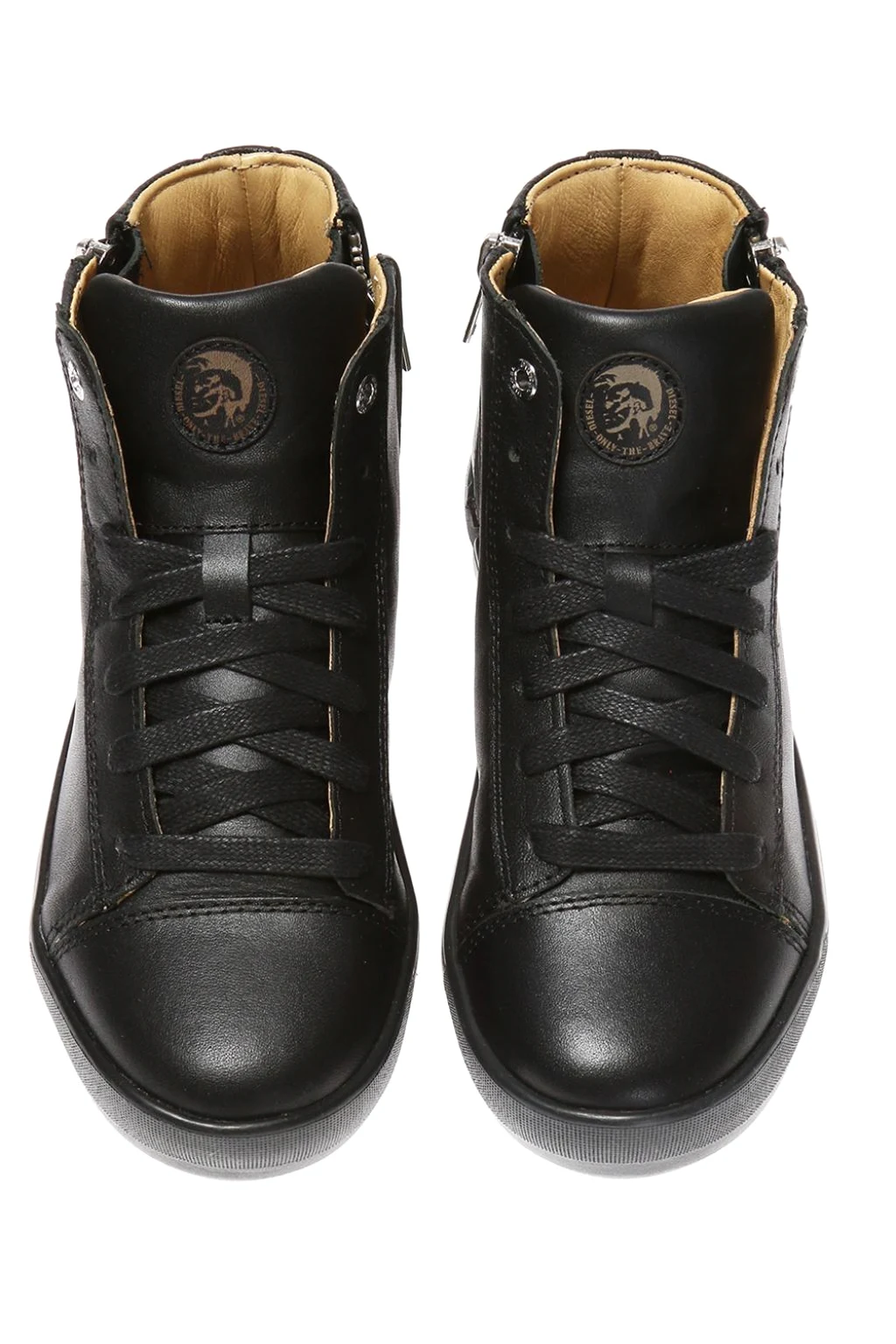 Czarne, sznurowane buty za kostkę Diesel. Zapinane na dwubiegunowy zamek. Wykonane ze skóry. Z przodu ozdobione naszywką z logo w kolorze brązowo-czarnym. Metalowe elementy w kolorze srebrnym. Czarna, gumowa podeszwa.