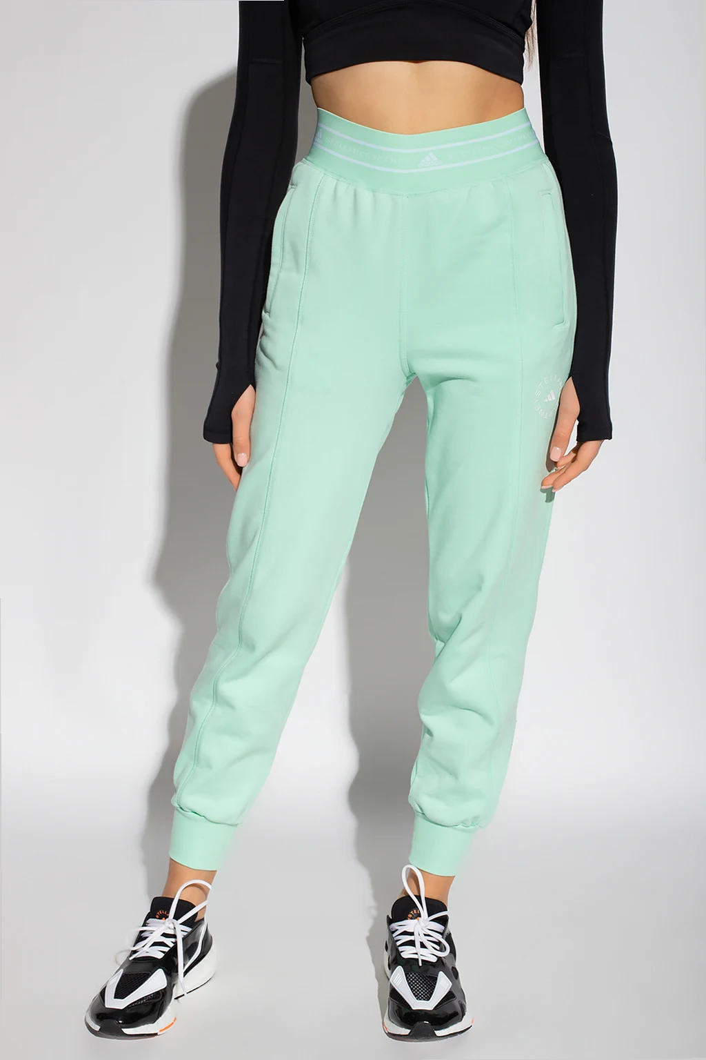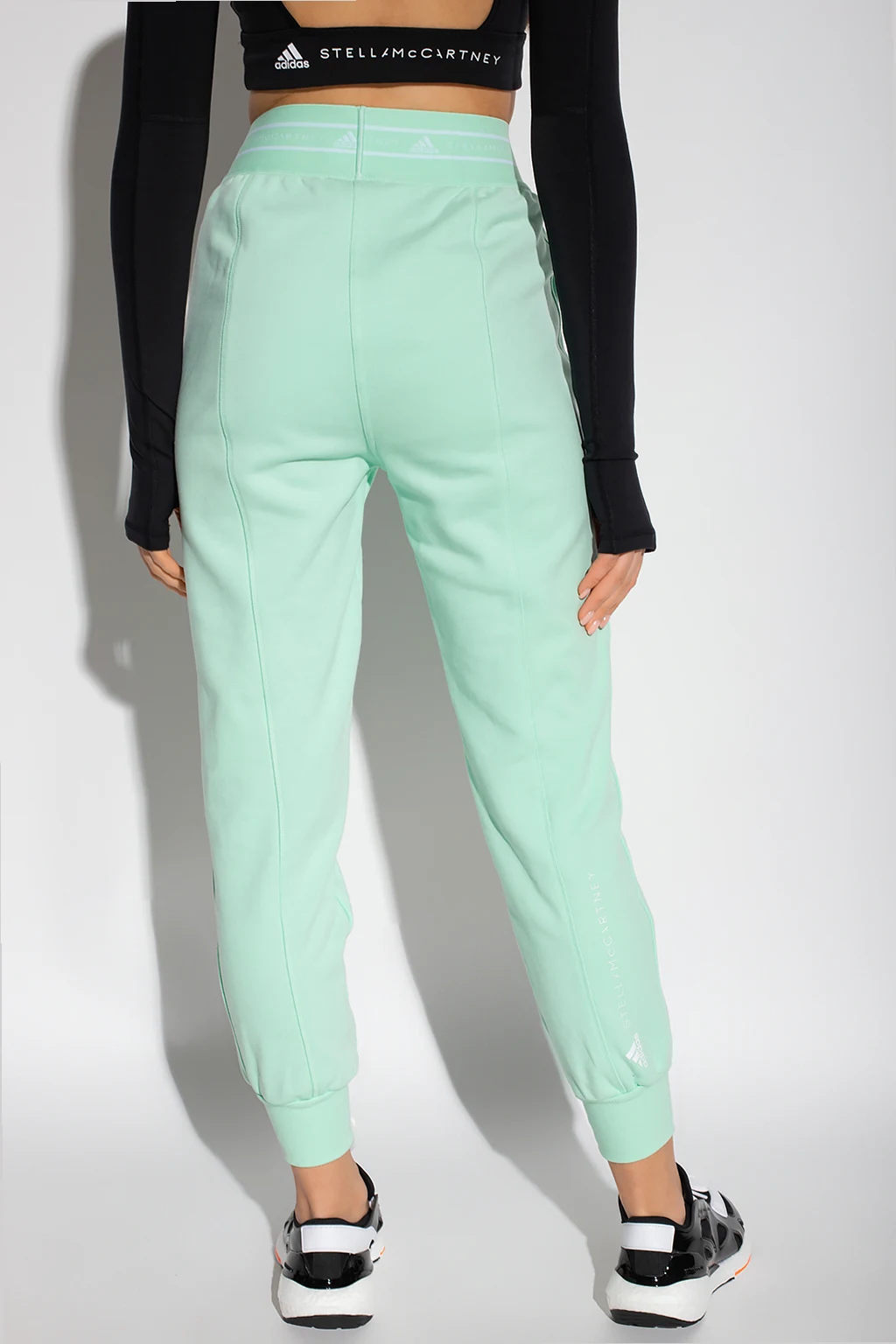 Jasnozielone spodnie dresowe ADIDAS by Stella McCartney. Wykonane z organicznej bawełny. W pasie wszyta elastyczna guma z wyszytym logo w kolorze białym. Na nogawce z przodu oraz z tyłu białe logo. Z przodu dwie wsuwane kieszenie. Długie nogawki wykończone ściągaczem.