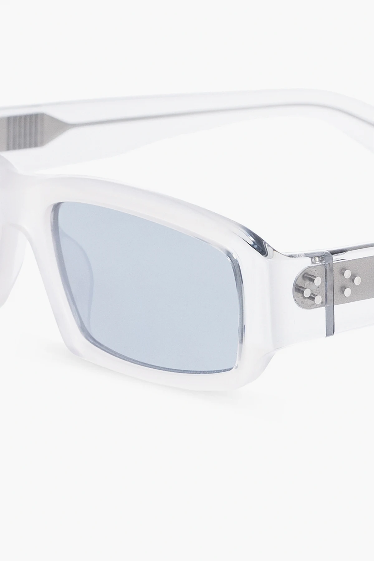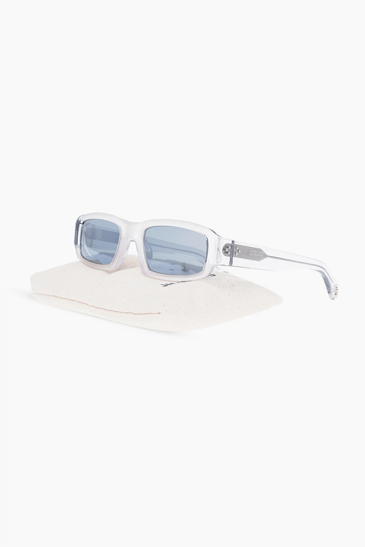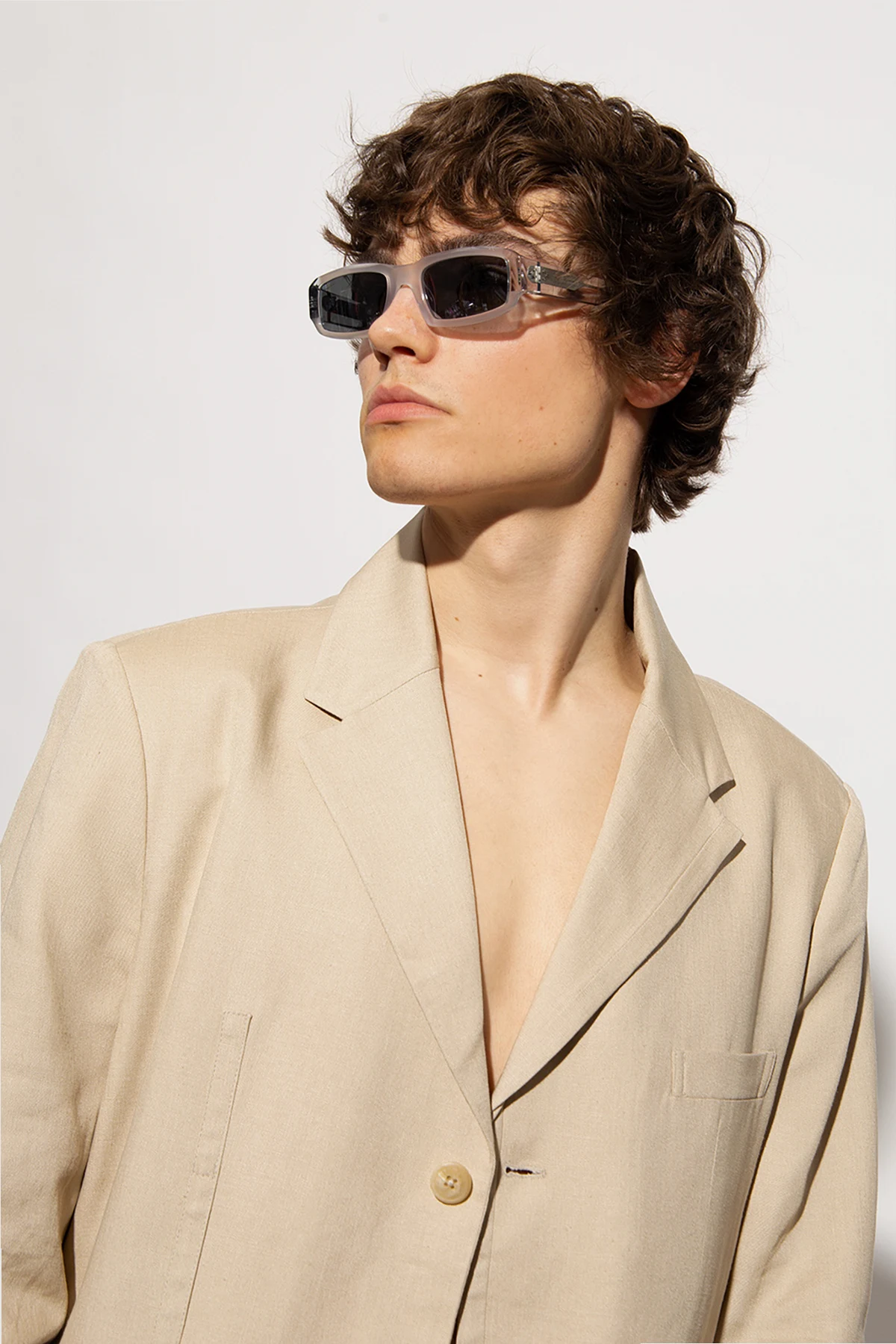Szare okulary przeciwsłoneczne, model ‘Altu’ Jacquemus. Zauszniki zakończone okrągłym wycięciem umożliwiające dopięcie biżuterii. Metalowe wykończenie w kolorze srebrnym. Szare, lustrzane, certyfikowane soczewki 100% UVA/UVB. Dołączone etui.