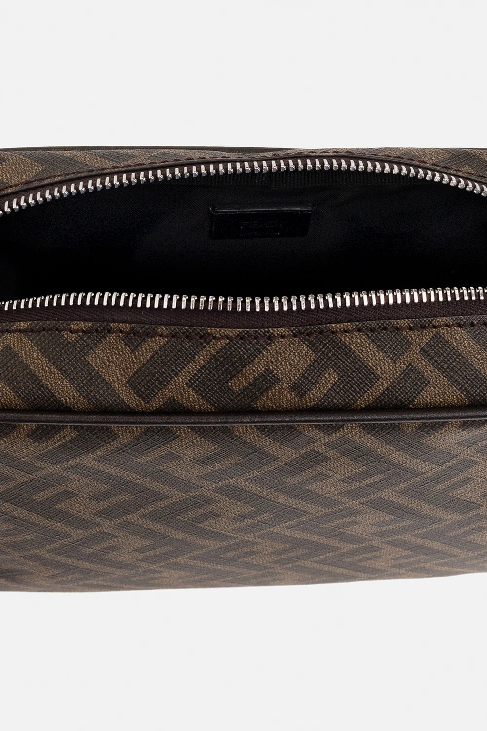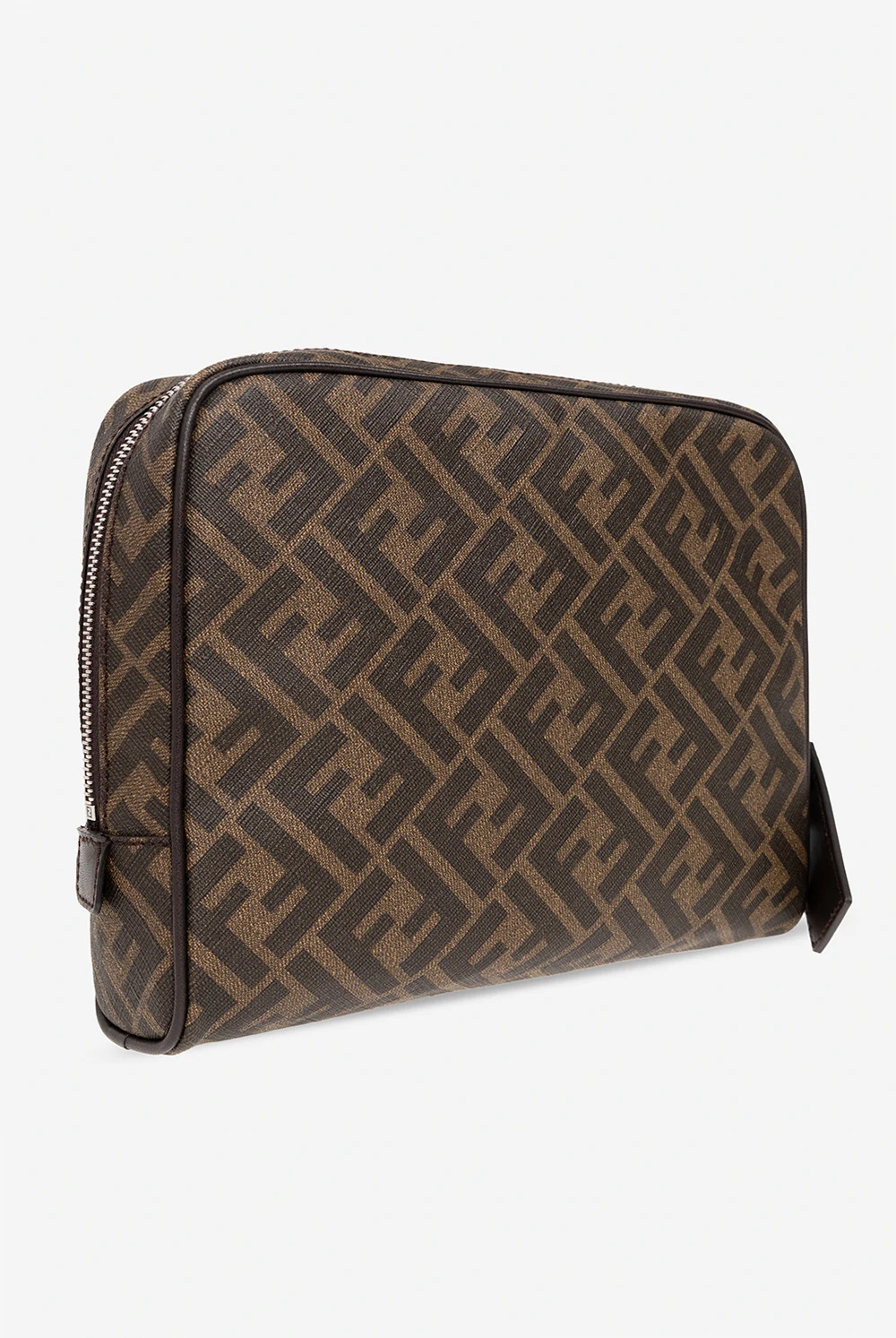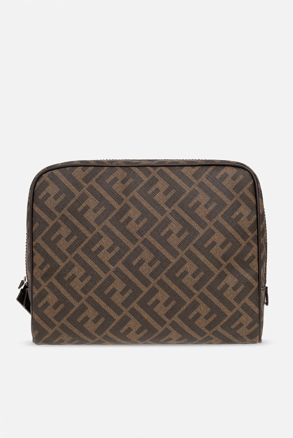 Brązowa kosmetyczka Fendi. Wykonana z powlekanego płótna ozdobionego wzorem z monogramem ‘FF’ i wykończona skóra cielęcą. Zamykana na zamek zakończony zawieszką z wytłoczonym logo. Wewnątrz komora z dwiema wsuwanymi kieszeniami. Metalowe wykończenie w kolorze srebrnym.