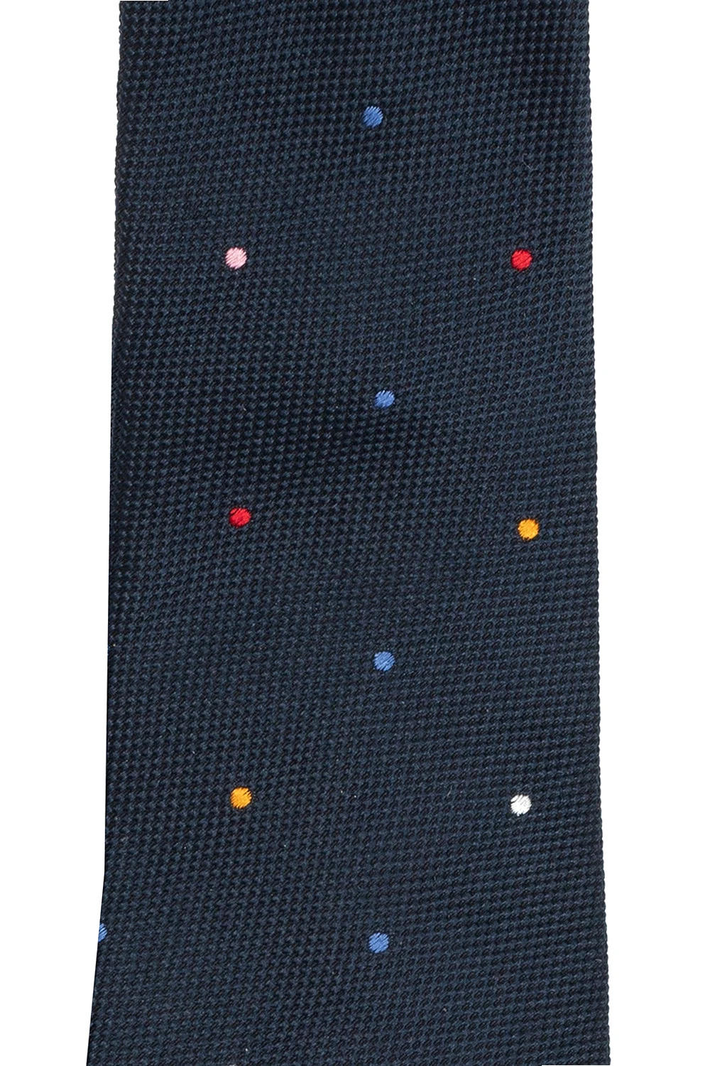 Granatowy, jedwabny krawat Paul Smith. Ozdobiony kolorowo wyszytym wzorem w kropki.