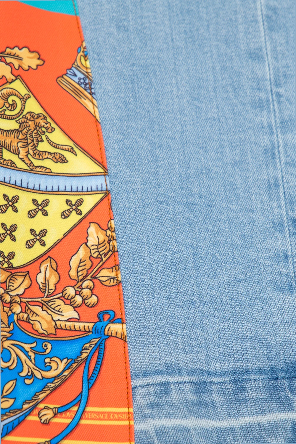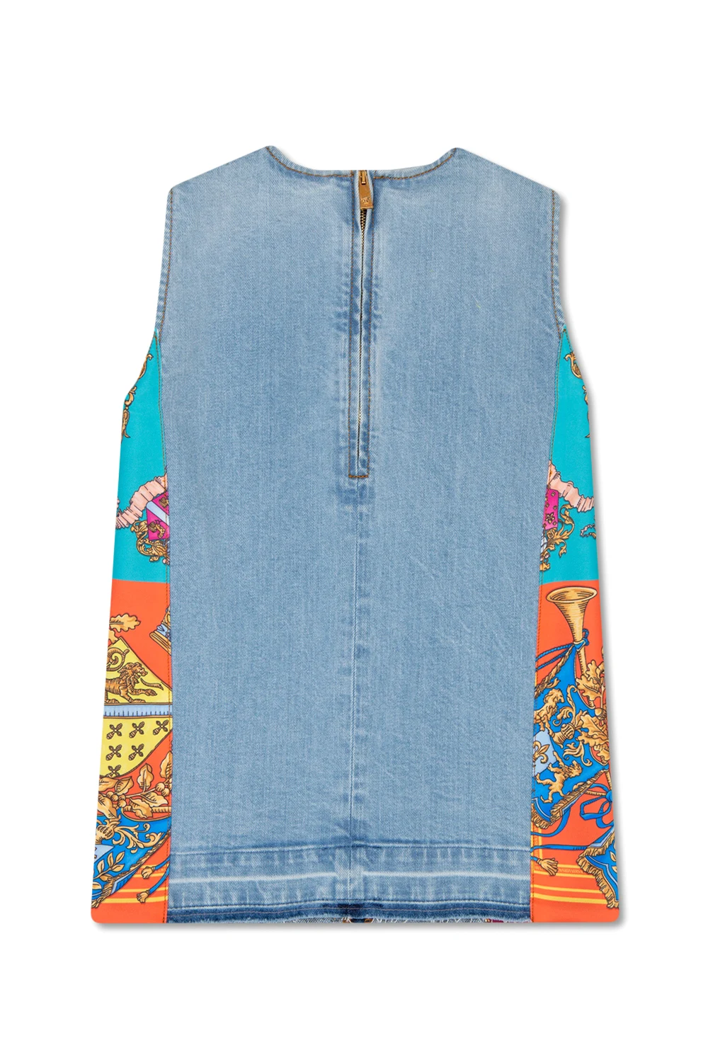Niebieska, jeansowa sukienka bez rękawów Versace Kid. Wykonana z bawełny. Zapinana z tyłu na zamek. Okrągły dekolt. Surowo wykończony dół sukienki. Kolorowe, materiałowe wstawki ozdobione nadrukiem ‘Royal Rebellion’.