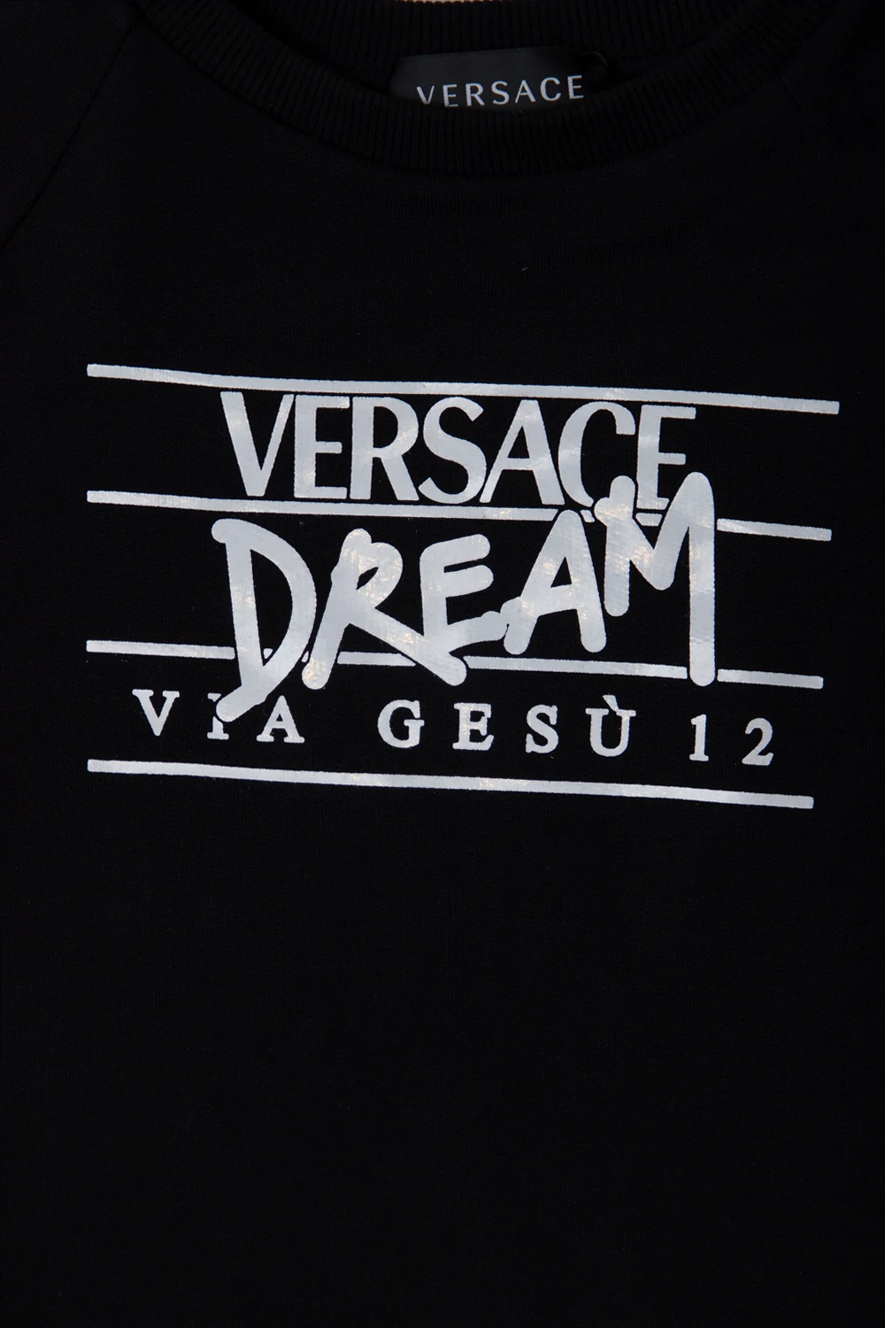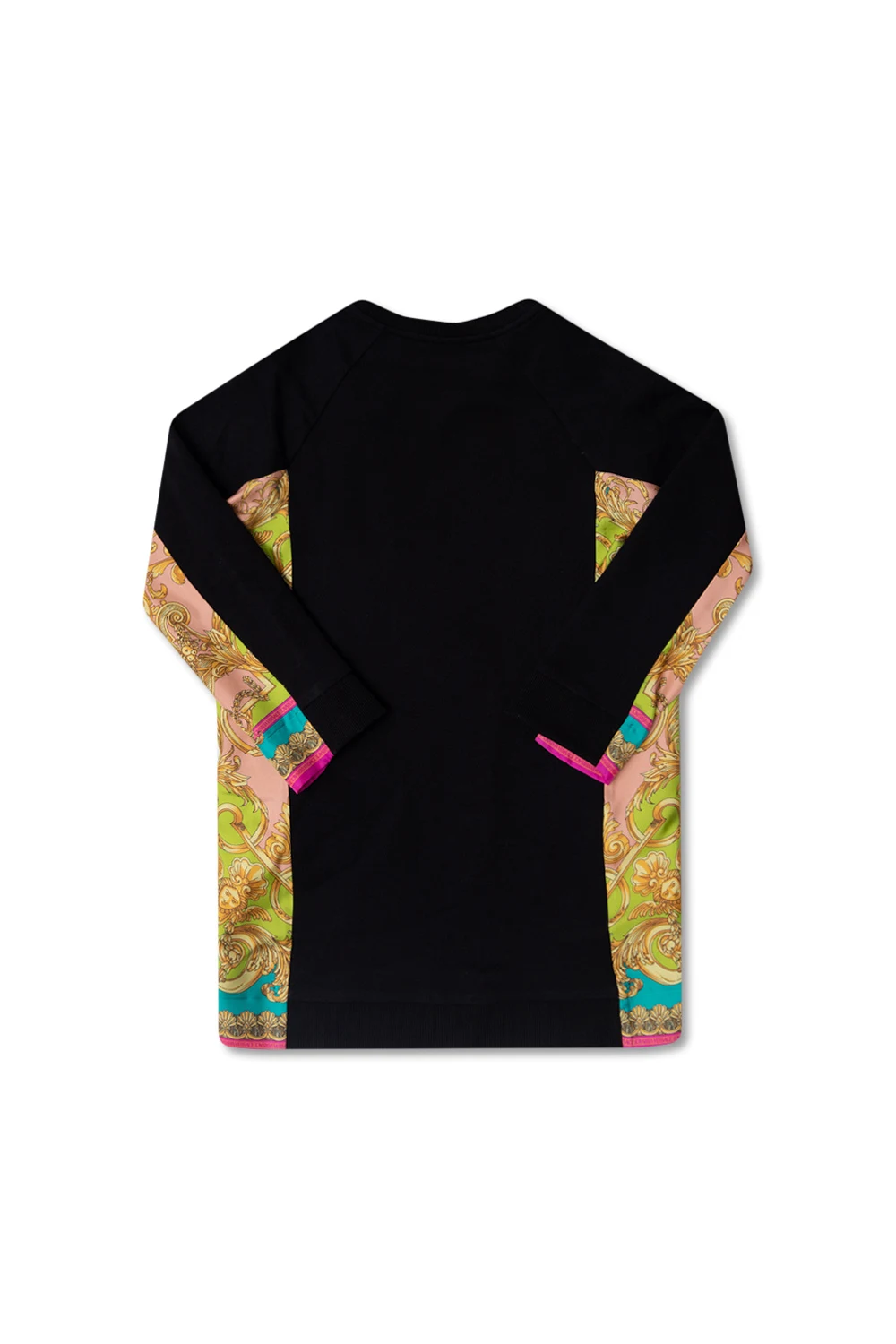 Czarna sukienka Versace Kid. Wykonana z bawełny i jedwabiu. Ozdobiona białym nadrukiem ‘Dream via Gesu’ i kolorowym ‘Barocco Goddess’. Okrągły dekolt. Długie rękawy.