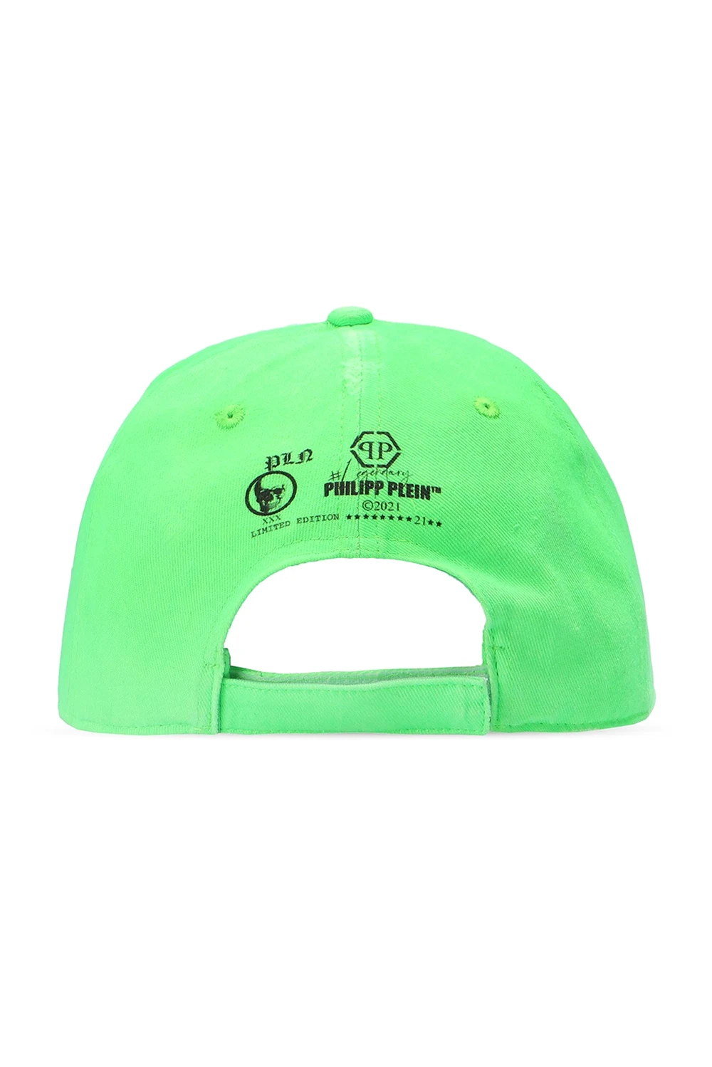 Neonowozielona czapka z daszkiem Philipp Plein. Wykonana z bawełny. Naszywka w kolorze czarnym oraz metalowa aplikacja z logo w kolorze srebrnym. Z tyłu pasek zapinany na rzep.