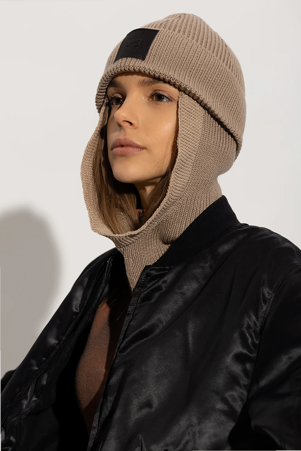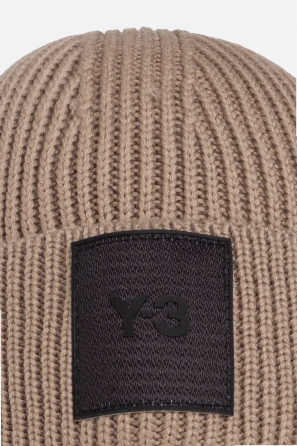 Beżowa, pleciona kominiarka Y-3 Yohji Yamamoto. Wykonana z wełny merynosów. Z przodu naszywka z wypukłym logo w kolorze czarnym.