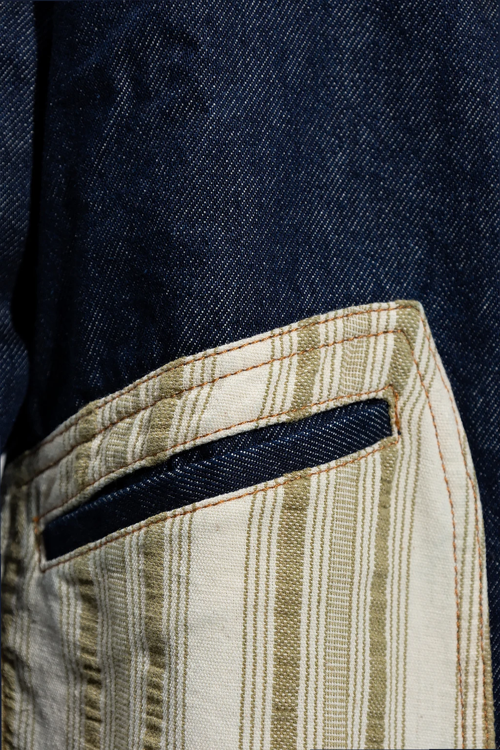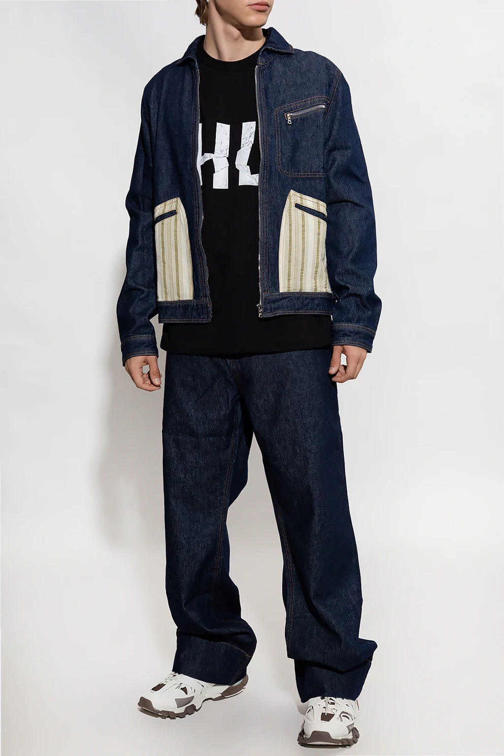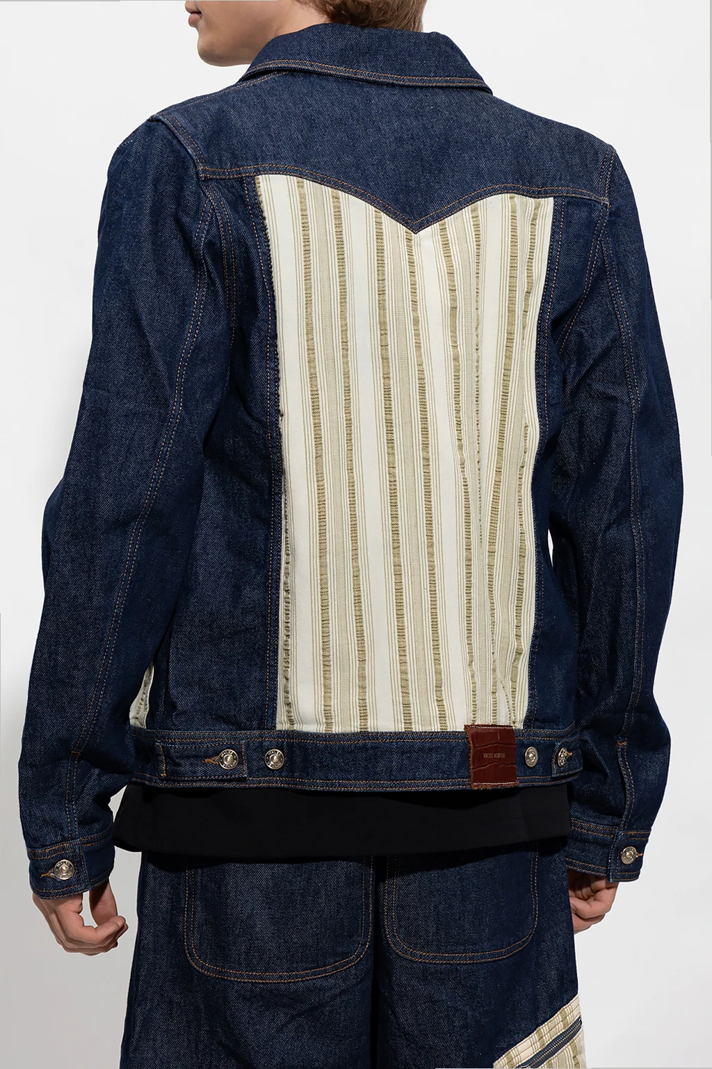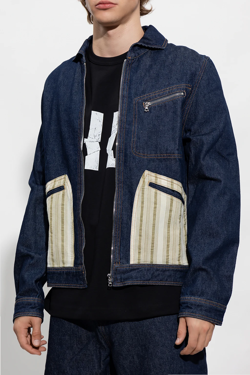 Granatowa kurtka jeansowa, model 'Miles’ Wales Bonner. Wykonana z bawełny. Zapinana na zamek. Kremowo-zielone materiałowe wstawki ze wzorem w paski. Z przodu trzy kieszenie, jedna zapinana na zamek. Dekolt z kołnierzem. Długie rękawy, mankiety zapinane na guzik.