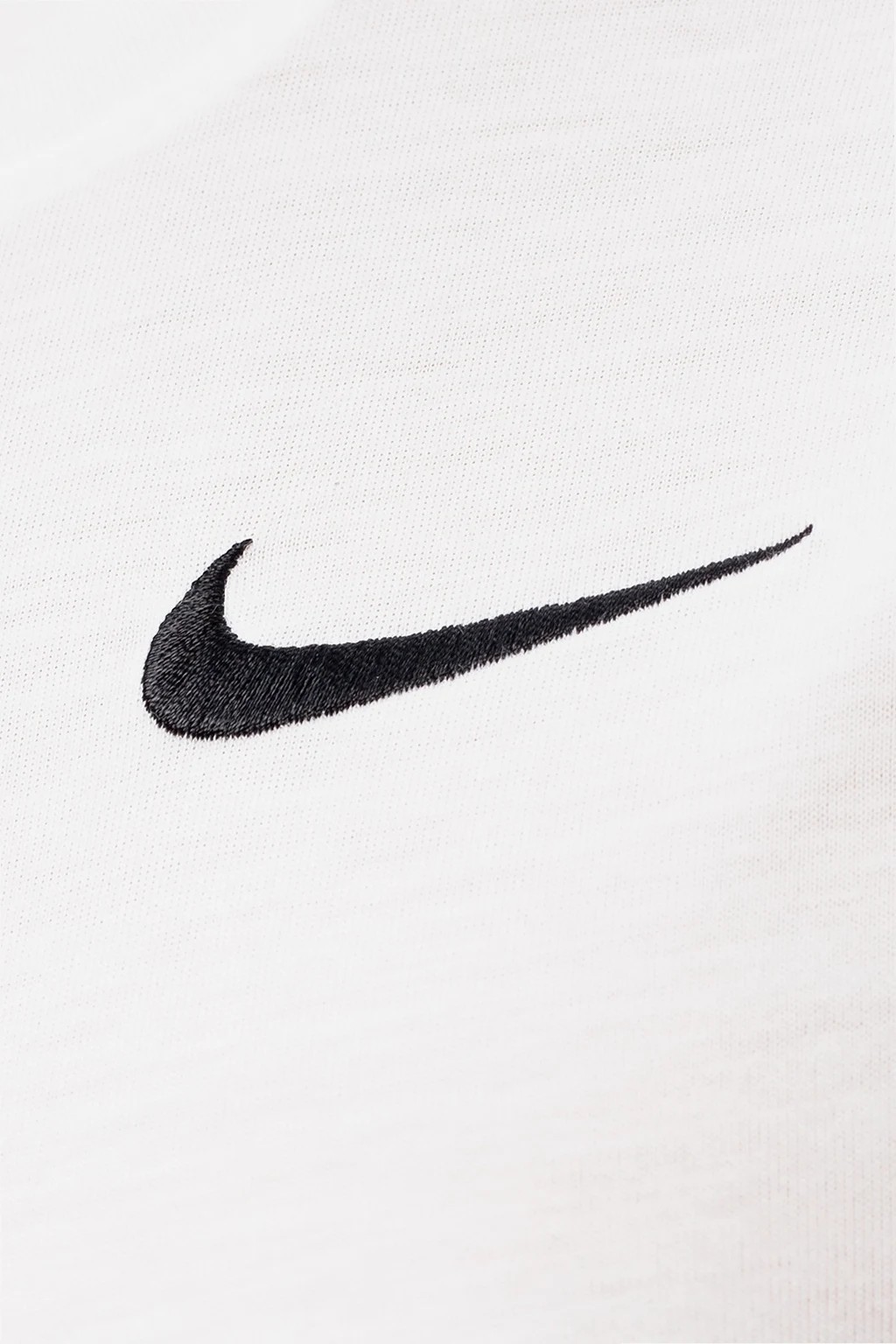 Biały, krótki t-shirt Nike. Wyszyte logo w kolorze czarnym oraz szarym. Okrągły dekolt.