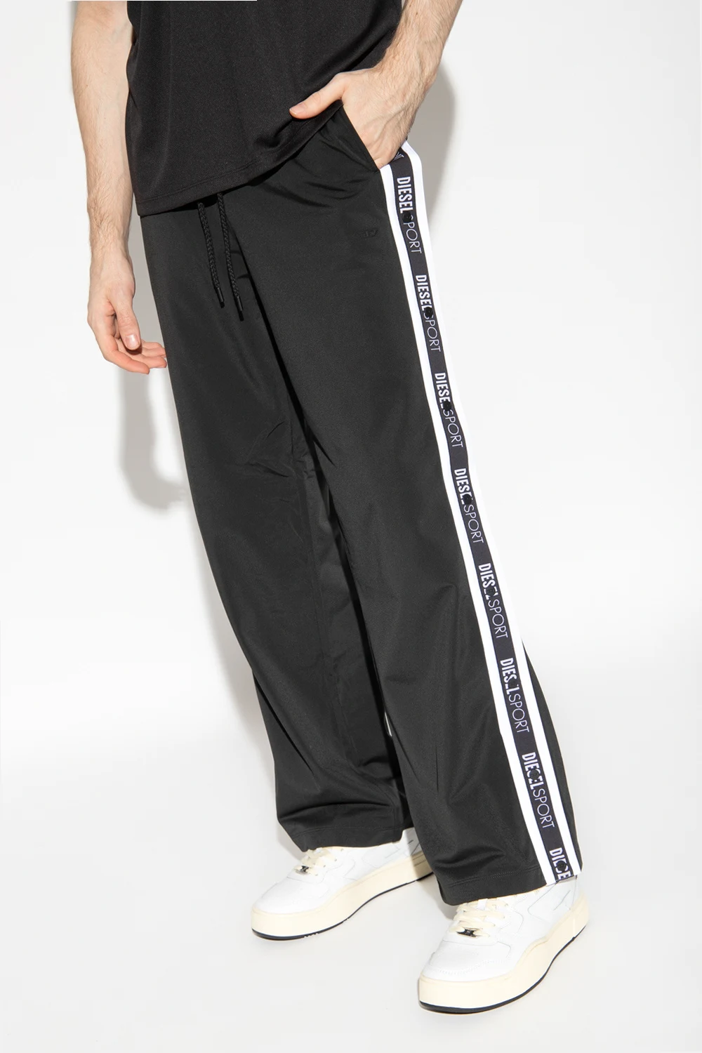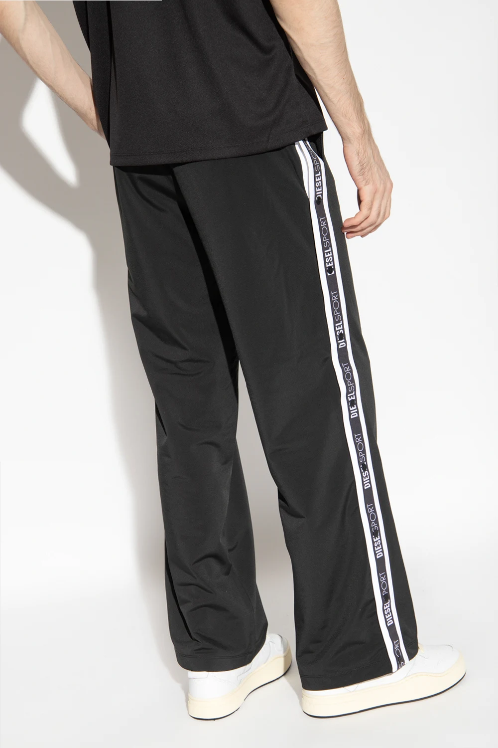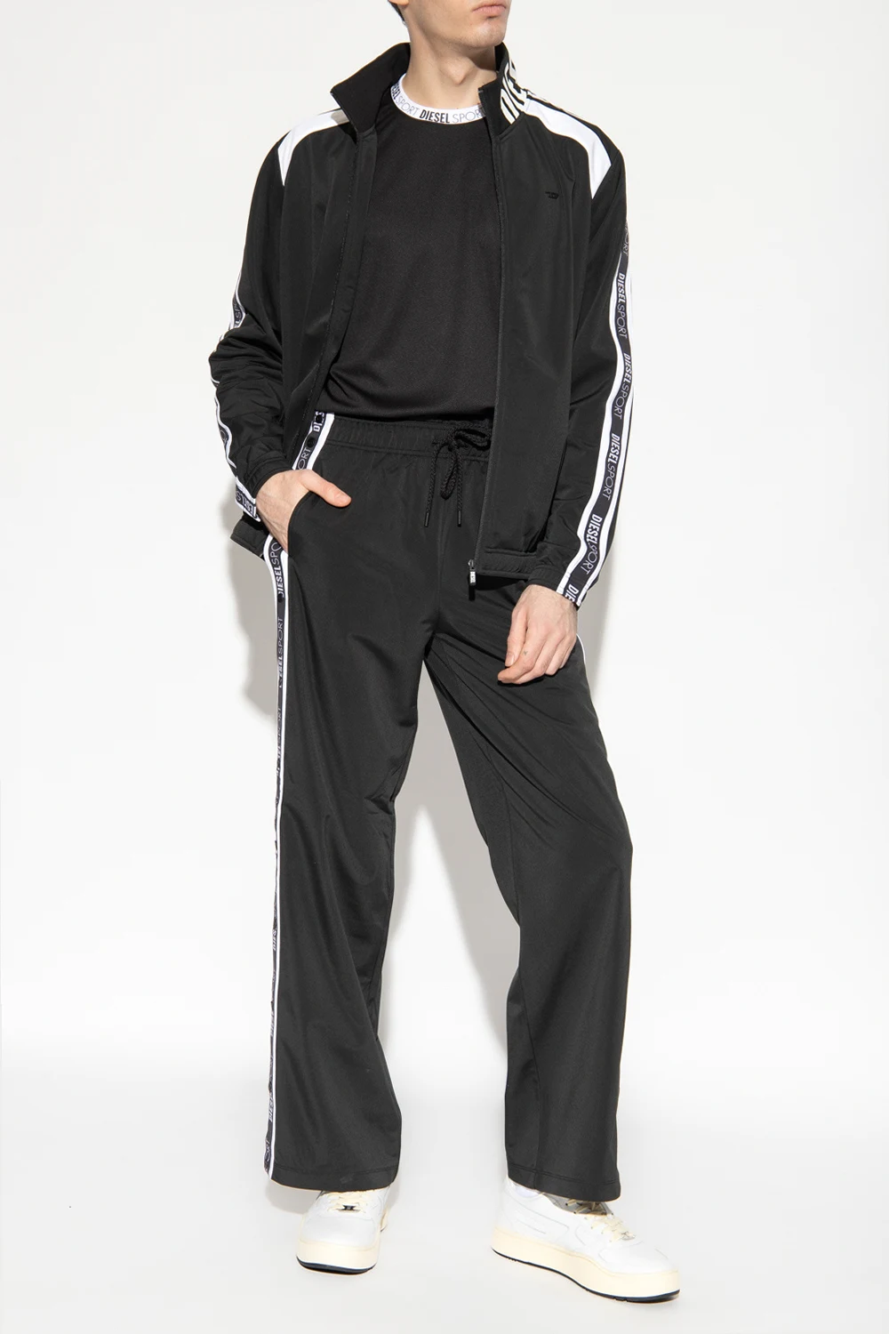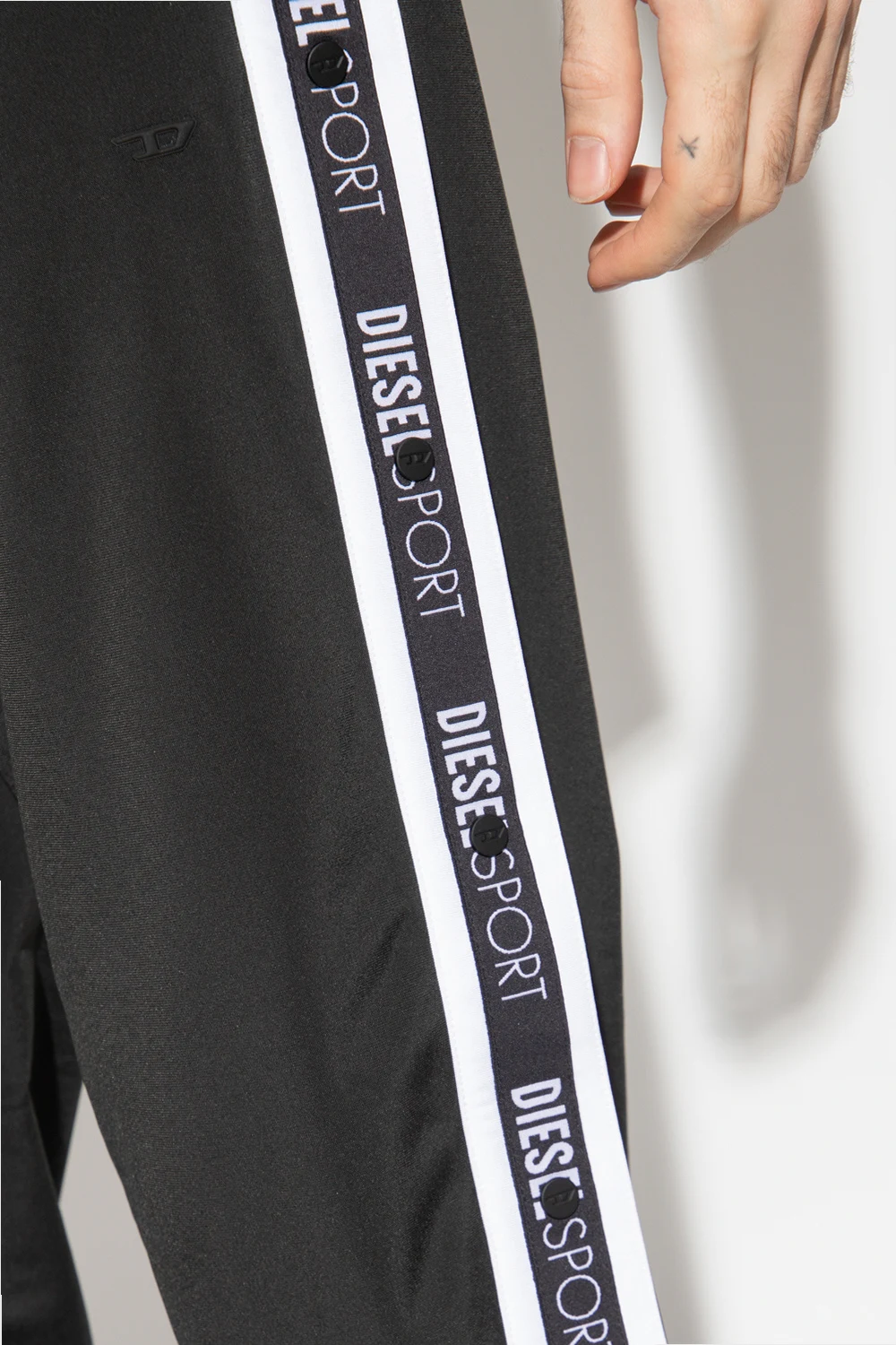 Czarno-białe spodnie, model 'AMSB-HORACE-HT14' Diesel, kolekcja ‘DIESEL SPORT’. W pasie wszyta guma ściągana trokami. Ozdobione lampasami z logo. Z przodu dwie wsuwane kieszenie. Długie nogawki po bokach zapinane na zatrzaski.