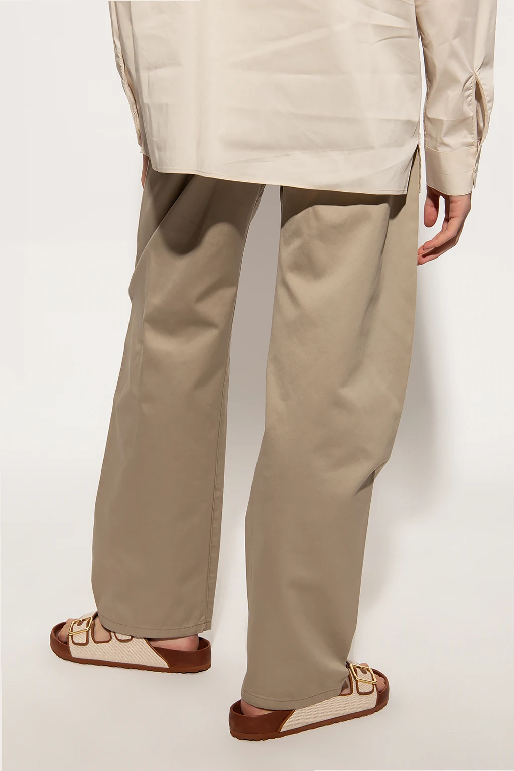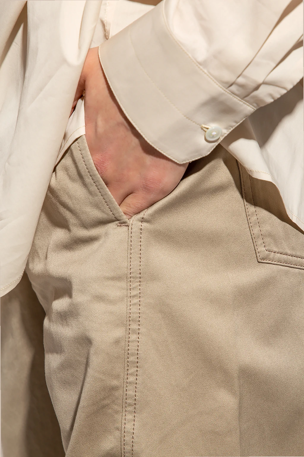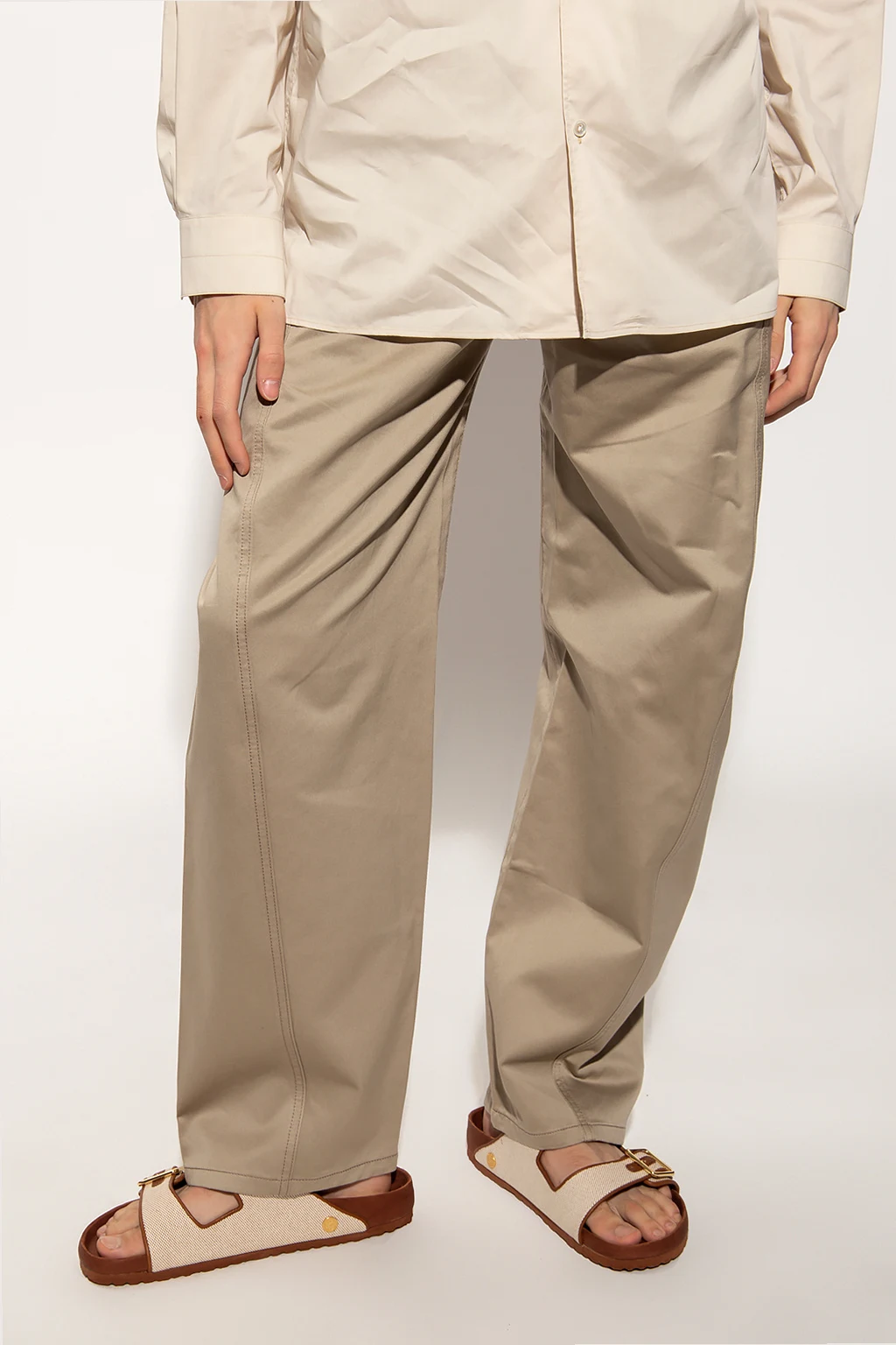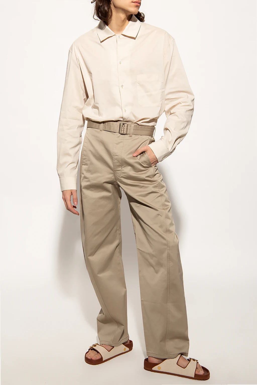 Beżowoszare spodnie o luźnym kroju Lemaire. Wykonane ze sztywnej bawełny o lekkim połysku. Zapinane na guzik, zamek oraz zaczep. W talii ściągany pas z klamrą. Cztery wsuwane kieszenie: po dwie z przodu oraz z tyłu. Zakrzywione dekoracyjne szwy, długie nogawki.