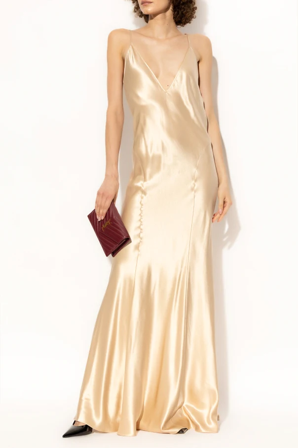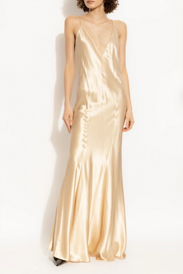 Przedstawiamy Jedwabną sukienkę na ramiączkach od renomowanego domu mody Saint Laurent. Ta wyjątkowa kreacja, uszyta z najwyższej jakości jedwabiu, zachwyca swoją gładką, lśniącą powierzchnią oraz minimalistycznym designem.