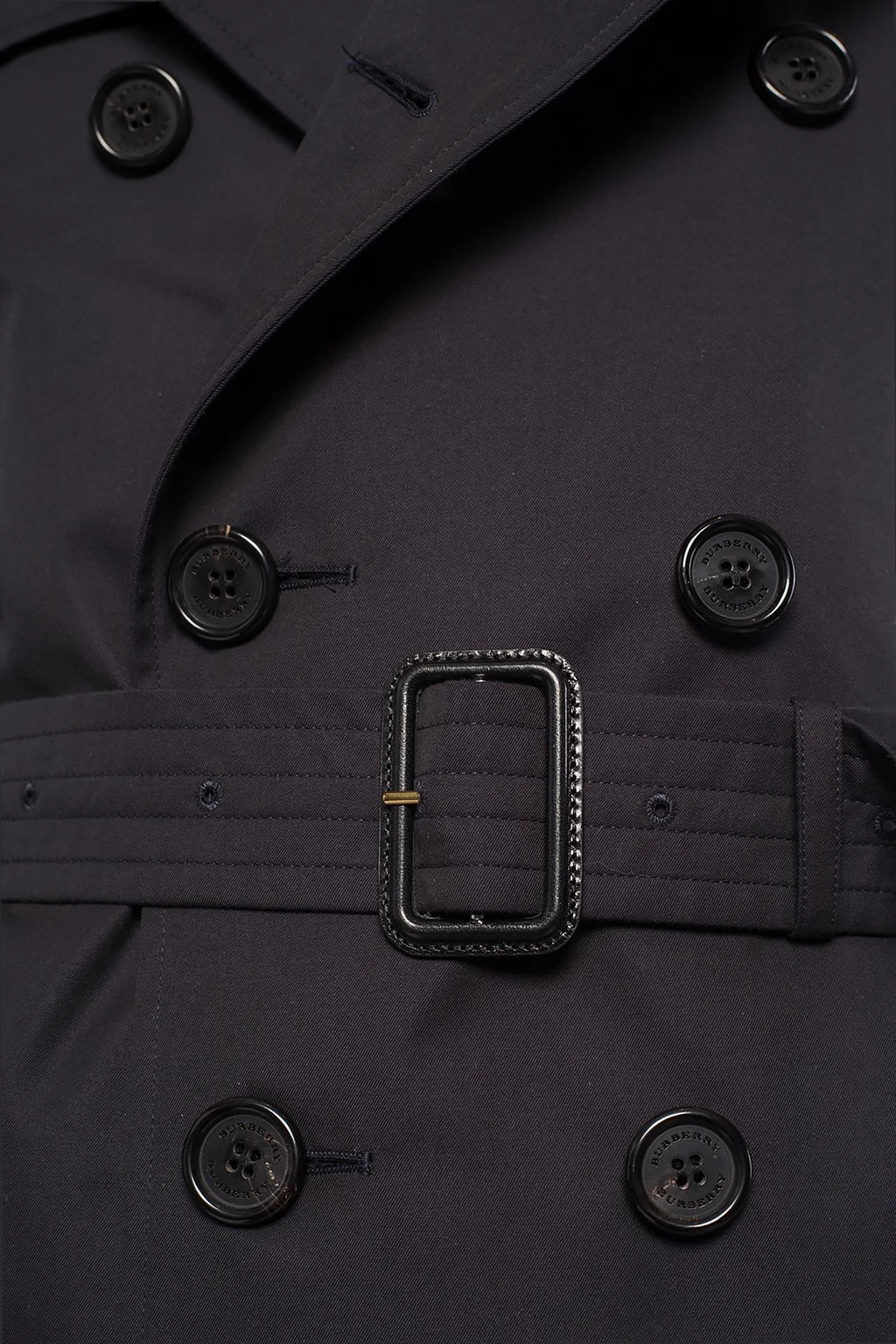 Czarny, bawełniany, dwurzędowy trencz, model 'The Kensington' Burberry. Zapinany na guziki. Na ramionach pagony. Z przodu dwie kieszenie zapinane na guziki. Z tyłu rozcięcie. W talii pasek z klamrą.