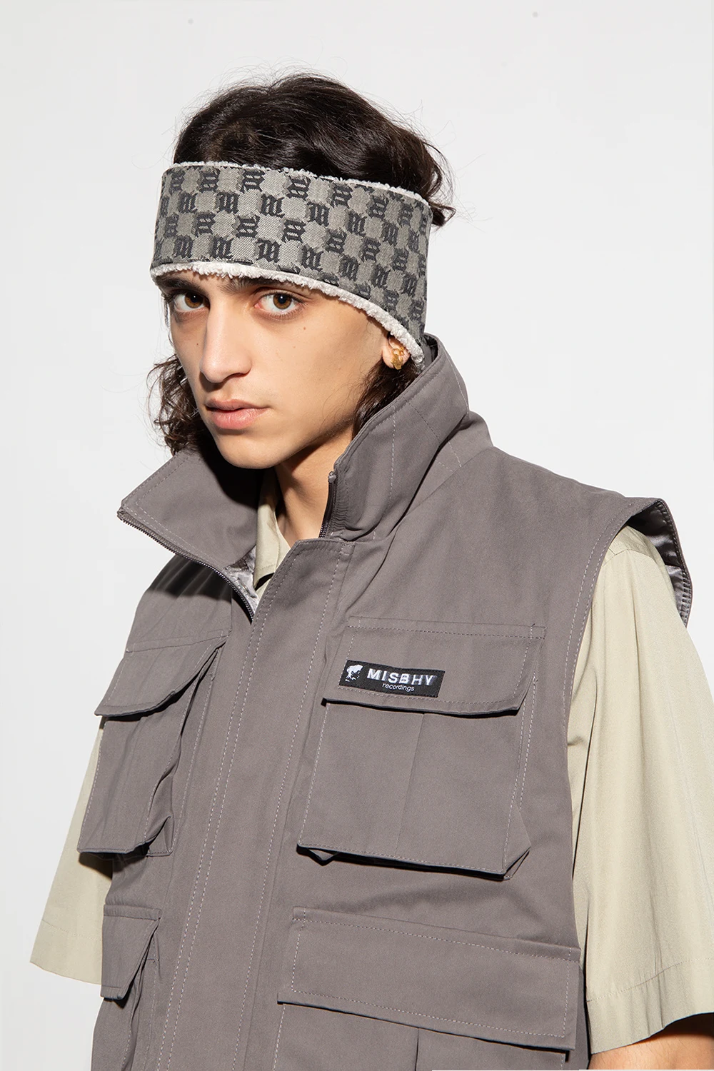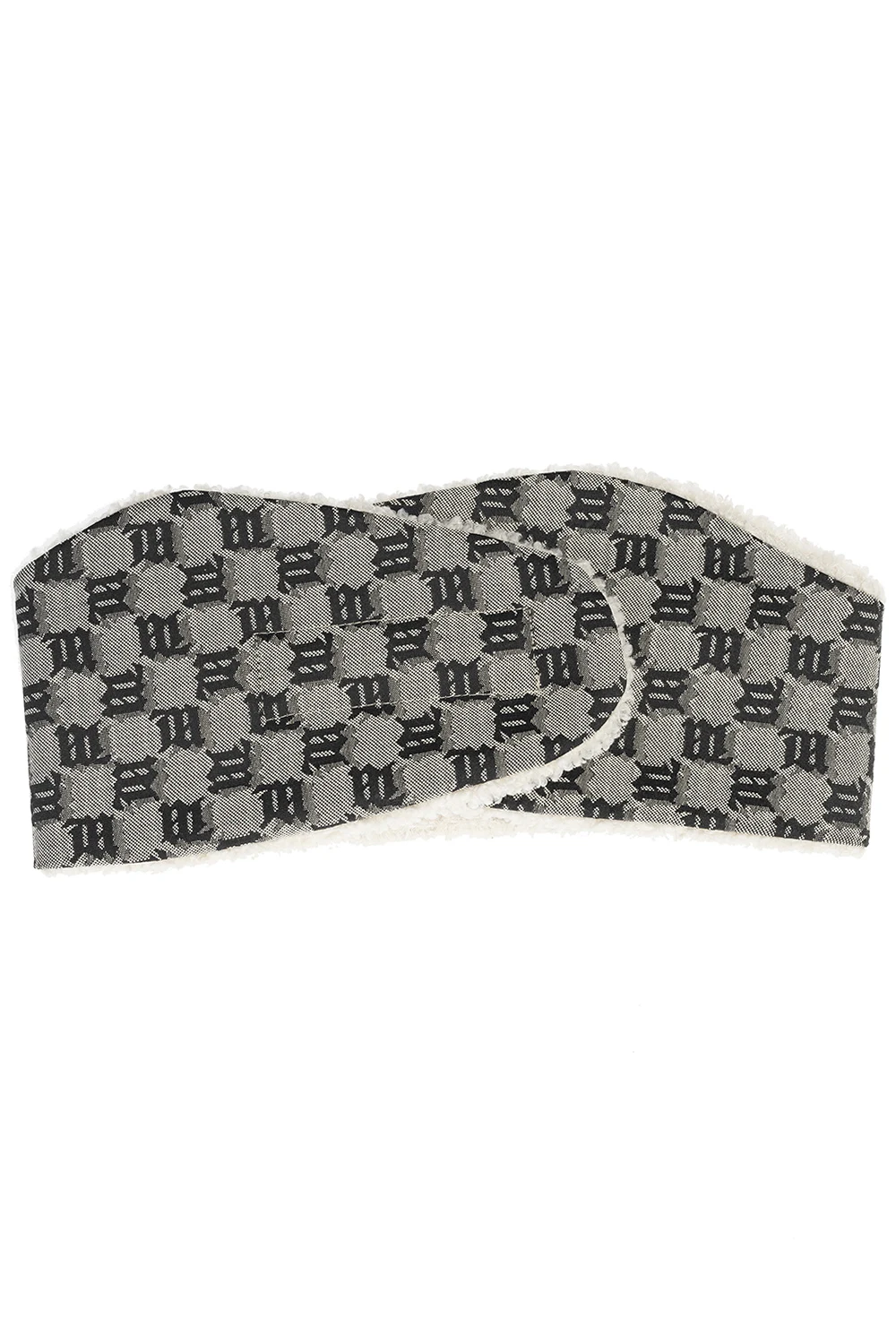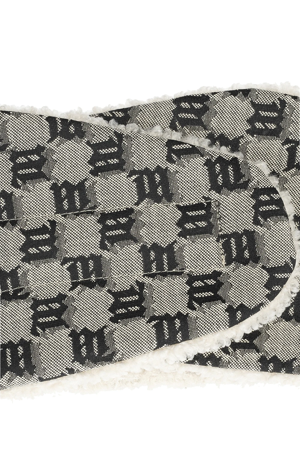 Beżowa opaska na głowę MISBHV. Zapinana na rzep. Ozdobiona monogramem z logo w kolorze czarnym. Warstwa wewnętrzna wykonana z materiału imitującego futro.