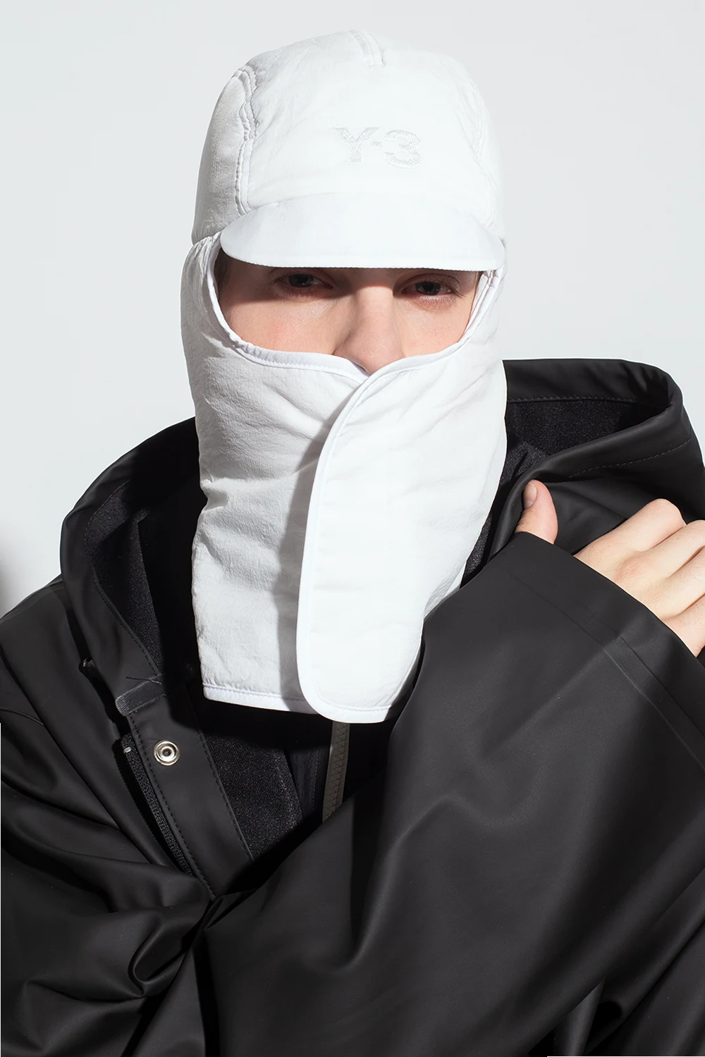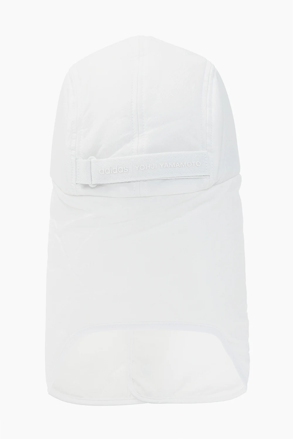 Biała czapka Y-3 Yohji Yamamoto. Z przodu wyszyte logo. Z tyłu regulowany pasek zapinany na rzep. Nauszniki zapinane na zatrzaski.
