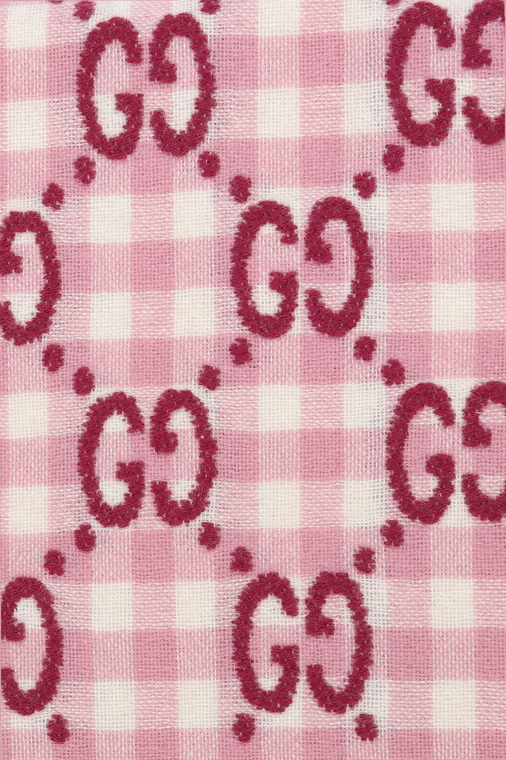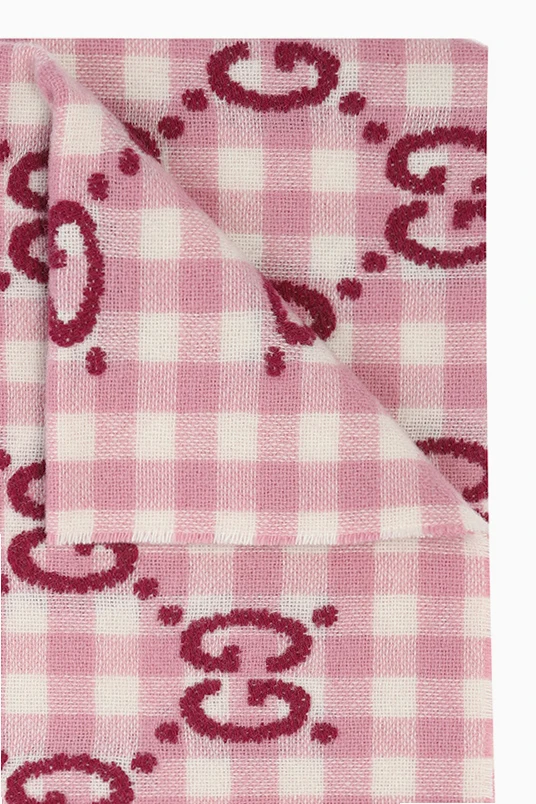 Różowo-biały koc Gucci Kids. Wykonany z wełny. Ozdobiony wzorem w kartę oraz wzorem z monogramem ‘GG’. Surowe wykończenie.