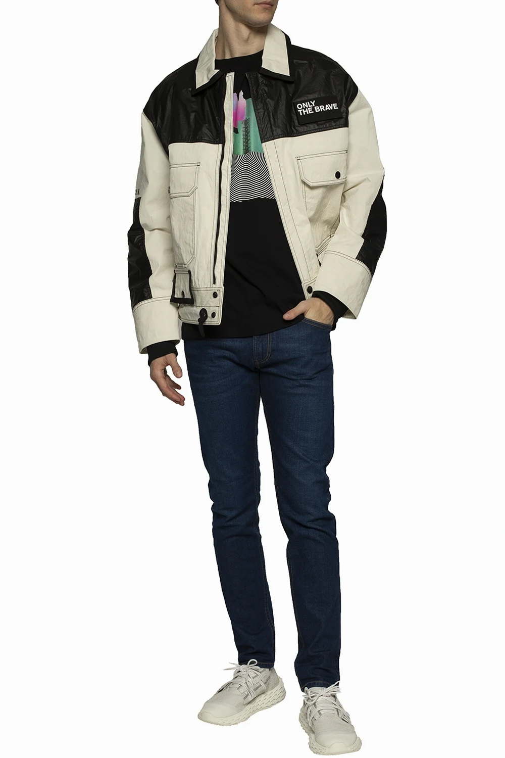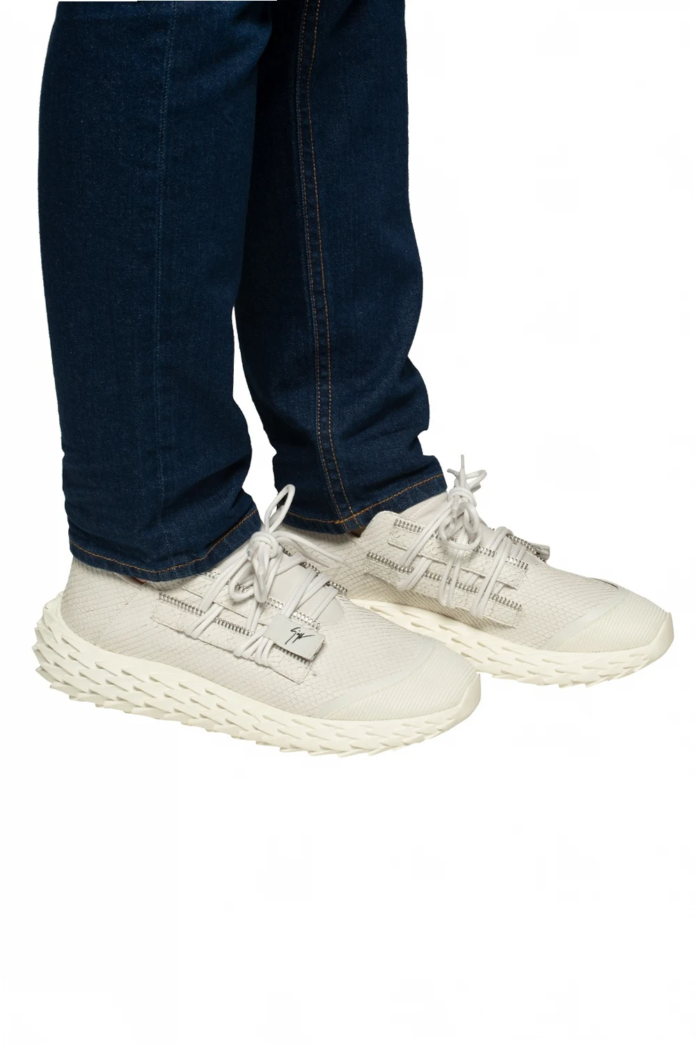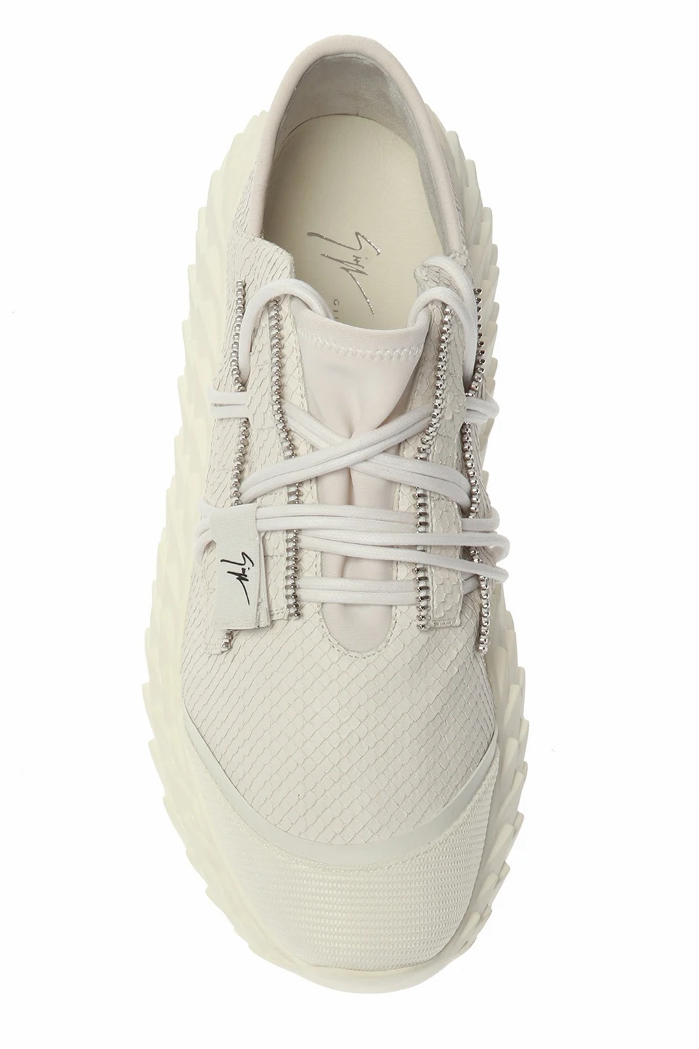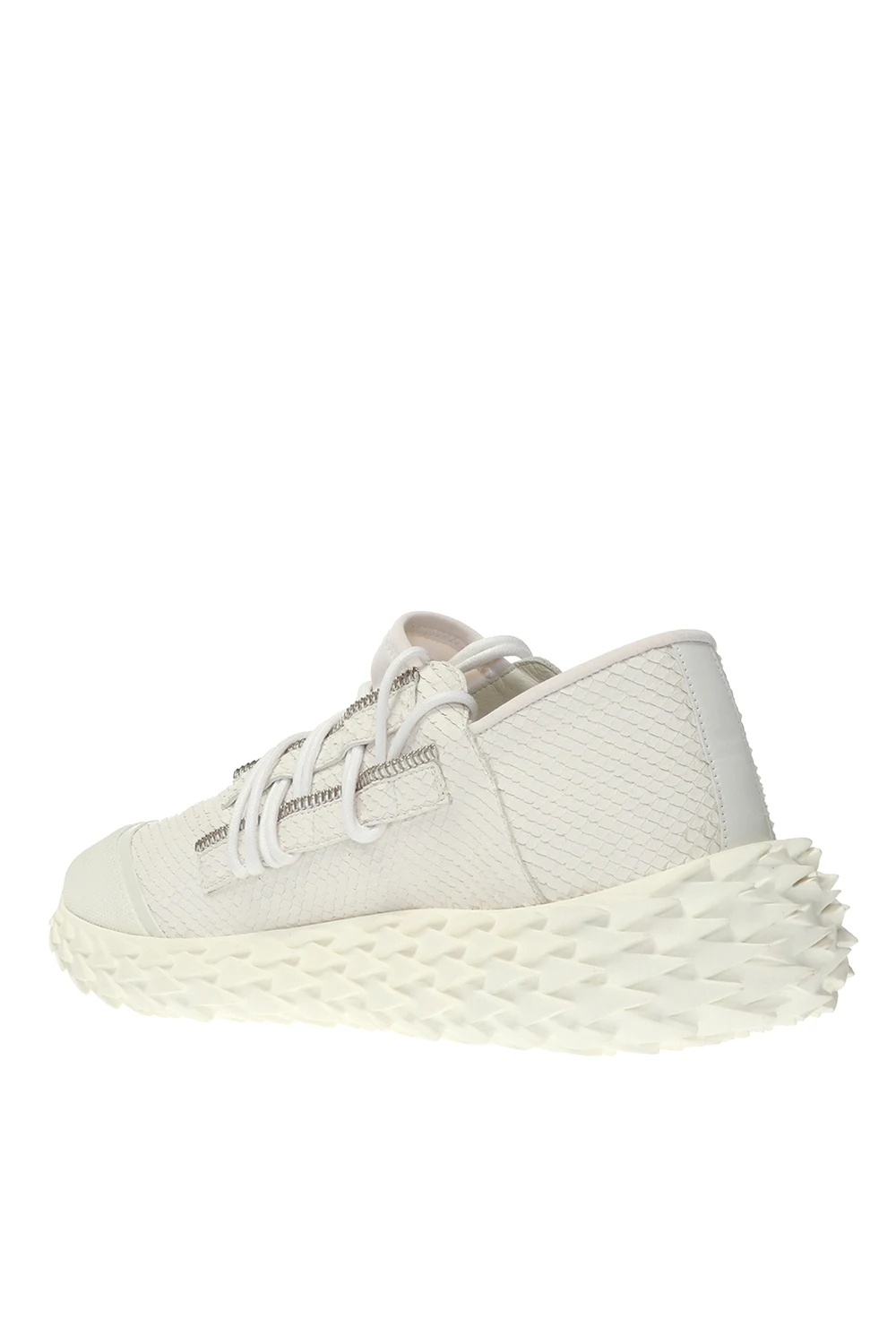 Białe, skórzane, sznurowane buty sportowe z wytłoczeniami na platformie, model 'Urchin' Giuseppe Zanotti. Gumowa podeszwa w kolorze srebrnym z wytłoczonym wzorem.