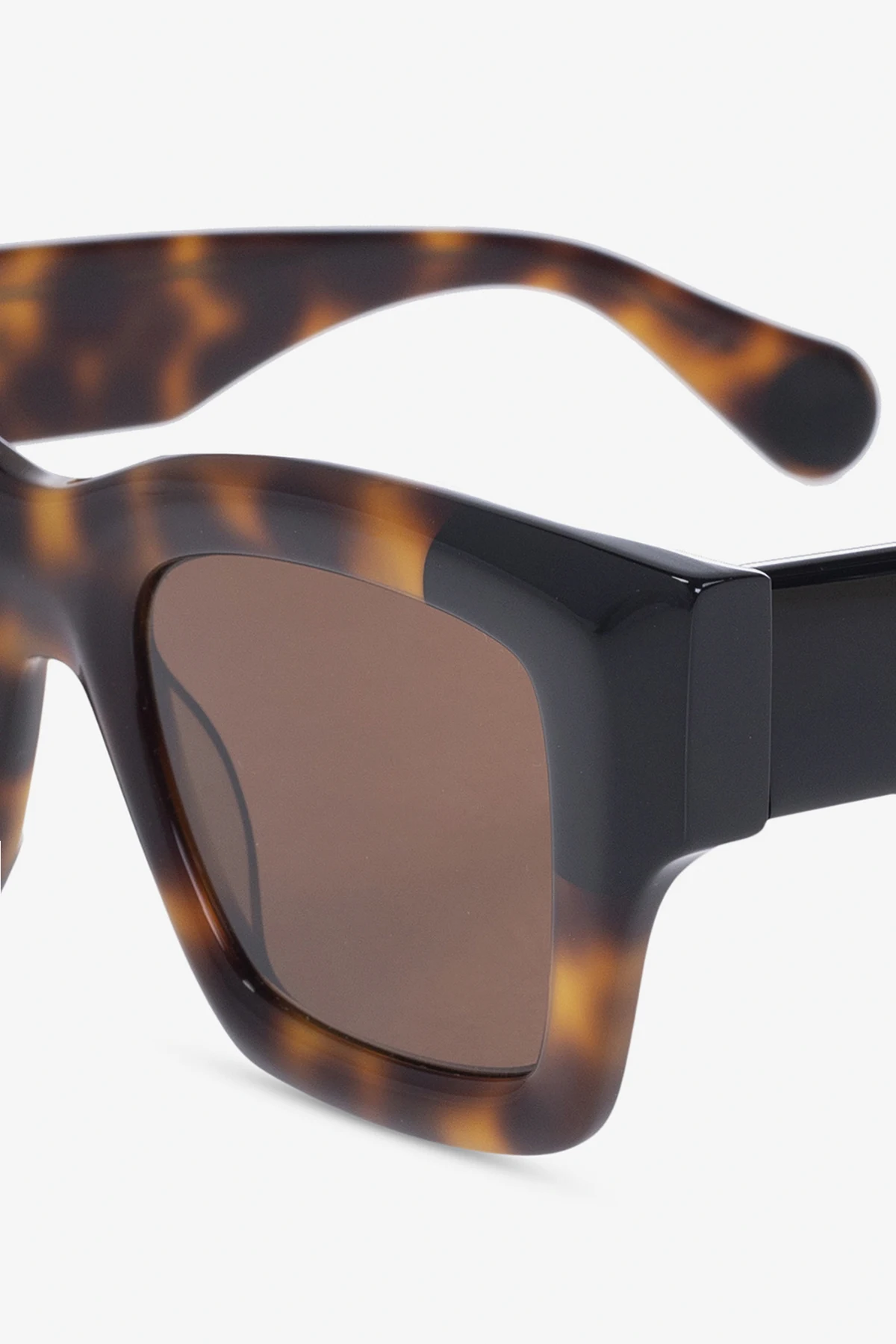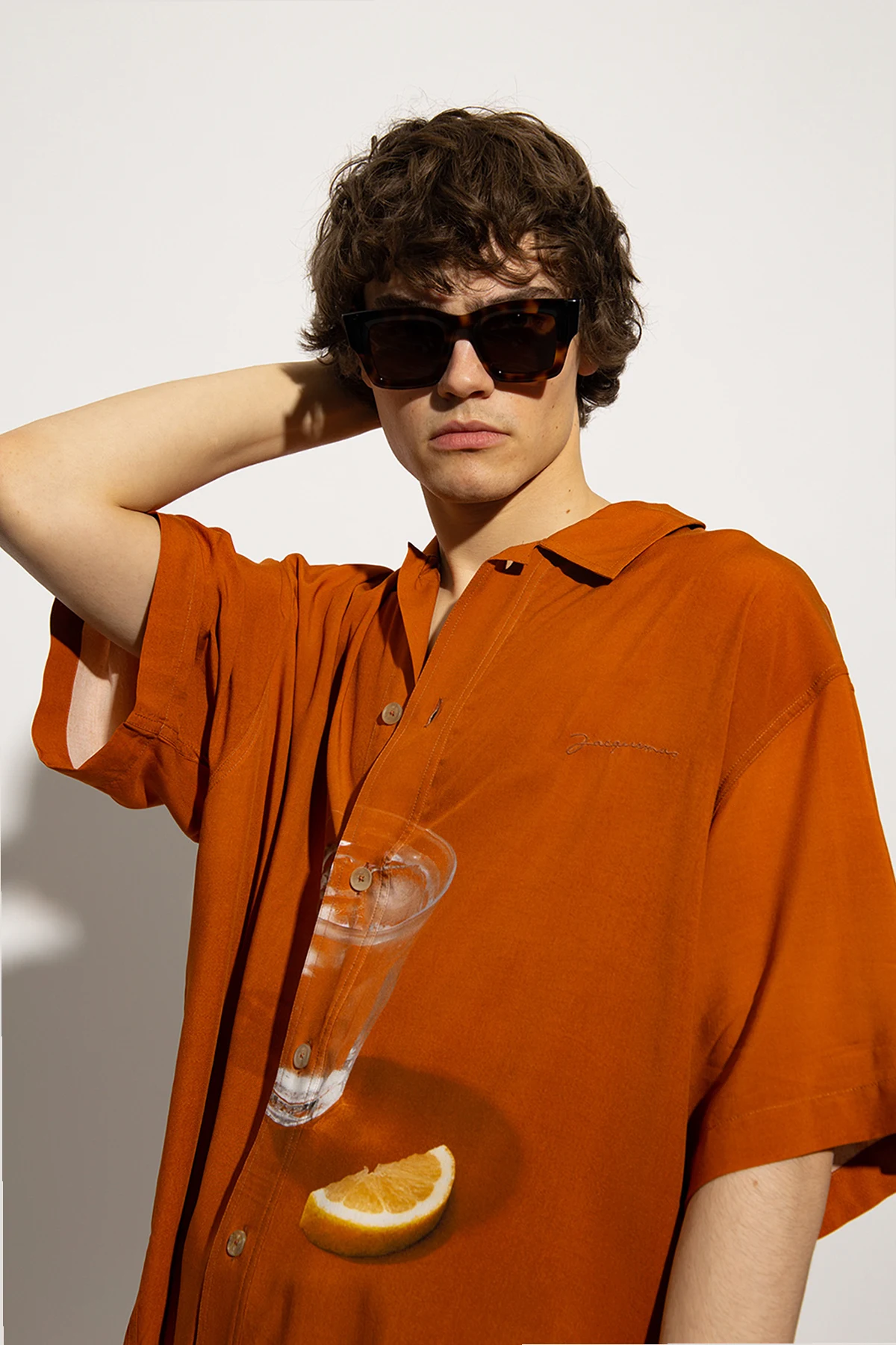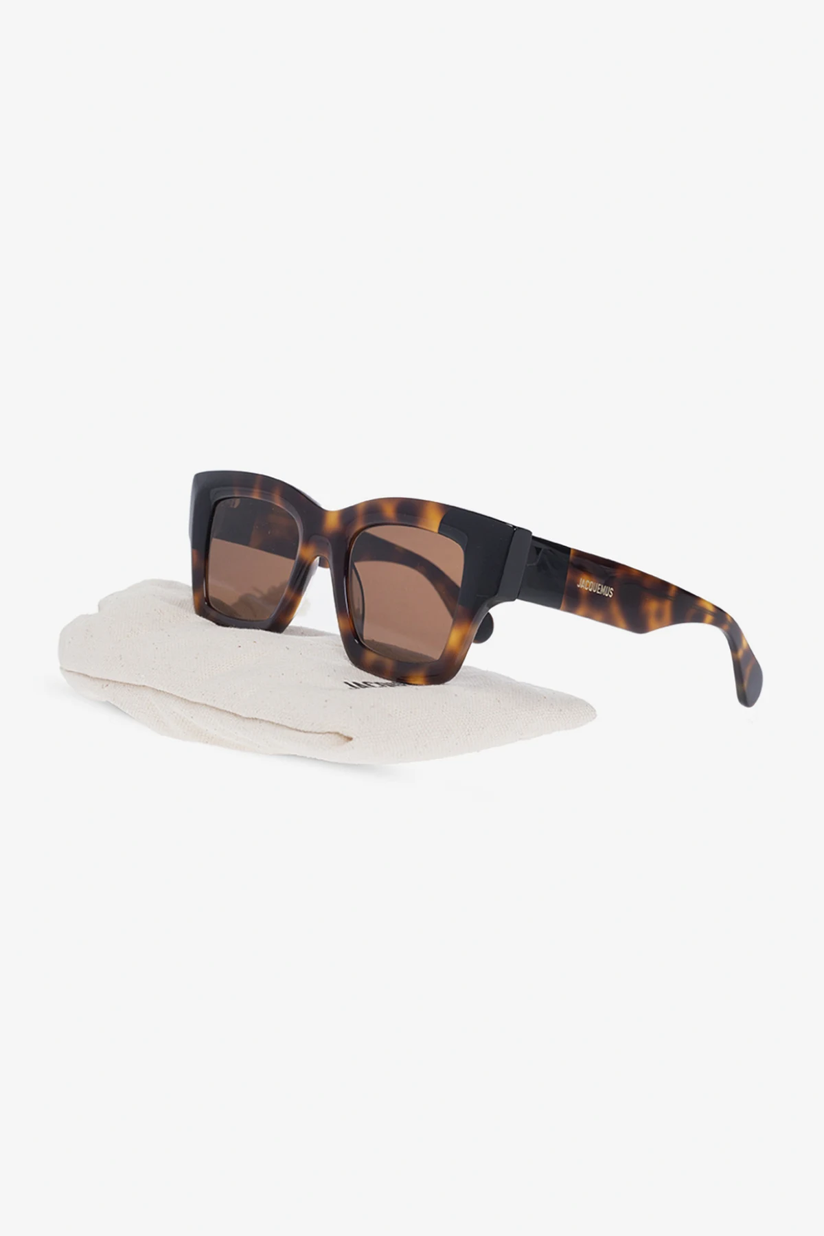 Brązowo-czarne okulary przeciwsłoneczne, model ‘Baci’ Jacquemus. Po bokach ozdobione logo w kolorze złotym. Brązowe, certyfikowane soczewki 100% UVA/UVB. Dołączone etui.