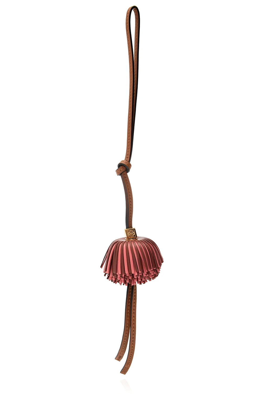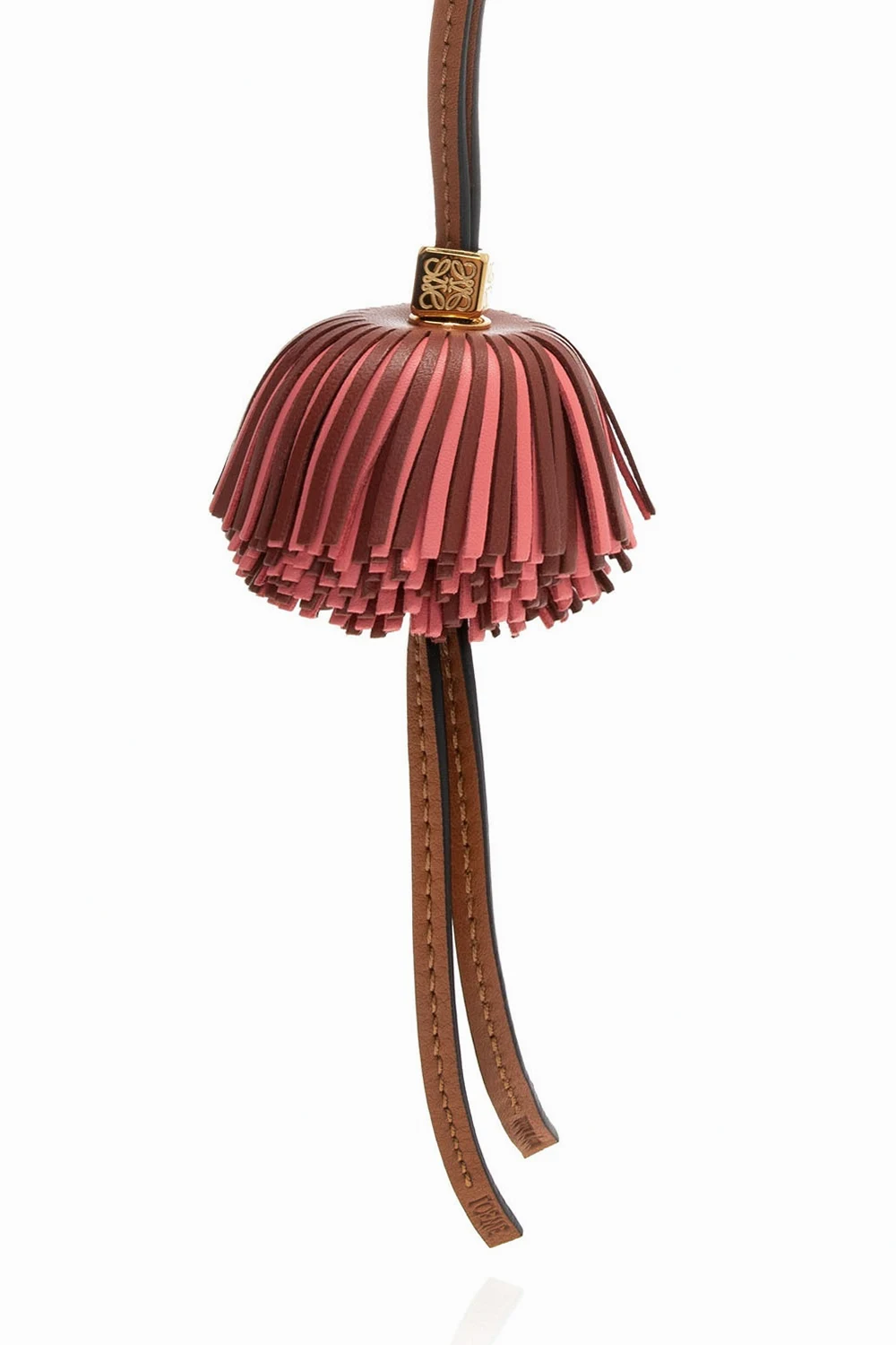Brązowa, skórzana zawieszka Loewe. Ozdobiona aplikacją z różowo-brązowymi frędzlami oraz wytłoczonym logo w kolorze złotym.