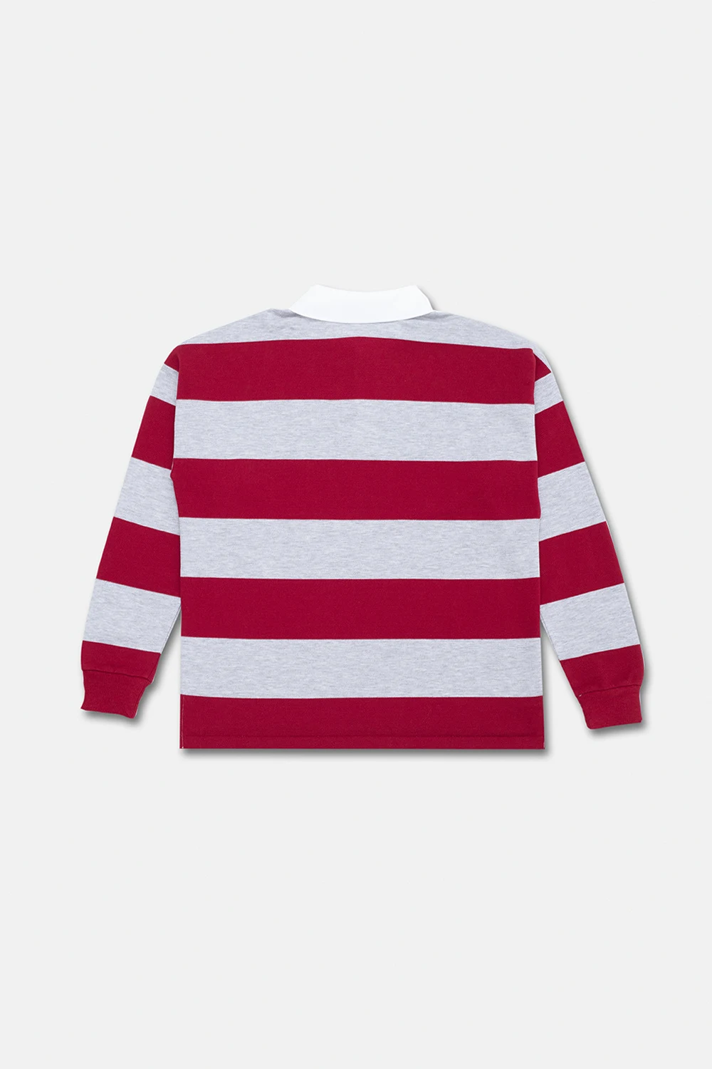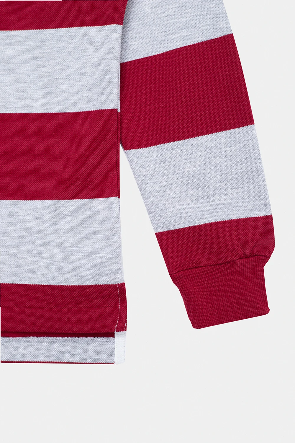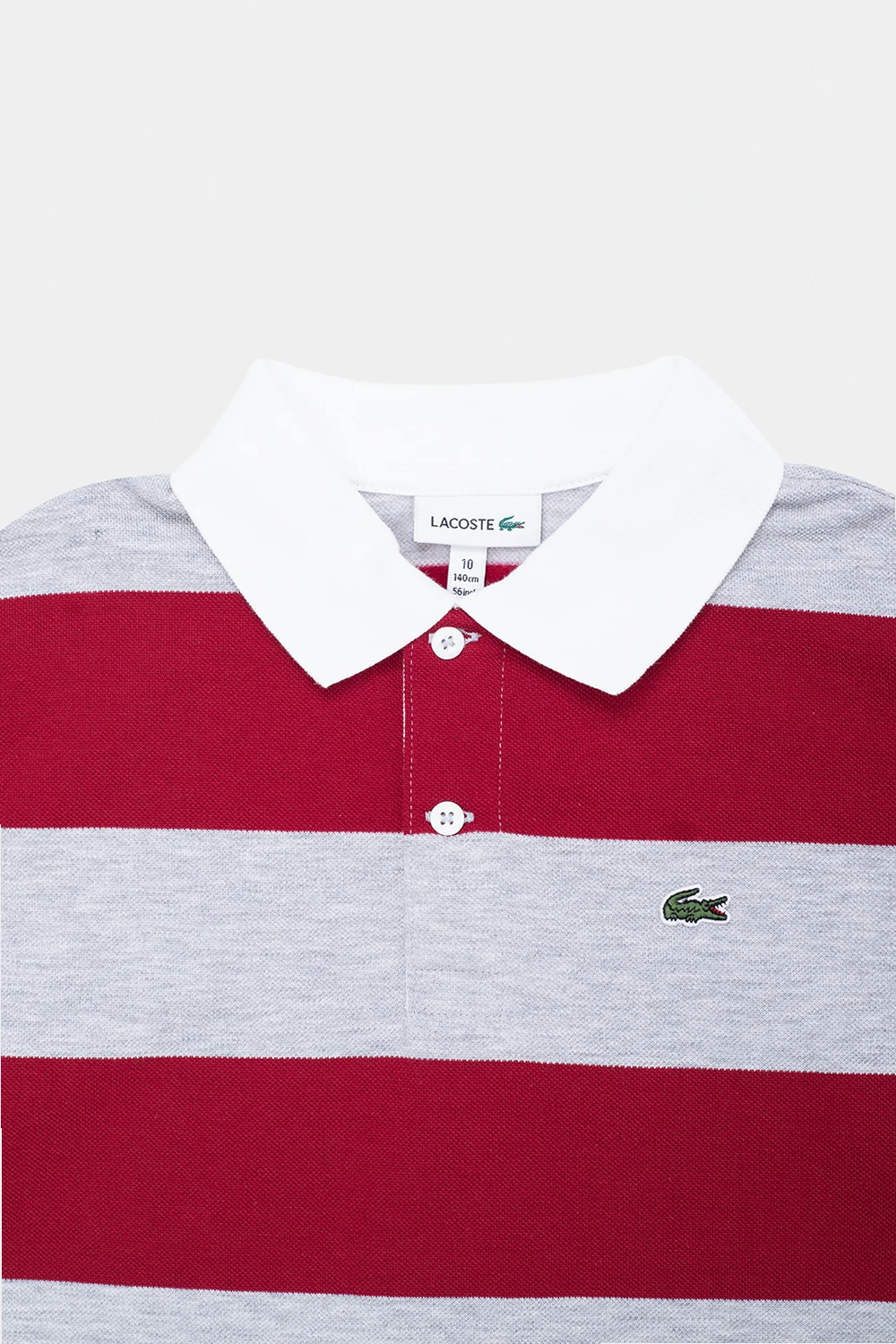 Szaro-czerwone polo Lacoste Kids. Wykonane z bawełny. Z przodu zapięcie na guziki oraz naszywka w kształcie logo. Ozdobione wzorem w pasy. Biały kołnierz. Długie rękawy zakończone ściągaczem.