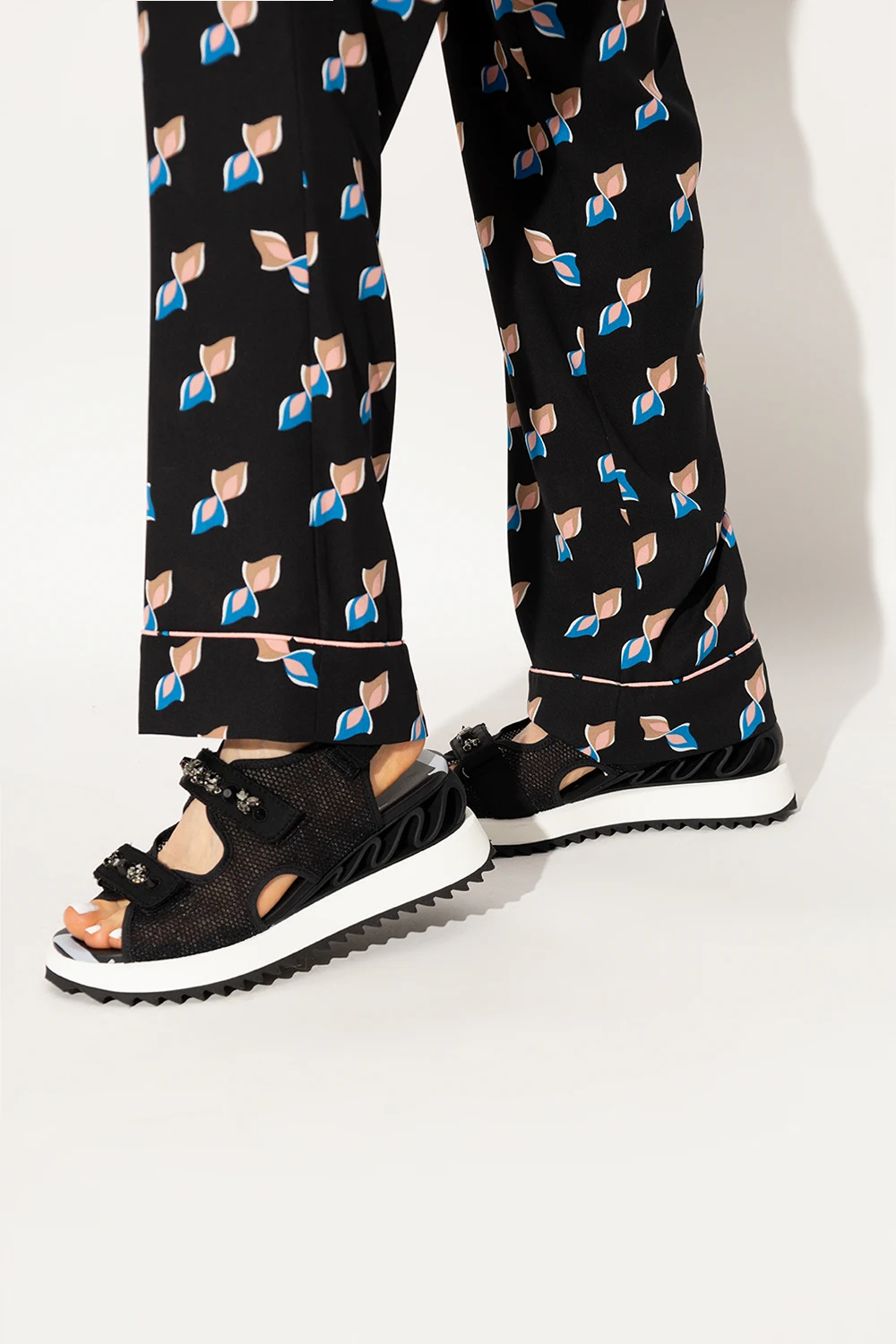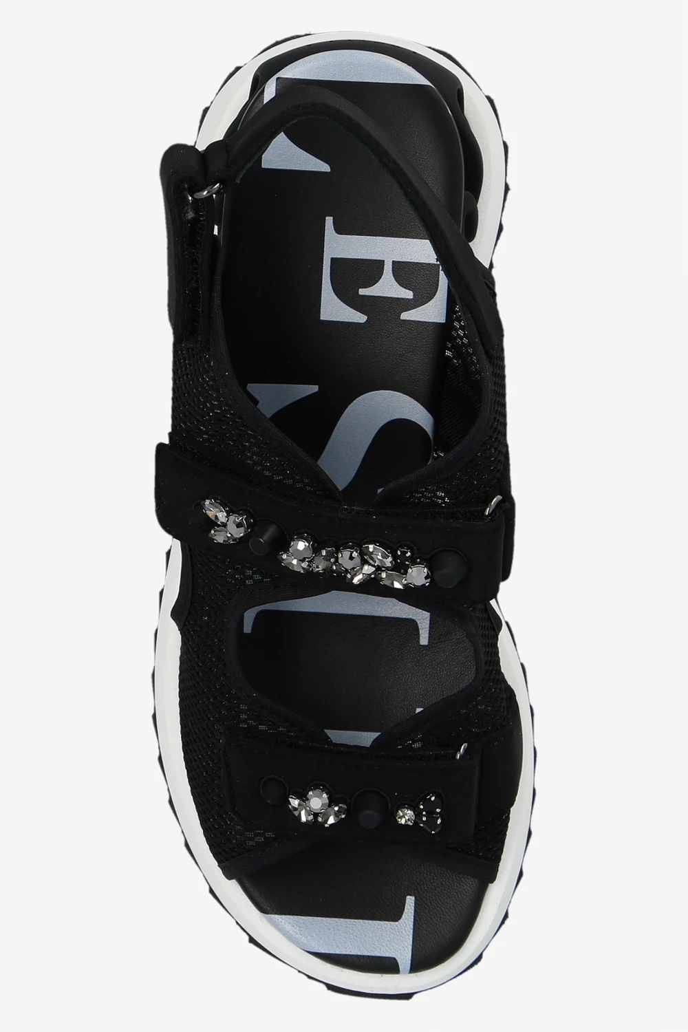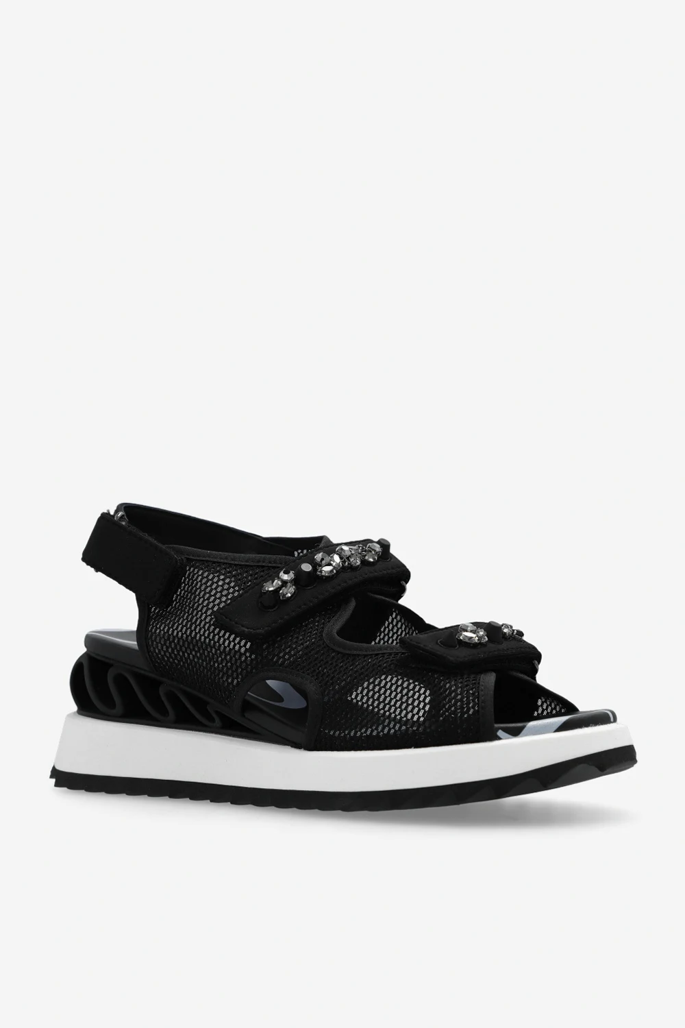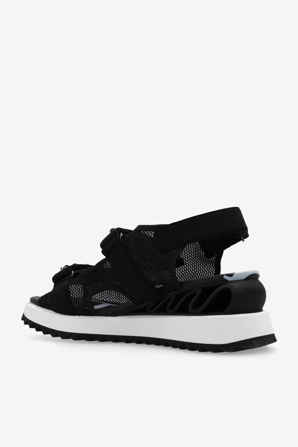 Czarne sandały na koturnie, model ‘Yui’ Le Silla. Wykonane z siatki i wykończone skórą. Zapinane na rzepy z przodu oraz z tyłu. Przód ozdobiony aplikacjami wykończonymi połyskującymi kamieniami. Koturn z dekoracyjną, falowaną wstawką. Biało-czarna, gumowa podeszwa.