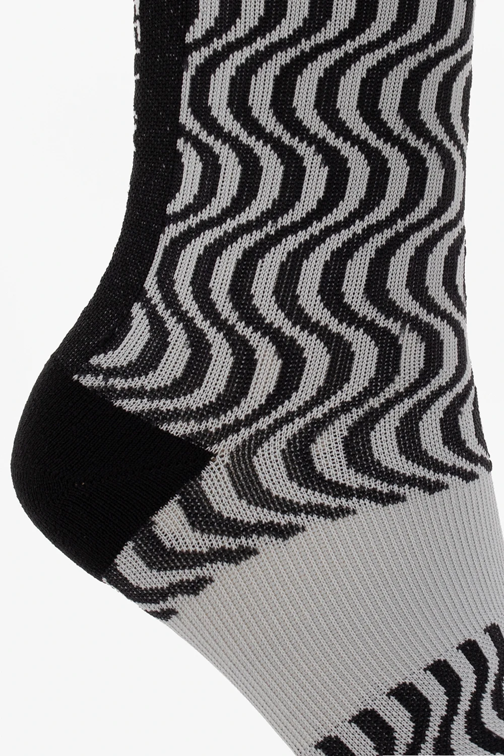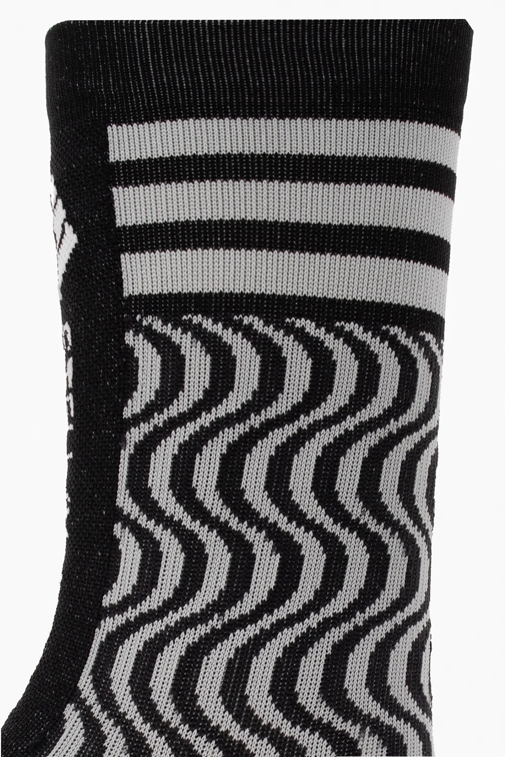 Czarno-szare skarpety ADIDAS by Stella McCartney. Wykonane z materiałów z recyklingu. Ozdobione wzorem oraz logo. Wykończone ściągaczem.