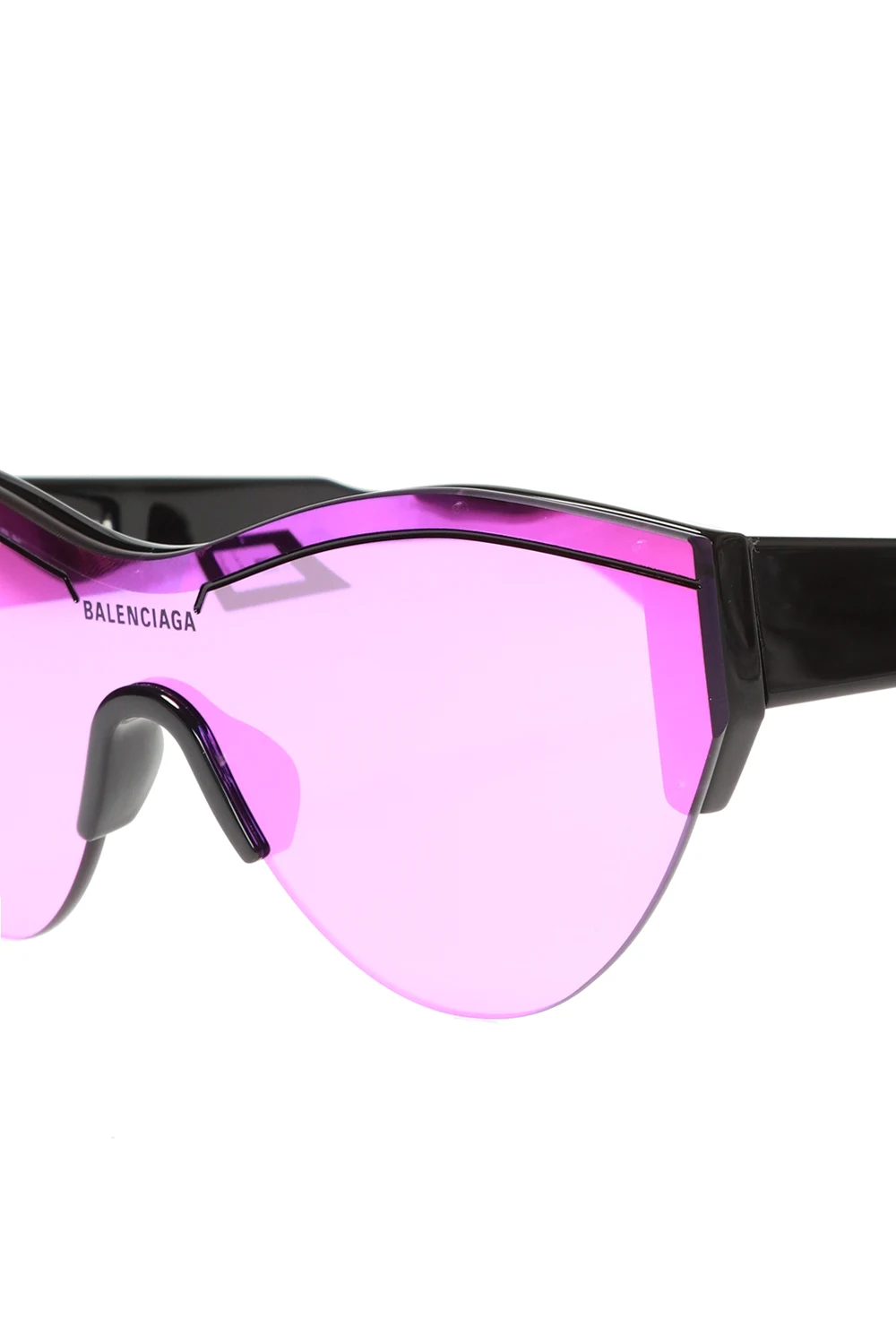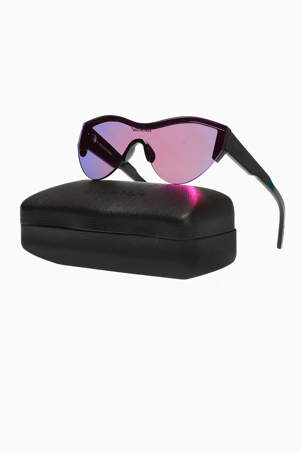 Czarne okulary przeciwsłoneczne, model ‘Ski Cat’ Balenciaga. Z przodu oraz z boku nadrukowane logo w kolorze białym. Fioletowe, certyfikowane soczewki 100% UVA/UVB. Dołączone etui.