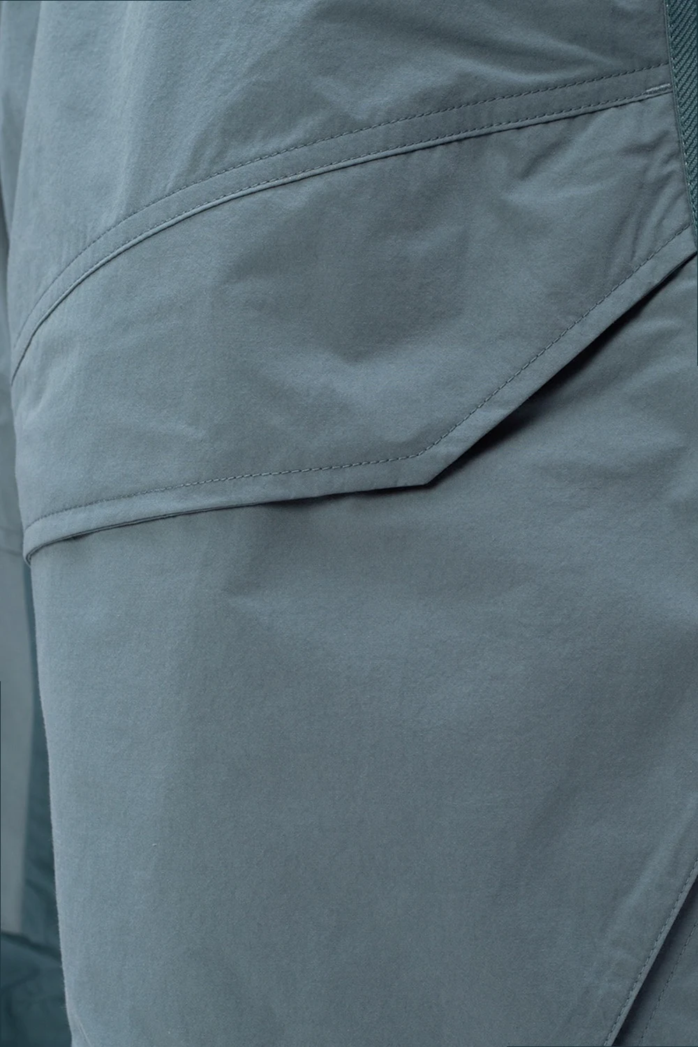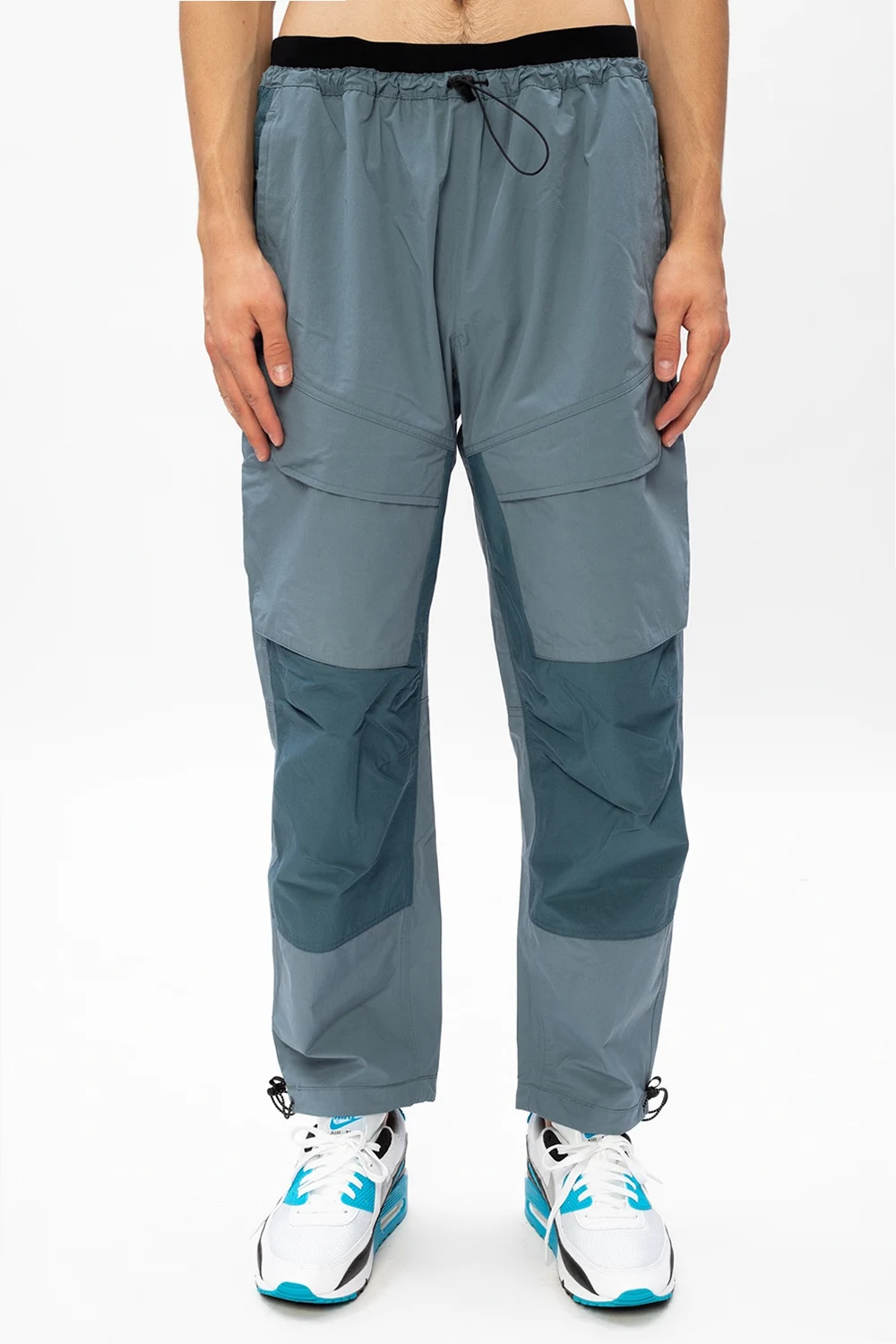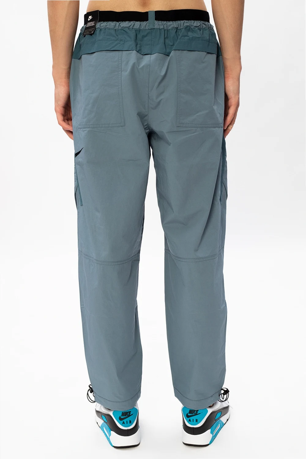 Niebieskie spodnie Nike, kolekcja ‘Tech Pack’. Ściągane trokami. Sześć kieszeni: dwie wsuwane z przodu, dwie z patkami z tyłu oraz dwie kieszenie typu ‘cargo’ z patkami zapinane na zatrzaski. Zwężane nogawki ściągane trokami.