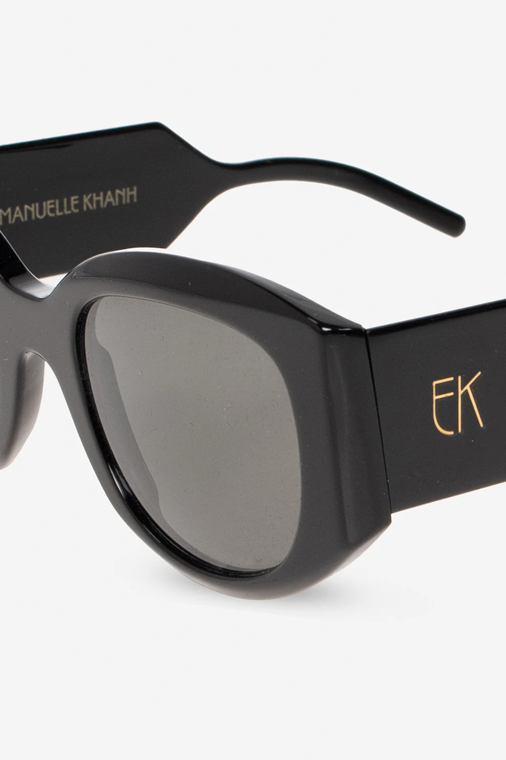 Czarne okulary przeciwsłoneczne Emmanuelle Khanh. Szerokie zauszniki ozdobione logo w kolorze złotym. Szare szkła ze 100% ochroną przed promieniowaniem UV. Wykonane ręcznie we Francji. Dołączone etui.