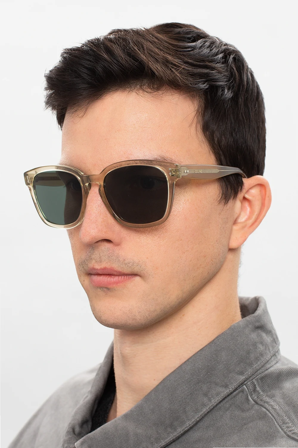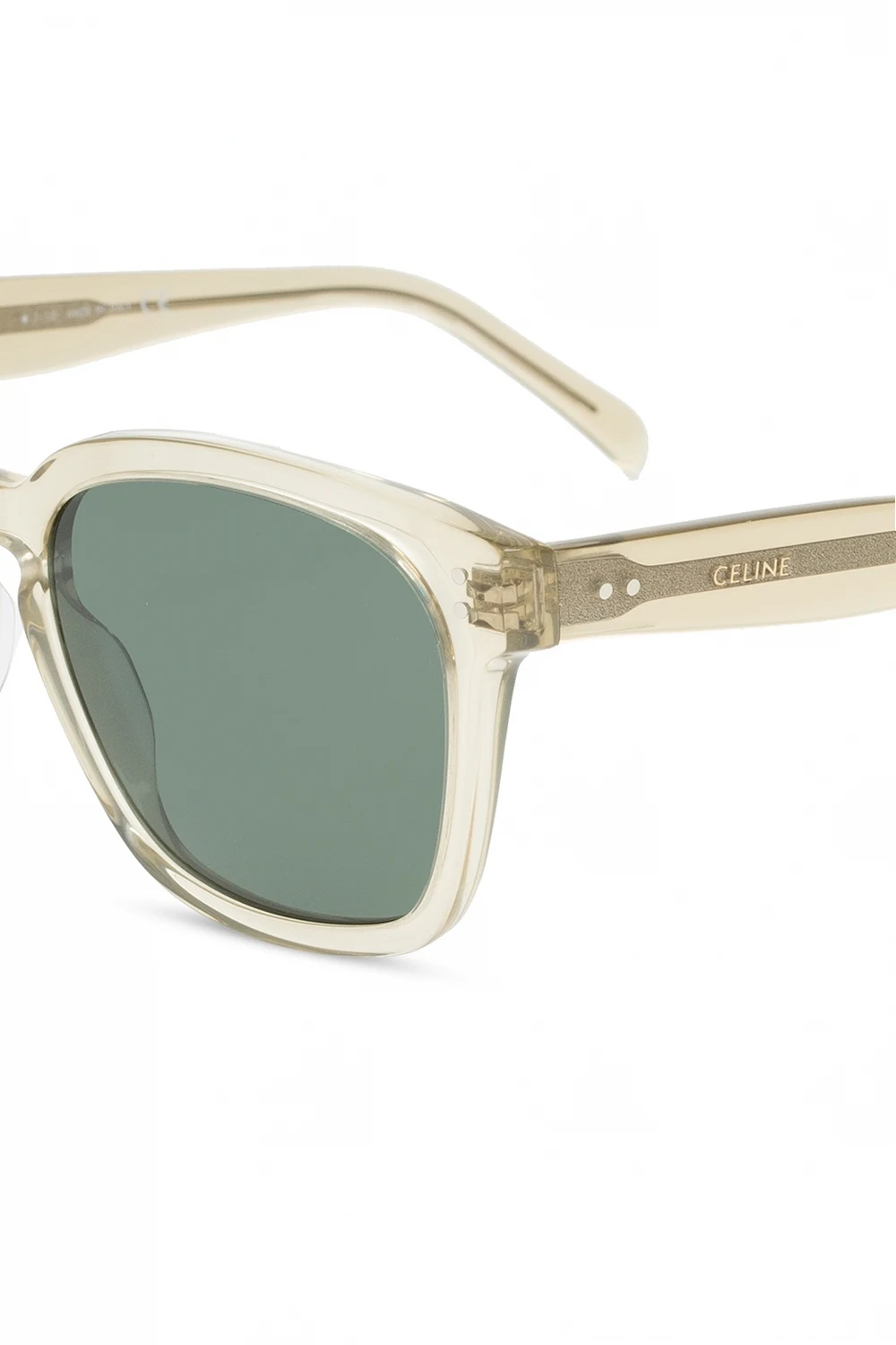Transparentne okulary przeciwsłoneczne Celine. Z boku nadrukowane logo w kolorze złotym. Czarne, certyfikowane soczewki UVA/UVB. Dołączone czarne etui z wytłoczonym logo.