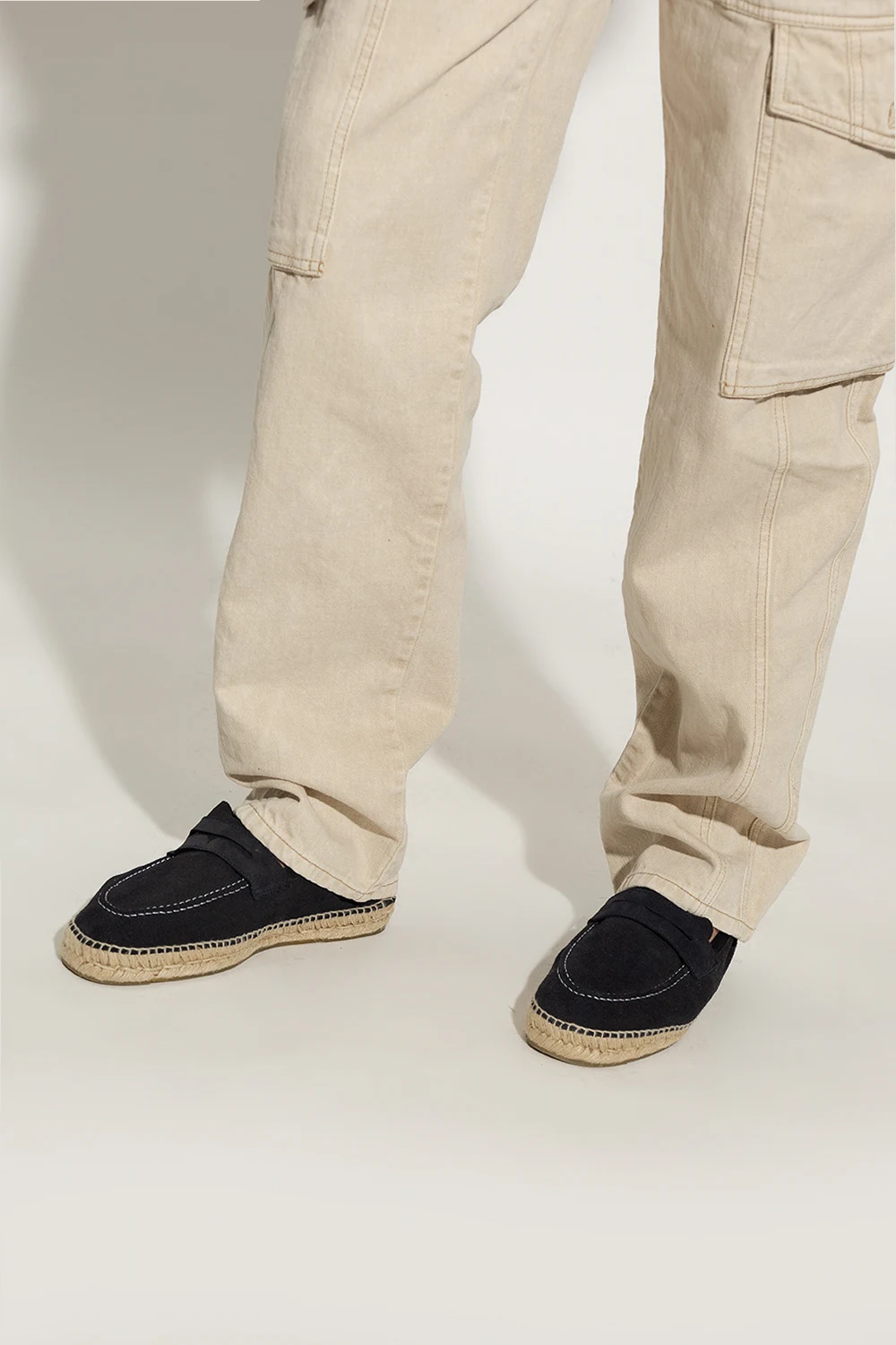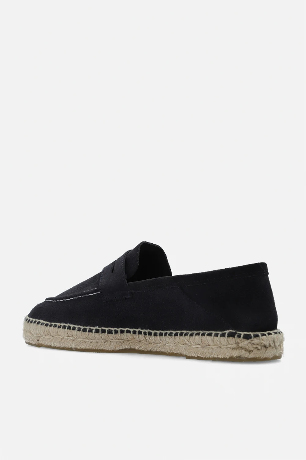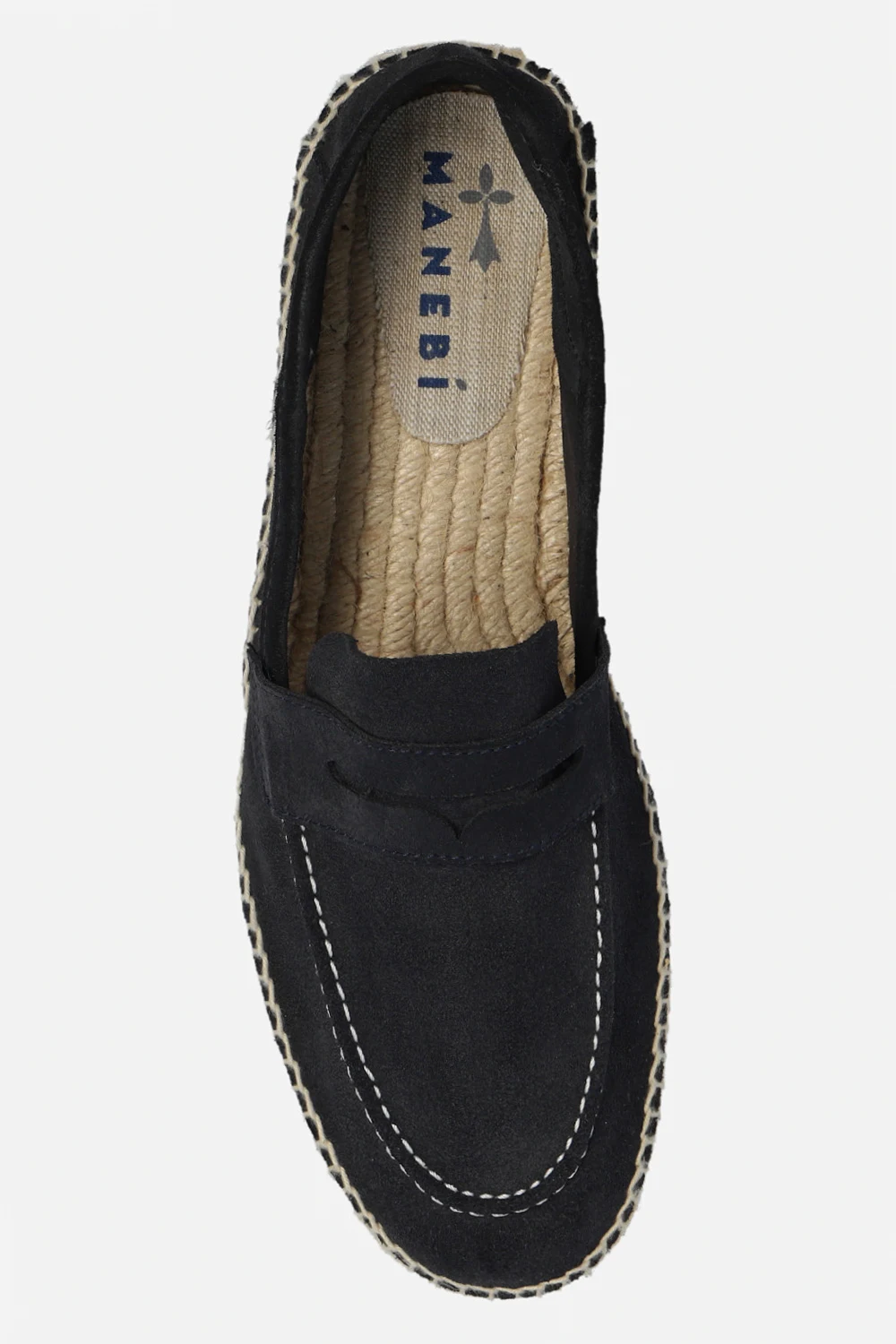 Granatowe buty, model ‘Plano’ Manebi. Wykonane ze skóry. Dekoracyjne wycięcie. Podeszwa wykonana z naturalnej juty wykończonej cienką warstwą kauczuku w kolorze beżowym.