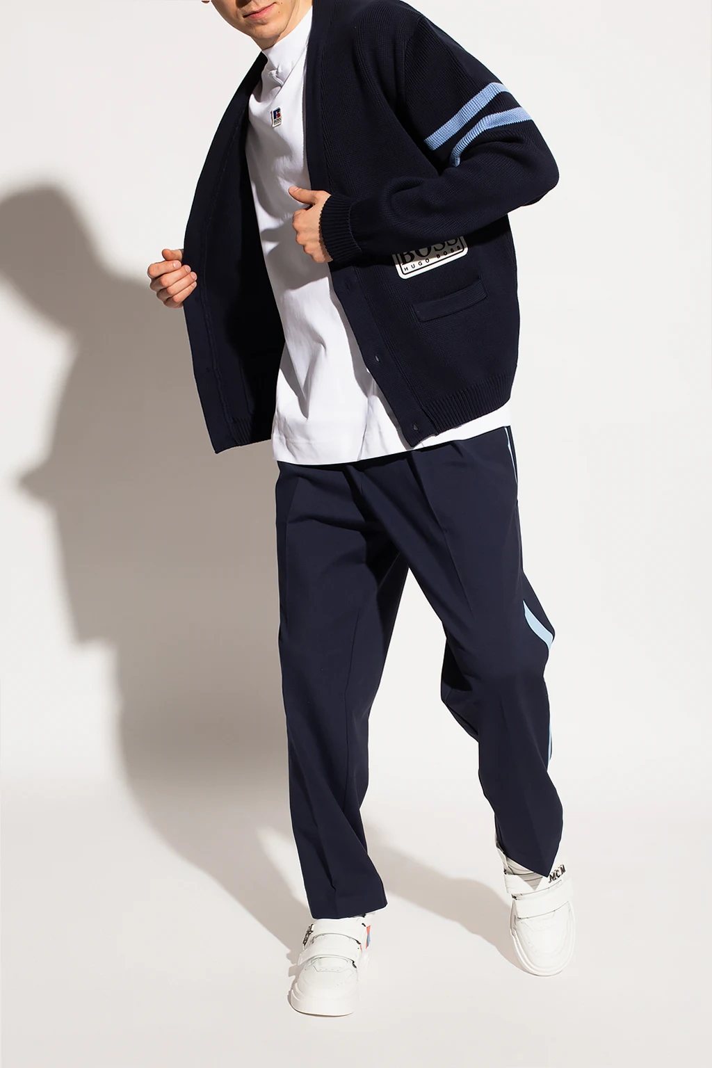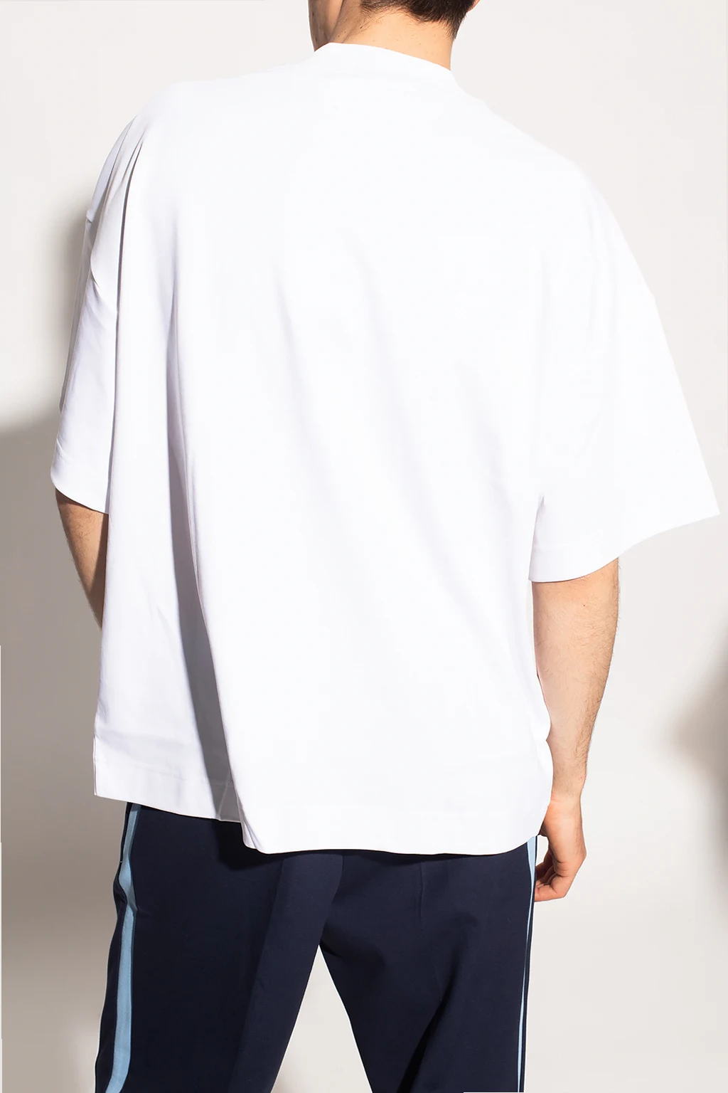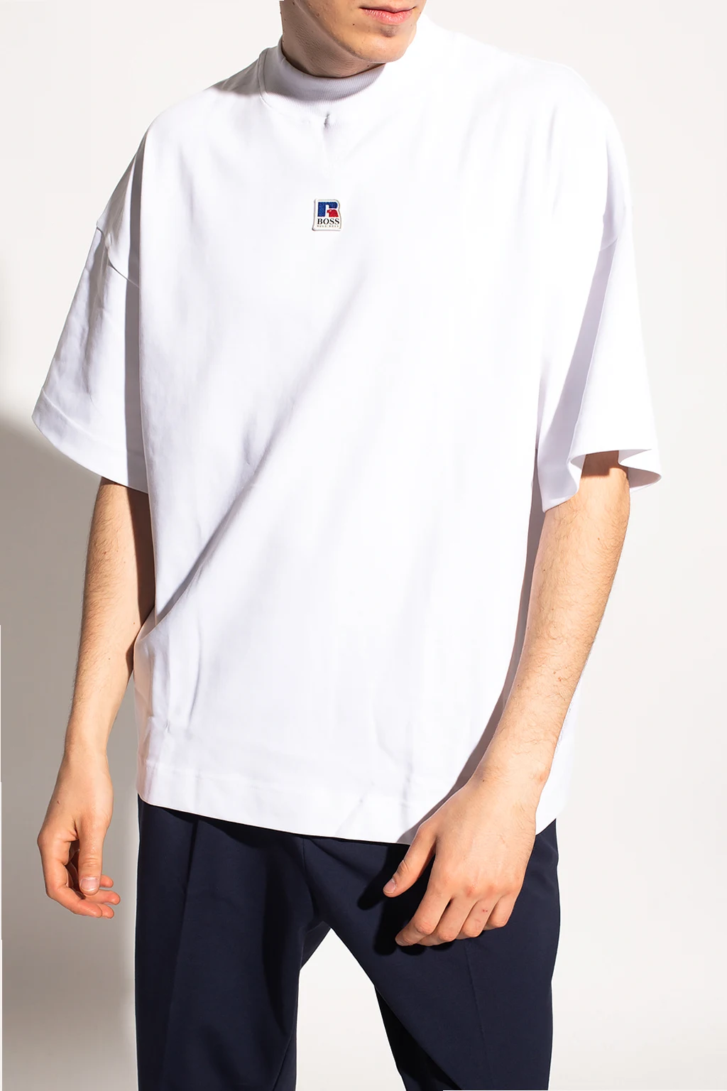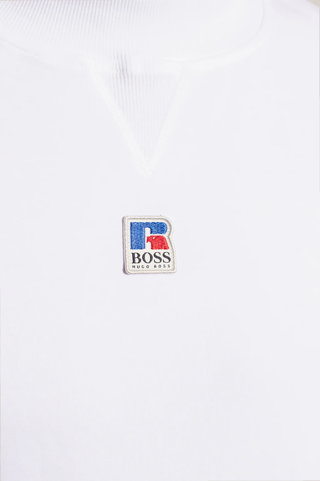 Biały, bawełniany t-shirt typu ‘oversize’ BOSS x Russell Athletic. Ozdobiony naszywką z logo w w kolorach białym, niebieskim oraz czerwonym. Okrągły dekolt. Kolaboracja prezentuje odważne, ponadczasowe klasyki, które łączą luźne kroje, sportowe detale i inspirowaną stylem retro paletę kolorów.