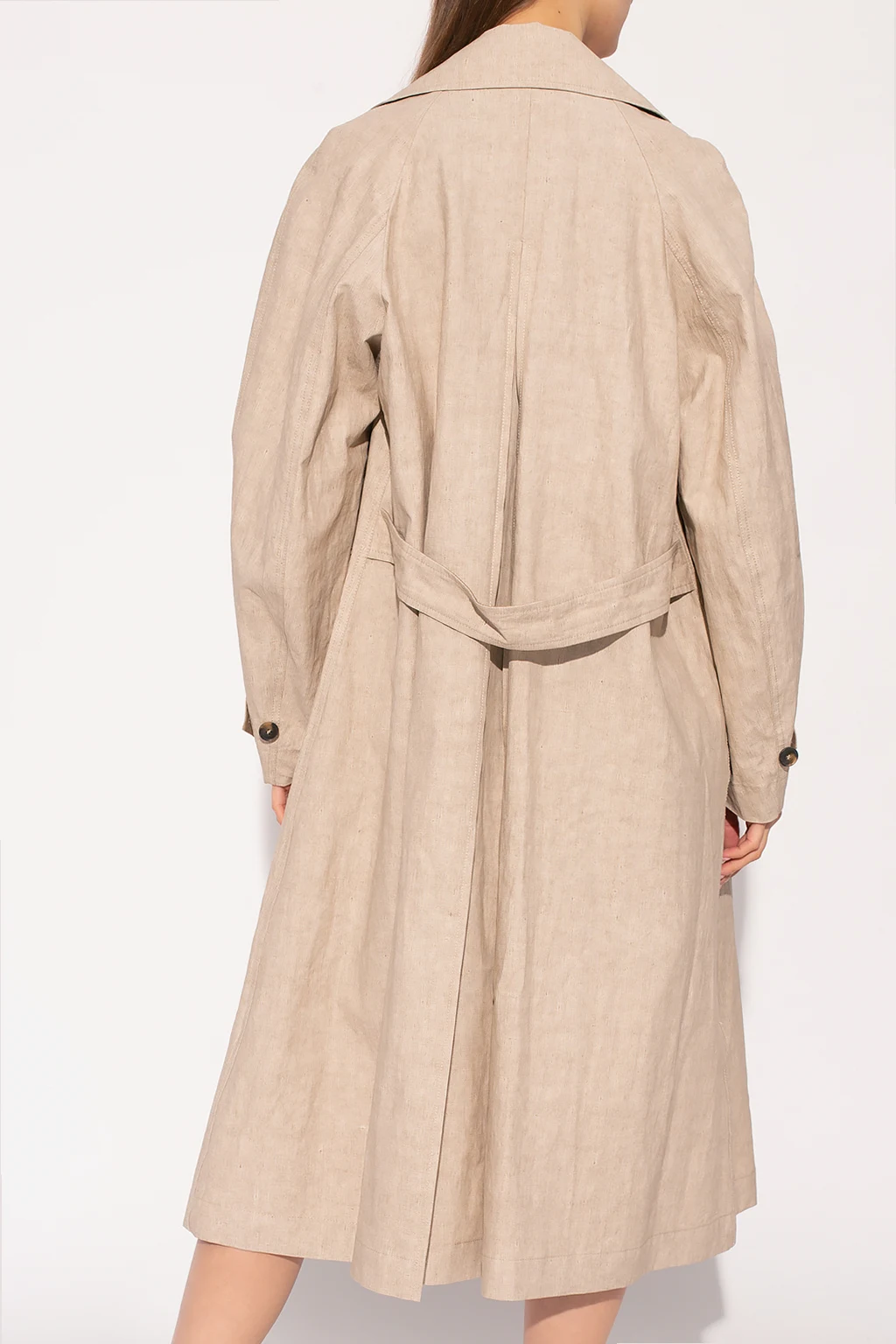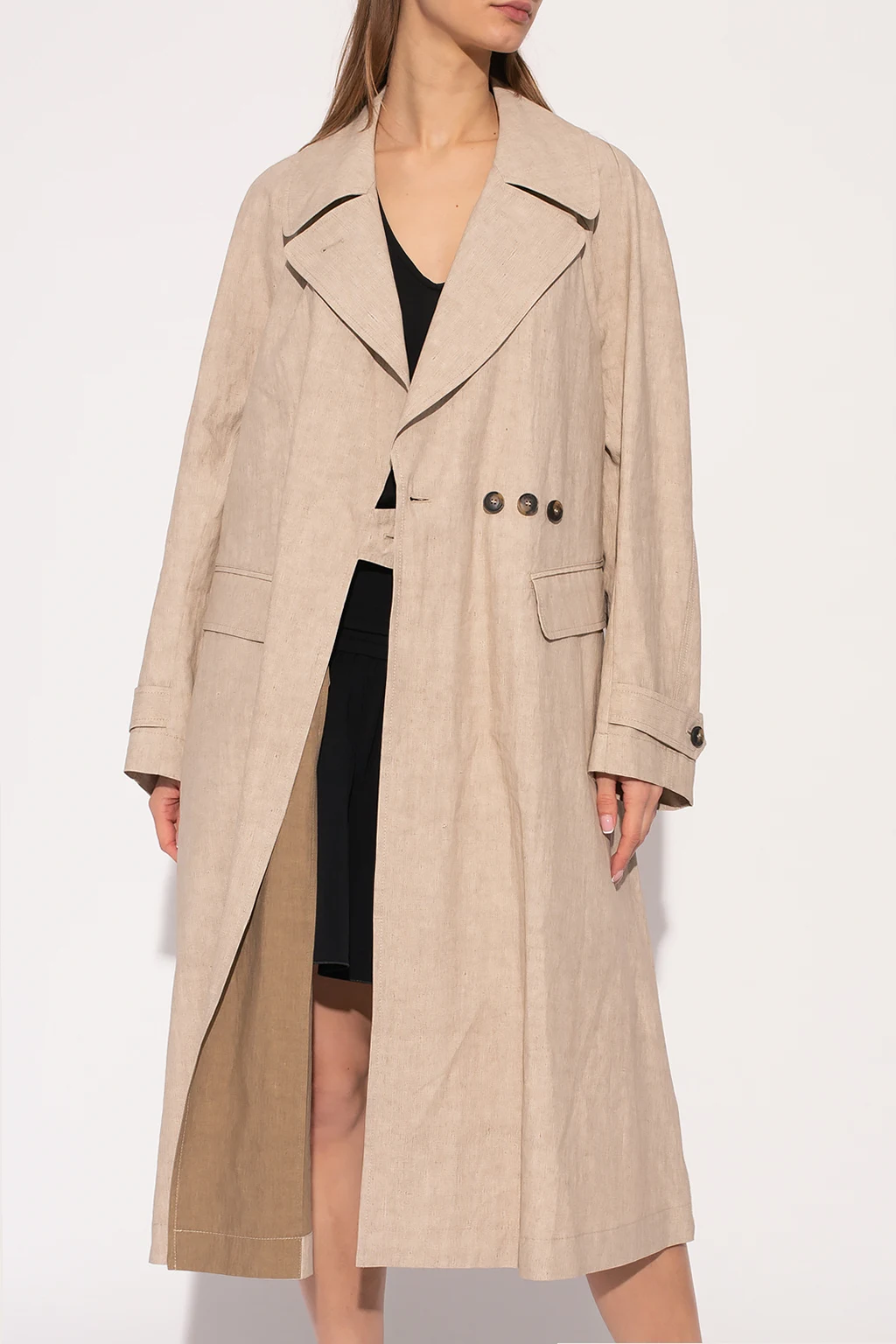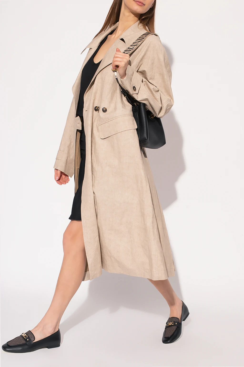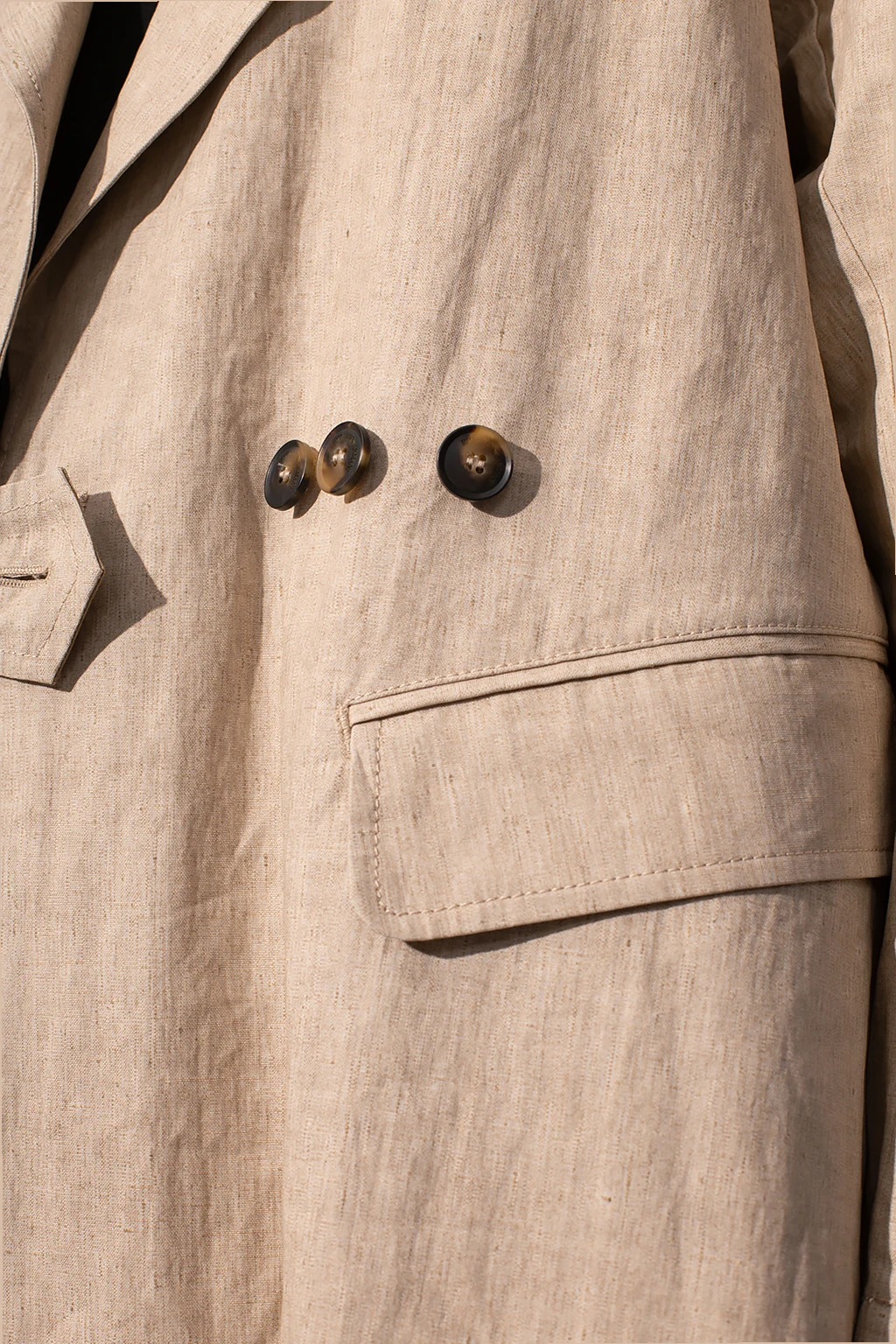 Beżowy, lniany płaszcz Emporio Armani, kolekcja 'ICON'. Zapinany na guziki. Dwie kieszenie z patkami. Otwarte klapy. Długie rękawy zakończone zapięciem na guziki.